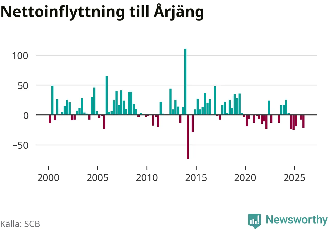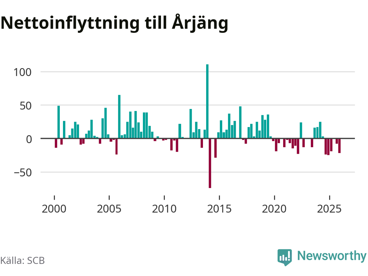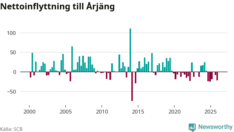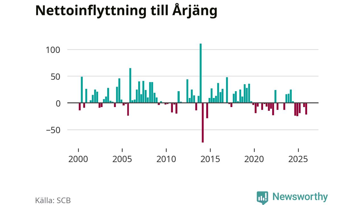 Under fjärde kvartalet 2025 flyttade 62 personer till kommunen medan 84 personer flyttade därifrån. Det är historiskt sett en liten inflyttning under ett kvartal. Sedan seklets början har Årjäng haft ungefär lika många kvartal med positivt flyttnetto som negativt.