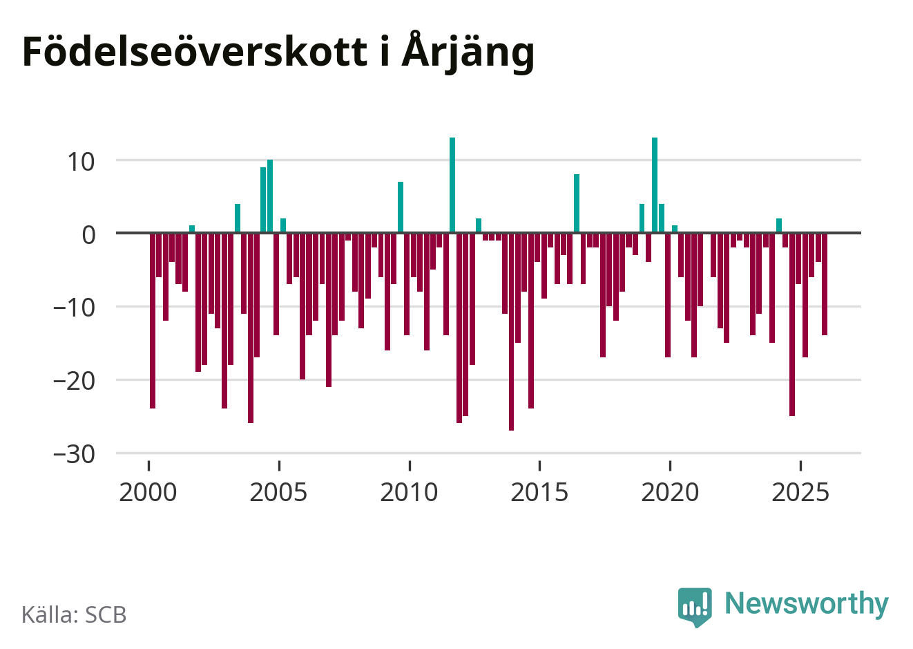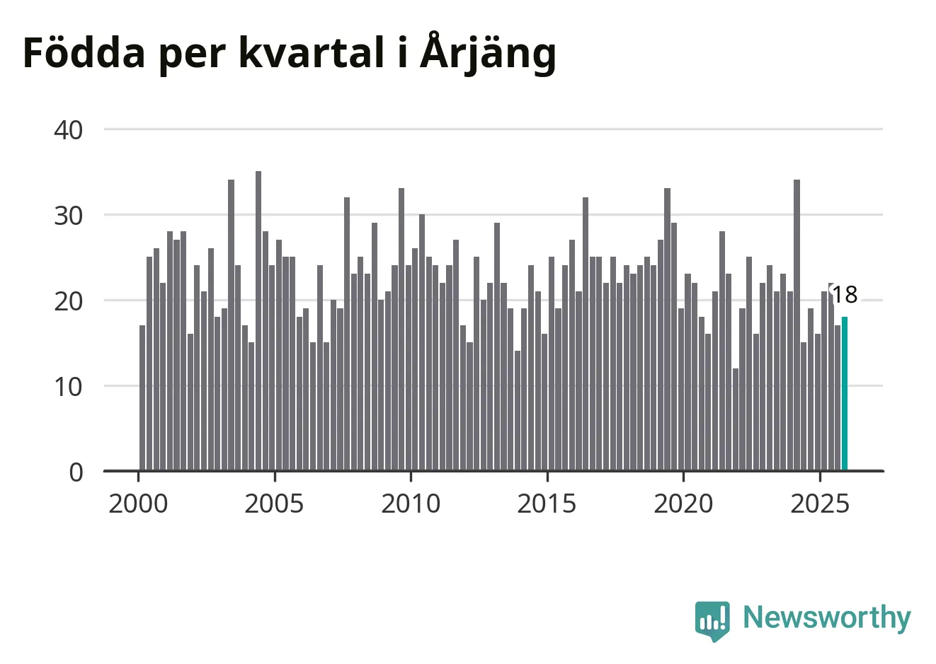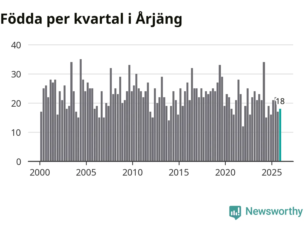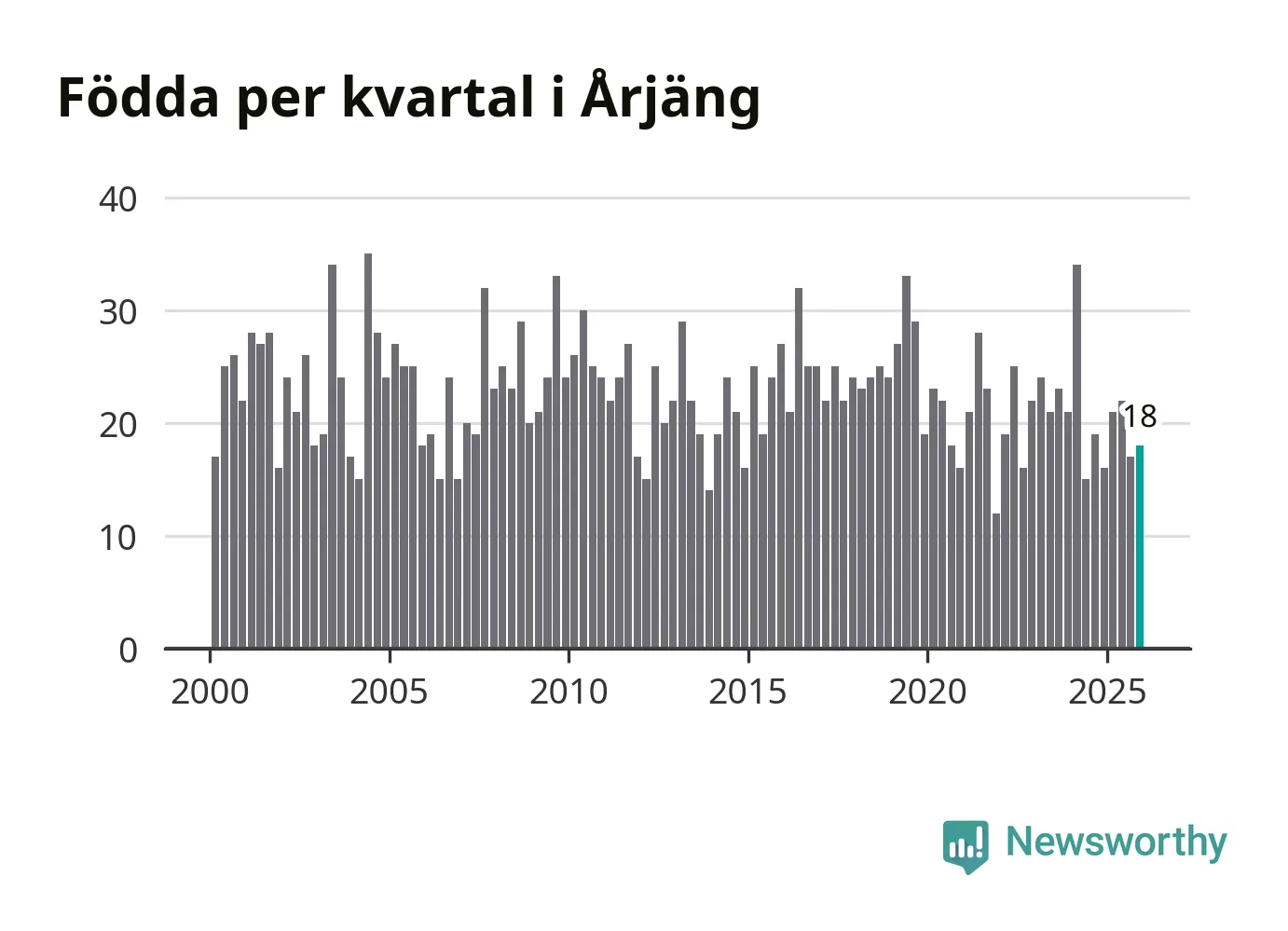 Enligt SCB:s siffror föddes 18 barn i Årjäng under det senaste kvartalet. Samtidigt avled 32 personer. Årjäng hade alltså ett negativt födelsenetto, vilket kommunen historiskt sett oftast har haft.