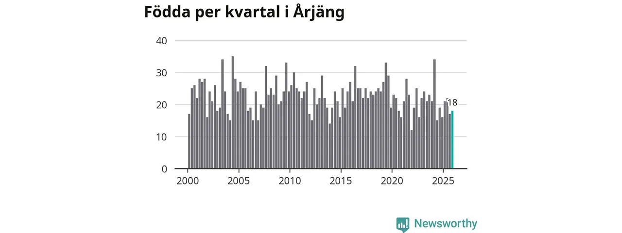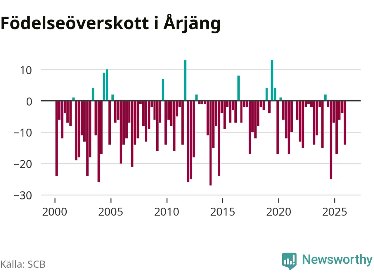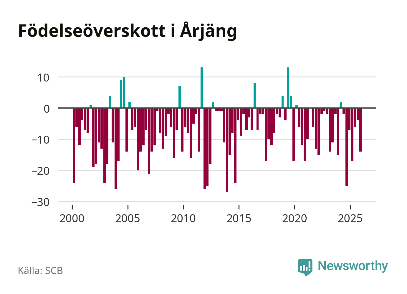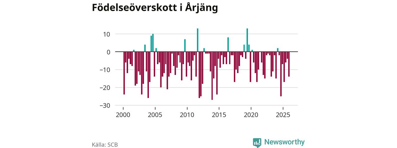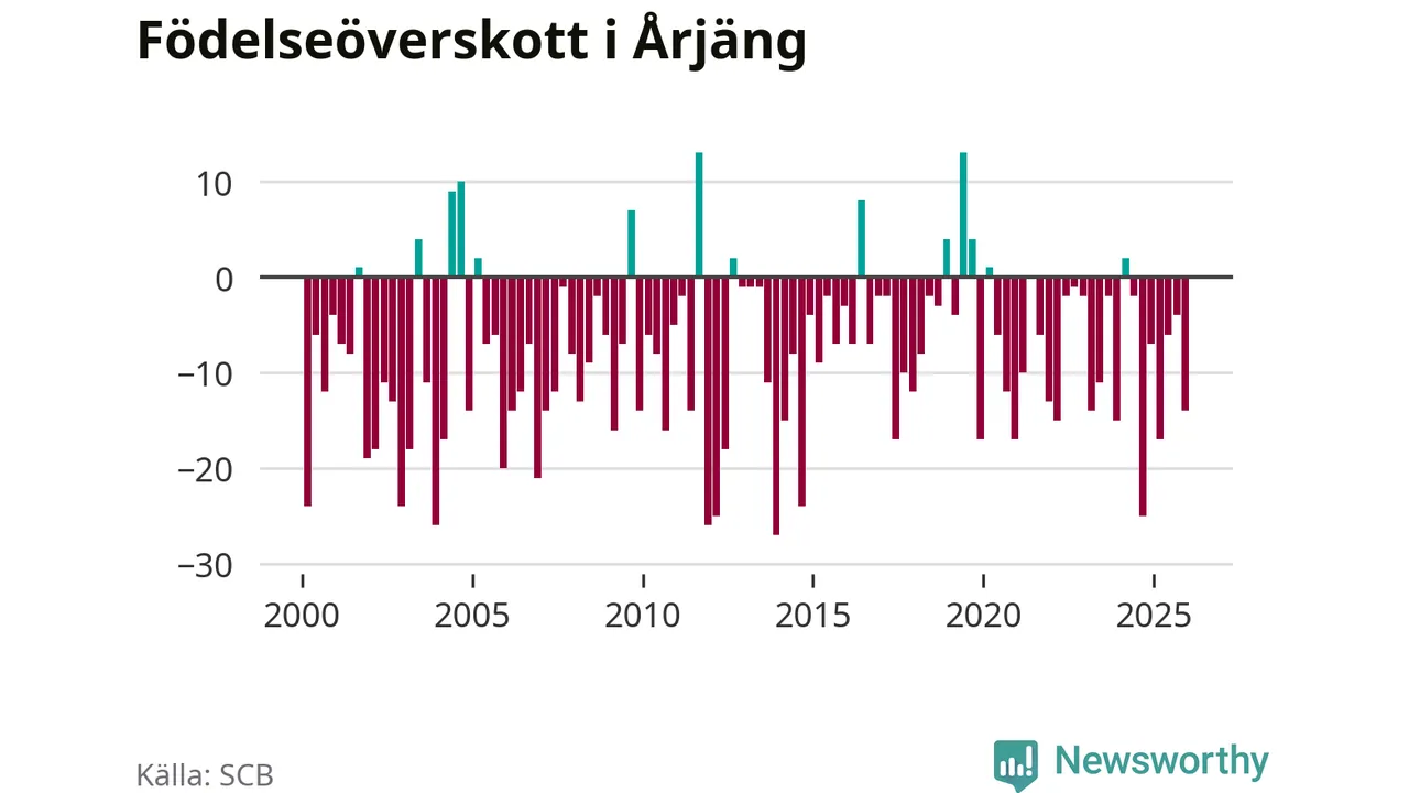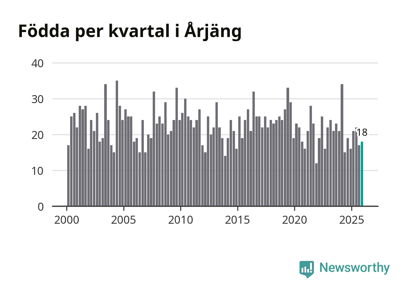 Enligt SCB:s siffror föddes 18 barn i Årjäng under det senaste kvartalet. Samtidigt avled 32 personer. Årjäng hade alltså ett negativt födelsenetto, vilket kommunen historiskt sett oftast har haft.