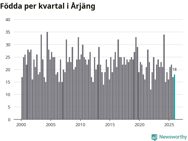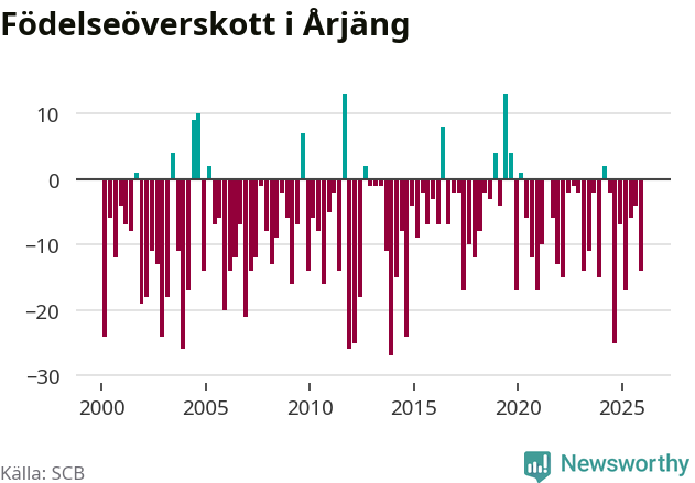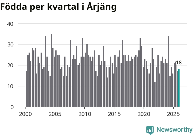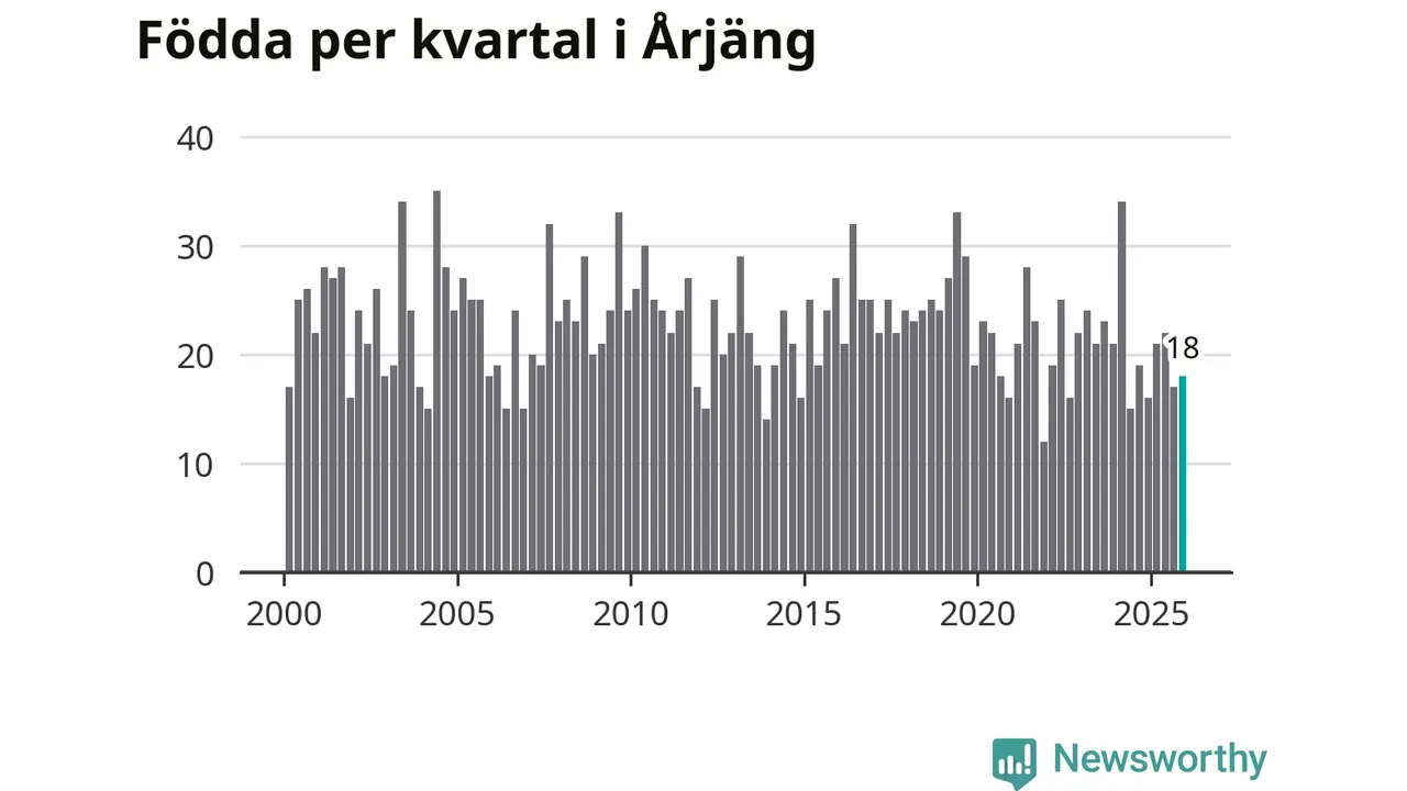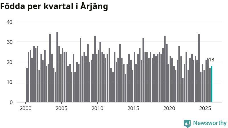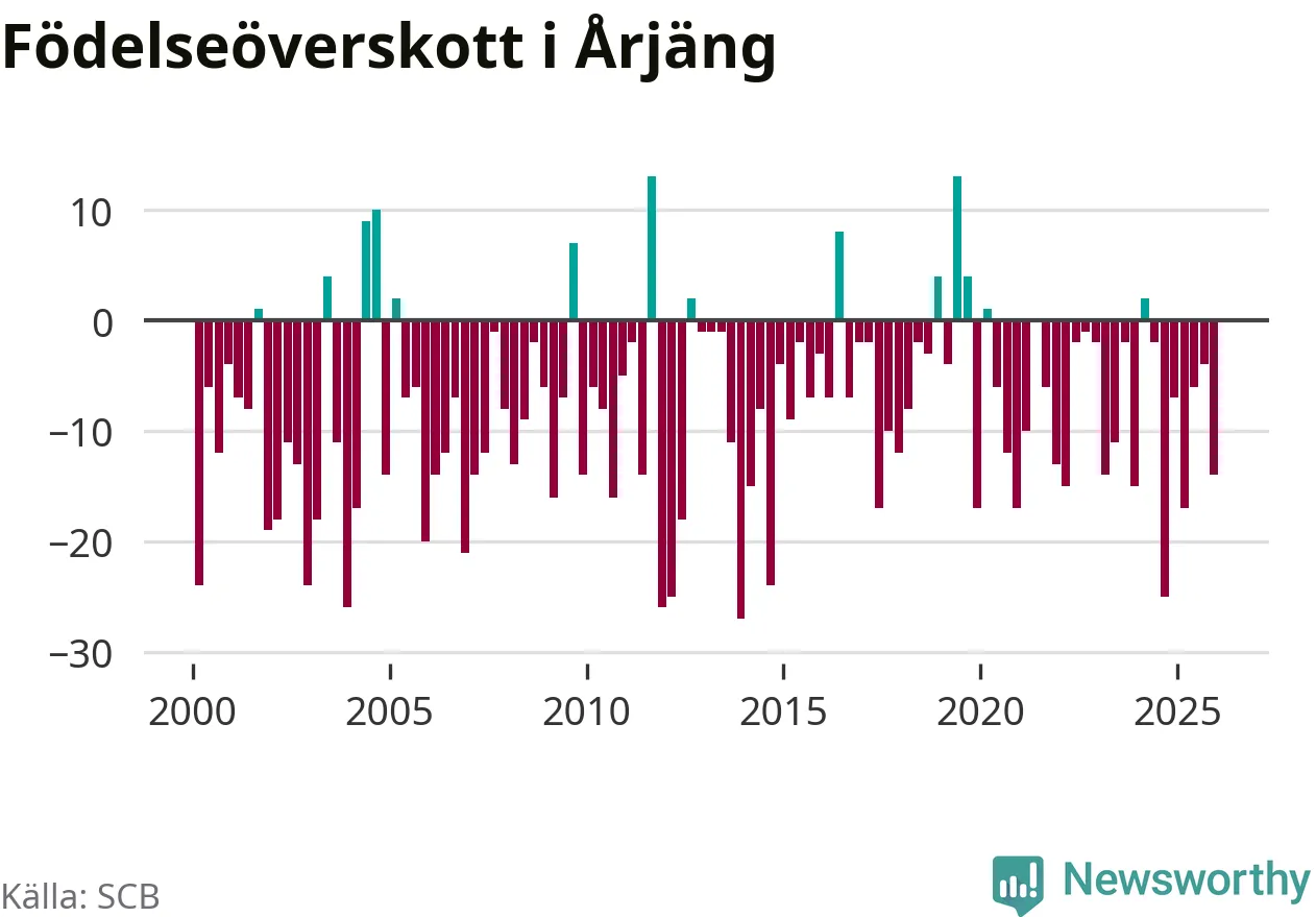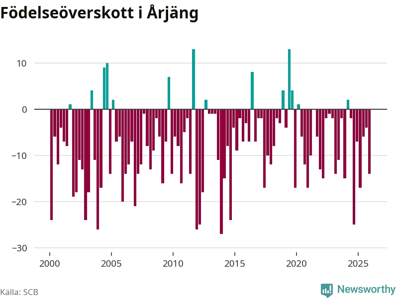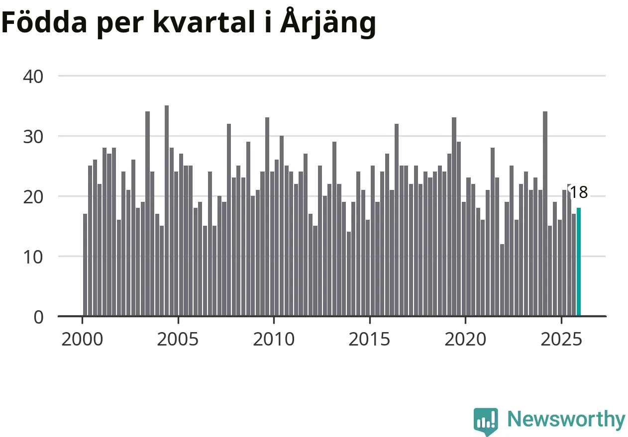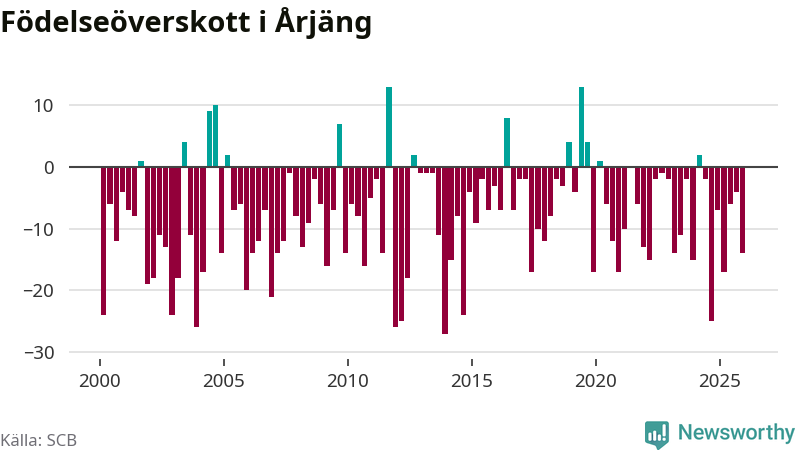 Enligt SCB:s siffror föddes 18 barn i Årjäng under det senaste kvartalet. Samtidigt avled 32 personer. Årjäng hade alltså ett negativt födelsenetto, vilket kommunen historiskt sett oftast har haft.