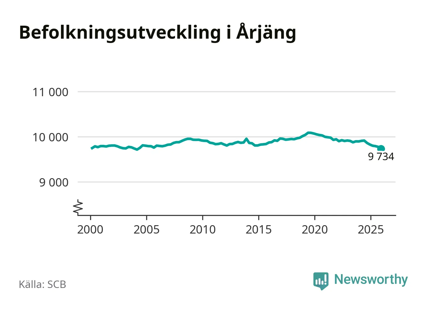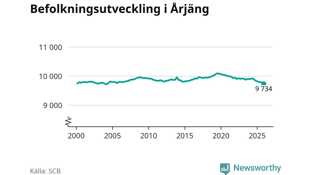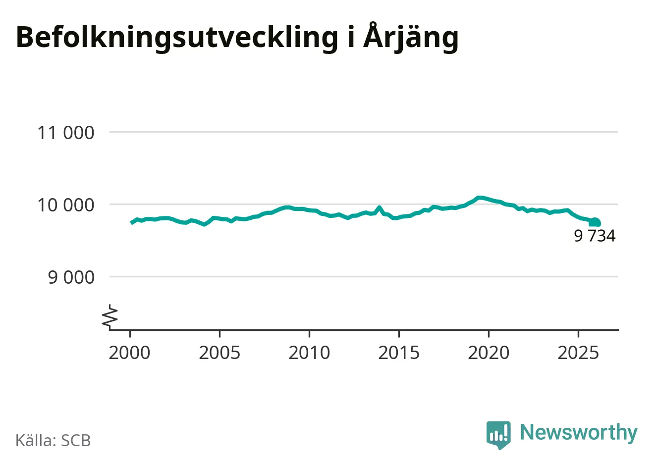 Befolkningen minskade i Årjängs kommun under det fjärde kvartalet 2025. Den 31 december bodde enligt SCB:s senaste siffror 9 734 personer i kommunen, vilket är 39 färre än i slutet av tredje kvartalet.