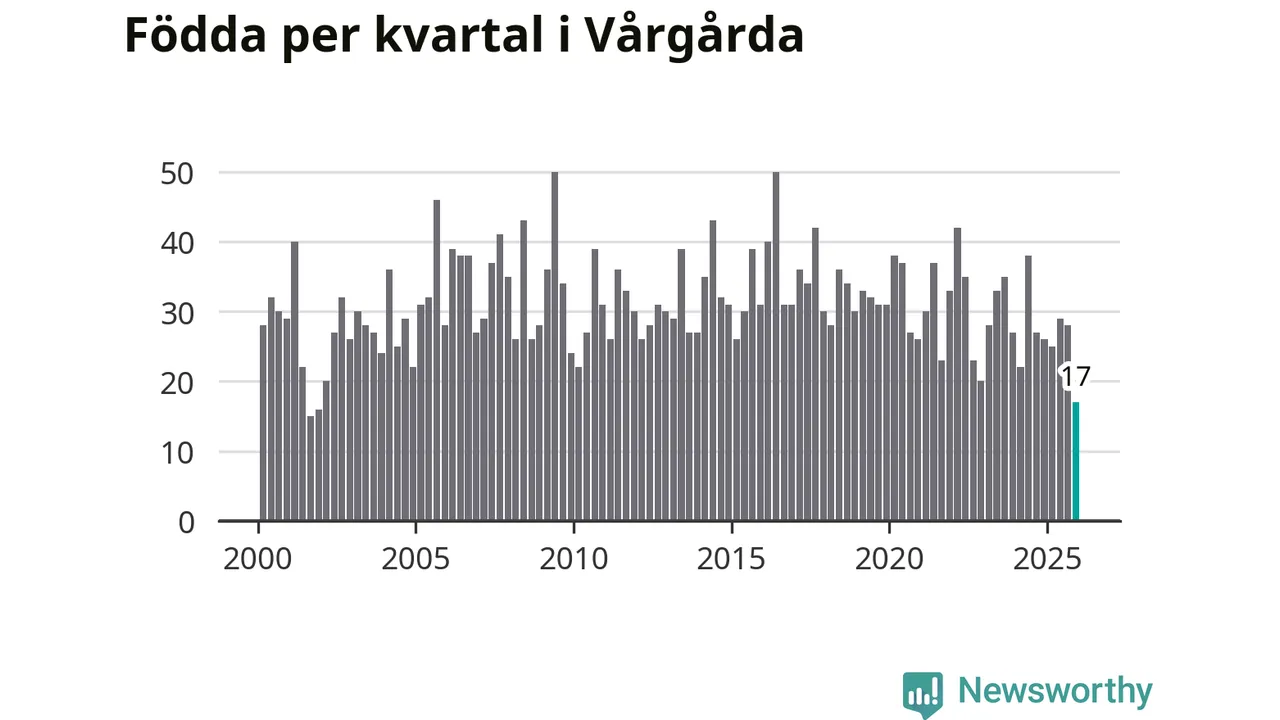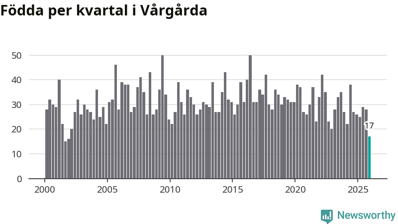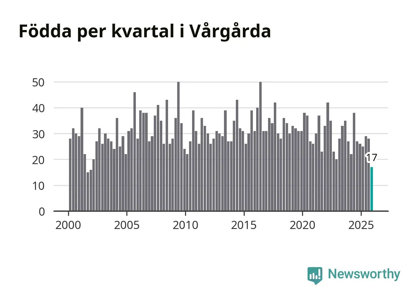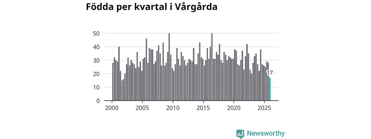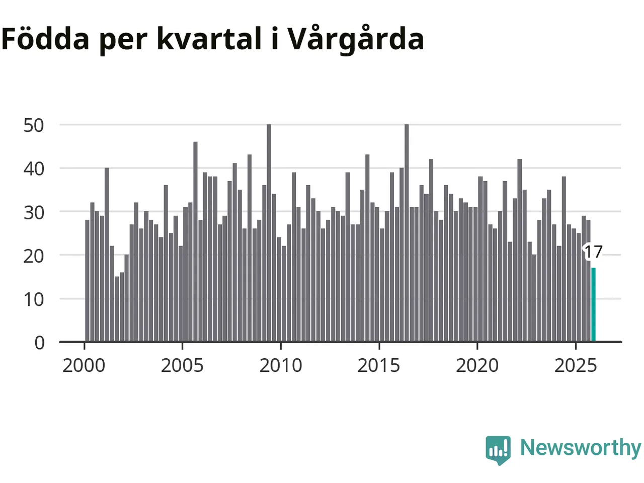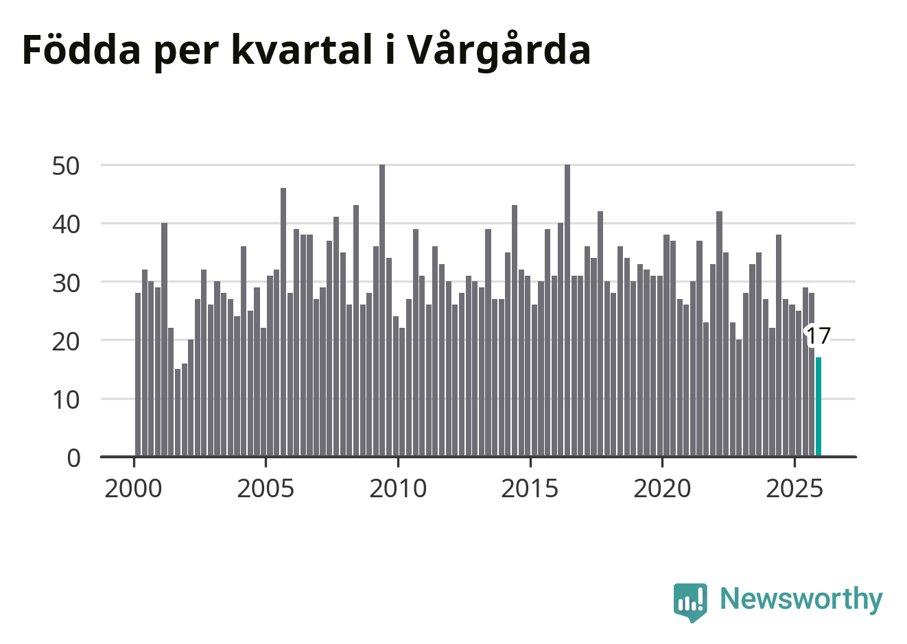 Enligt SCB:s siffror föddes 17 barn i Vårgårda under det senaste kvartalet. Samtidigt avled relativt många – 33 personer. Vårgårda hade alltså ett negativt födelsenetto under fjärde kvartalet. Historiskt har dock födelsenettot oftast varit positivt.