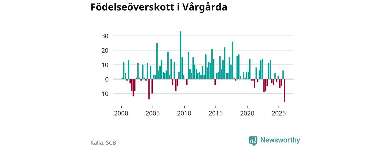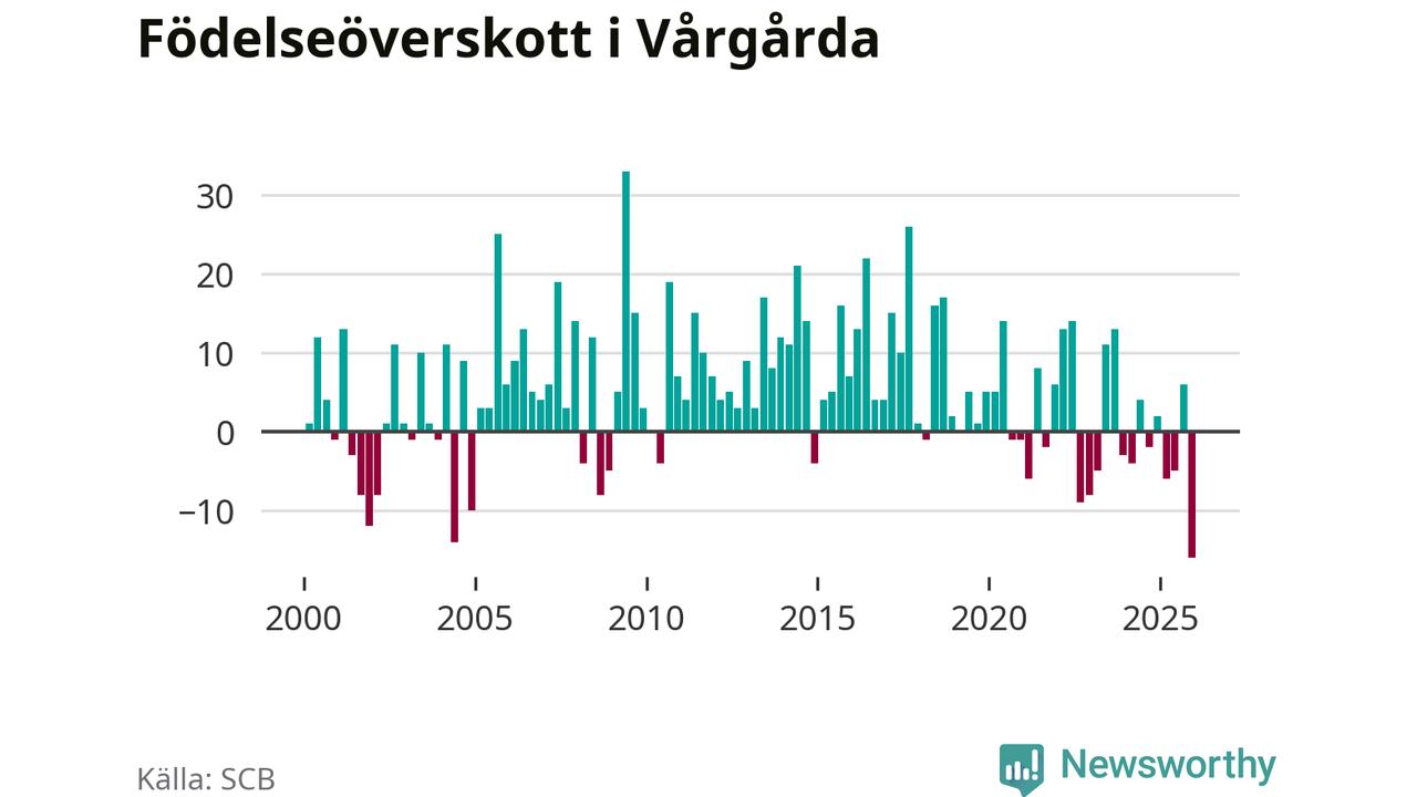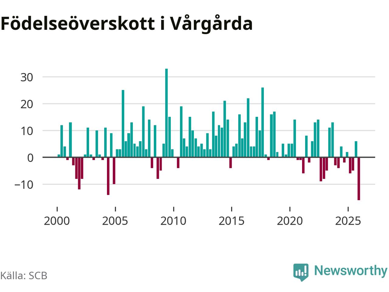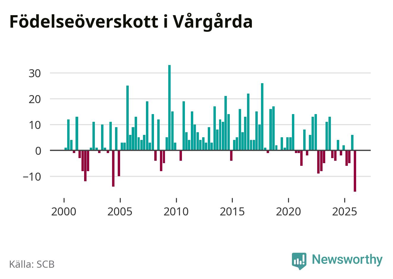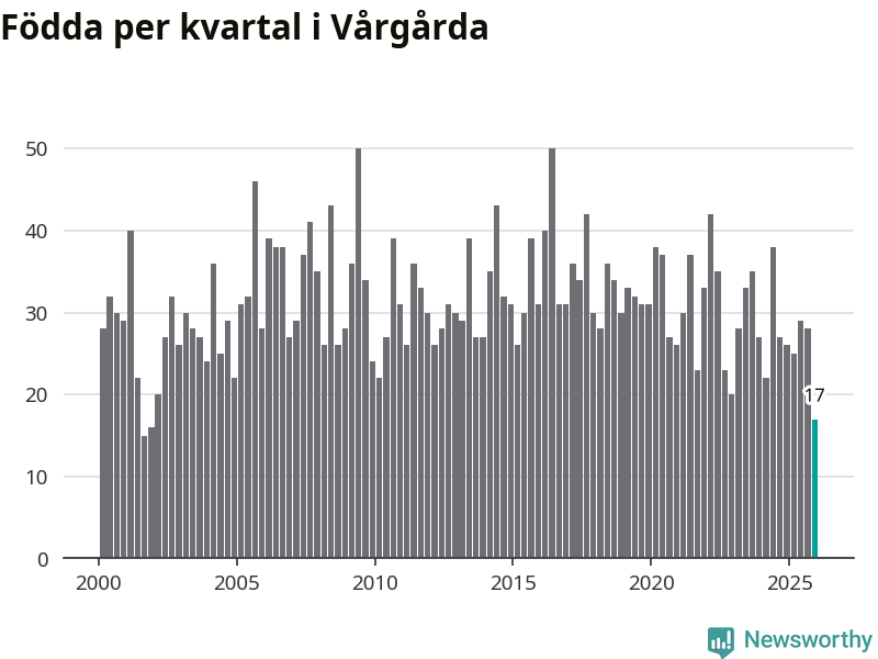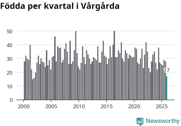 Enligt SCB:s siffror föddes 17 barn i Vårgårda under det senaste kvartalet. Samtidigt avled relativt många – 33 personer. Vårgårda hade alltså ett negativt födelsenetto under fjärde kvartalet. Historiskt har dock födelsenettot oftast varit positivt.