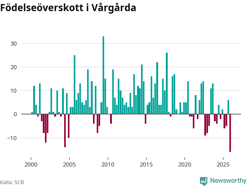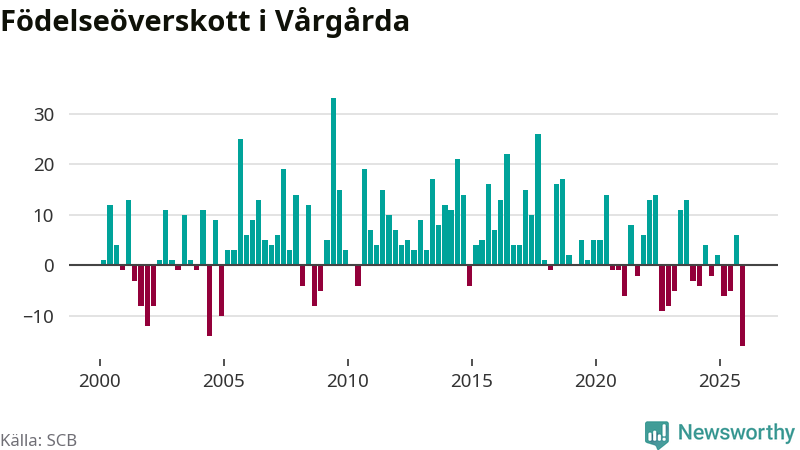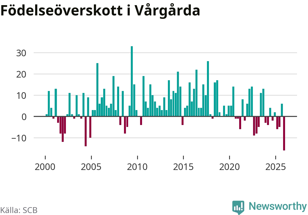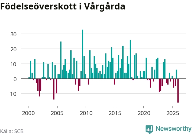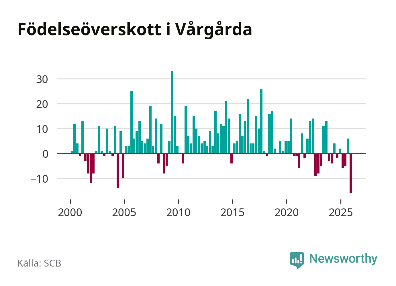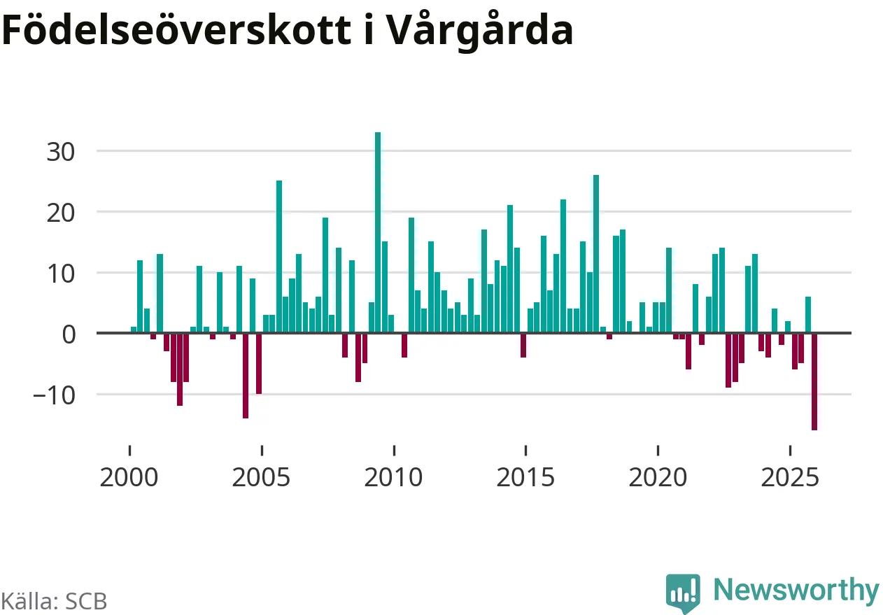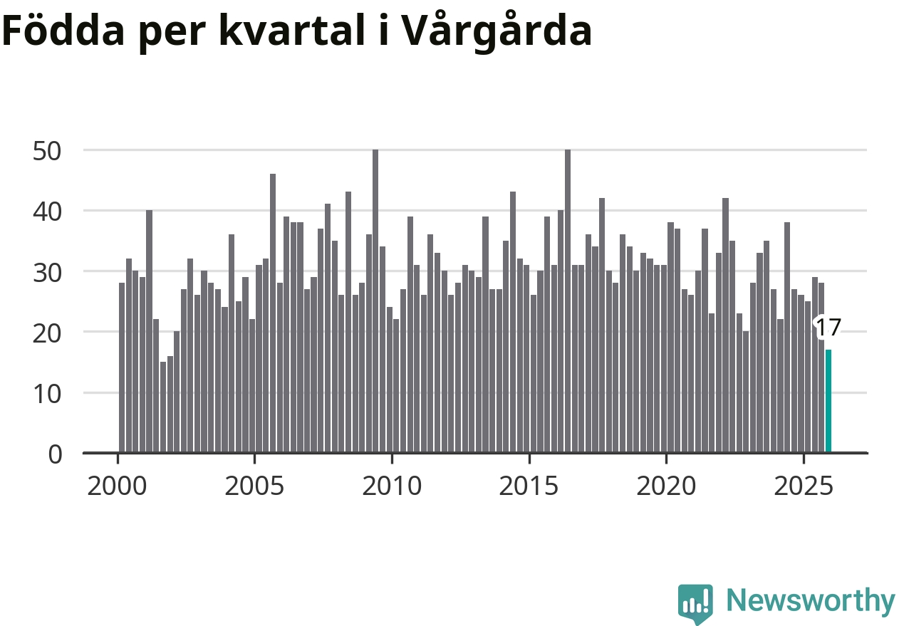 Enligt SCB:s siffror föddes 17 barn i Vårgårda under det senaste kvartalet. Samtidigt avled relativt många – 33 personer. Vårgårda hade alltså ett negativt födelsenetto under fjärde kvartalet. Historiskt har dock födelsenettot oftast varit positivt.