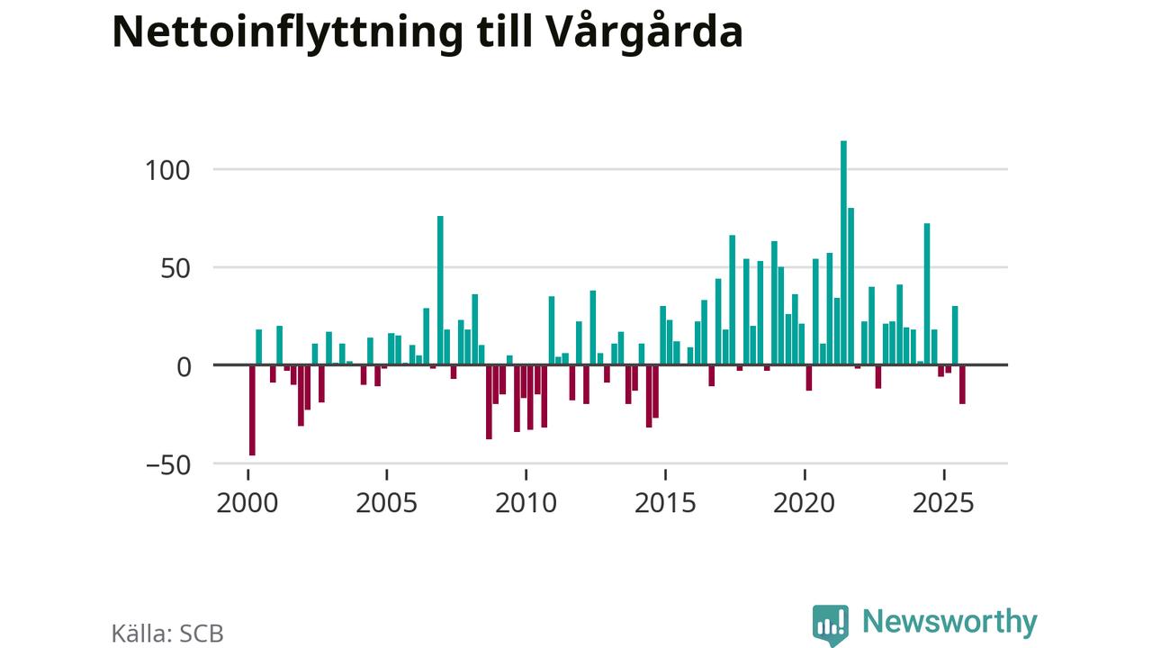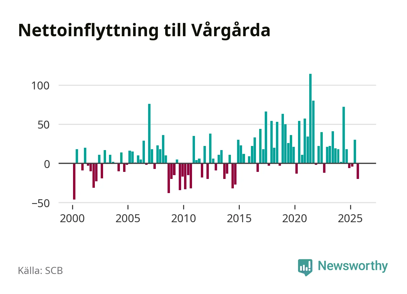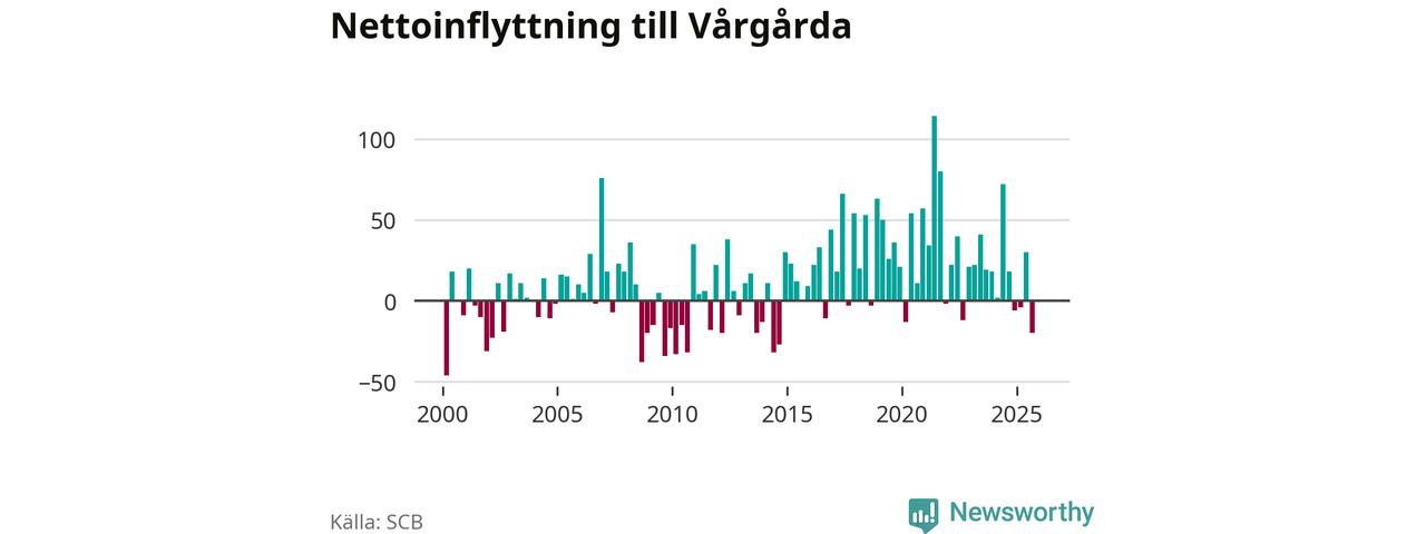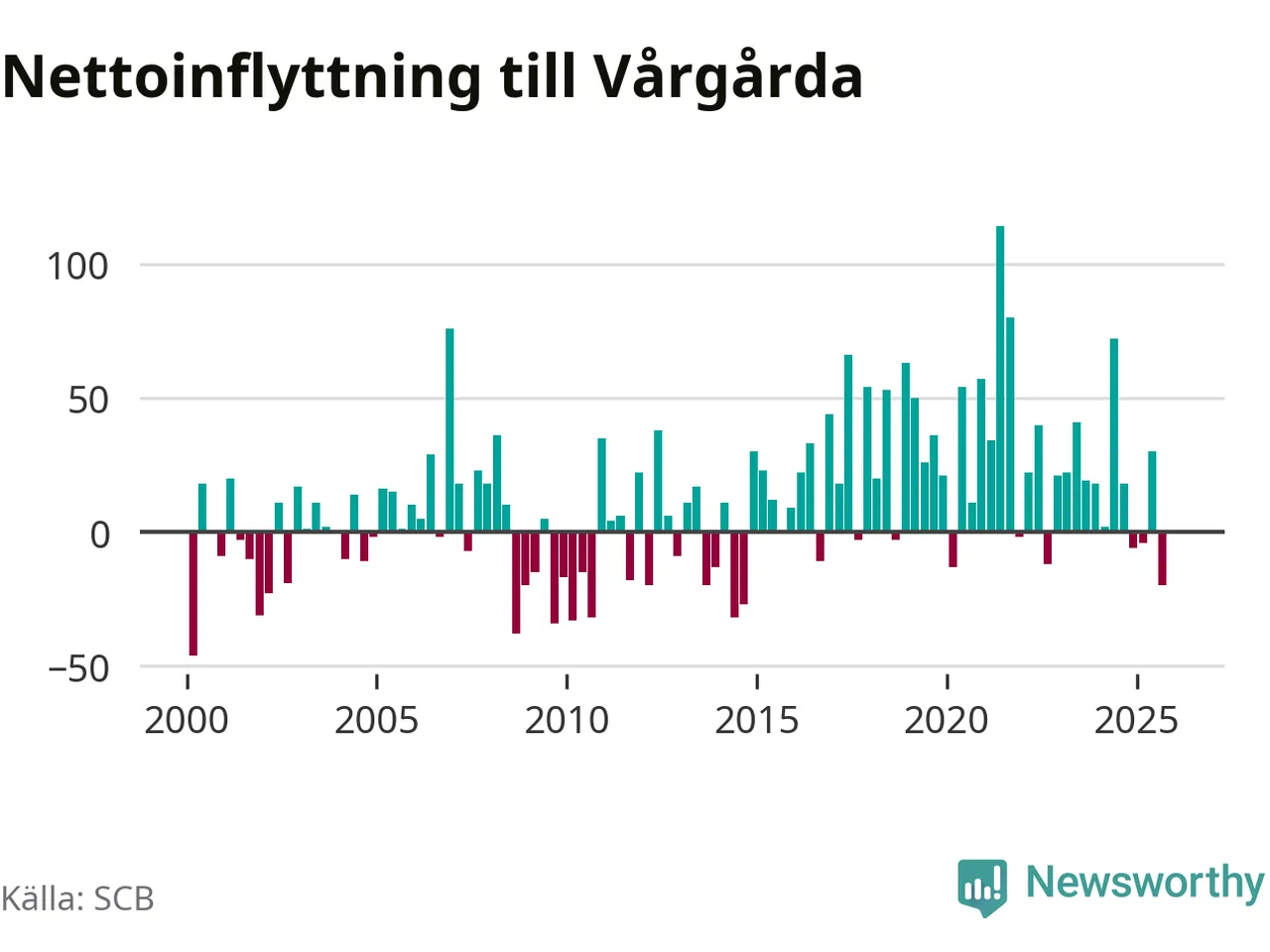 Under fjärde kvartalet 2025 flyttade 178 personer till kommunen samtidigt som lika många flyttade därifrån. Det är historiskt sett en stor utflyttning under ett kvartal. Sedan seklets början har Vårgårda oftast haft ett positivt flyttnetto.