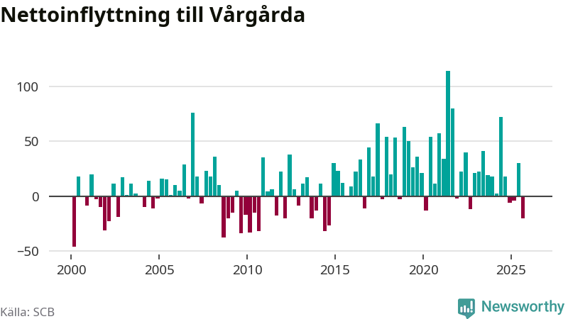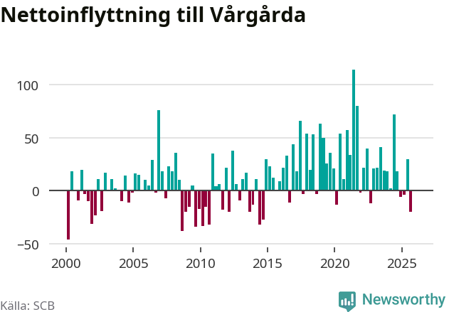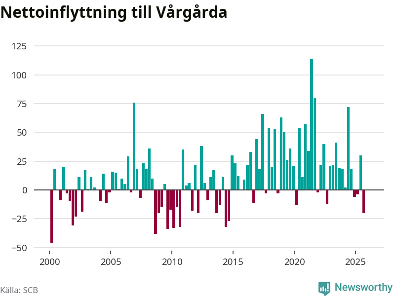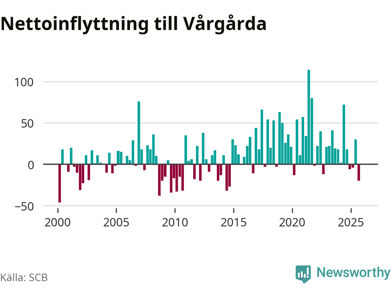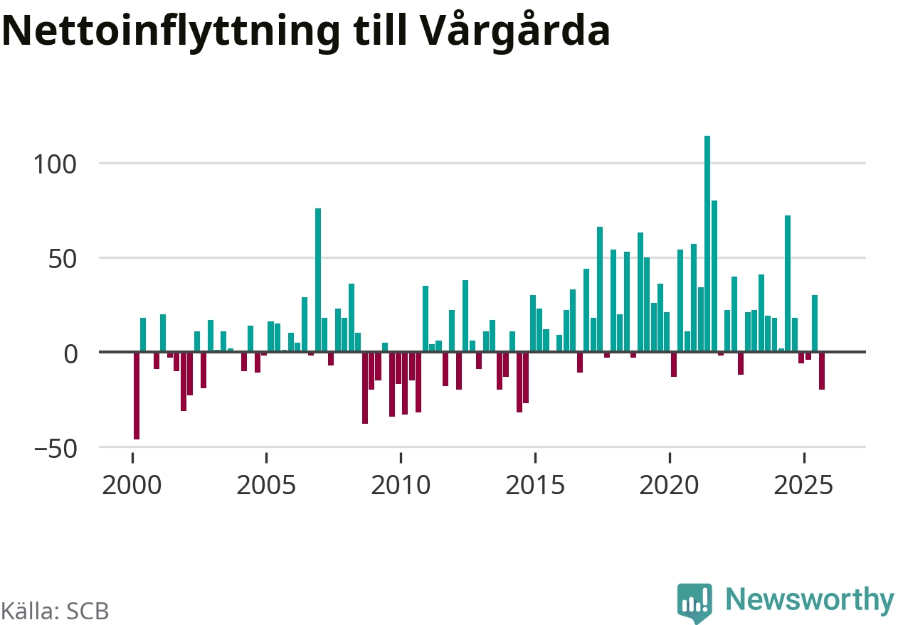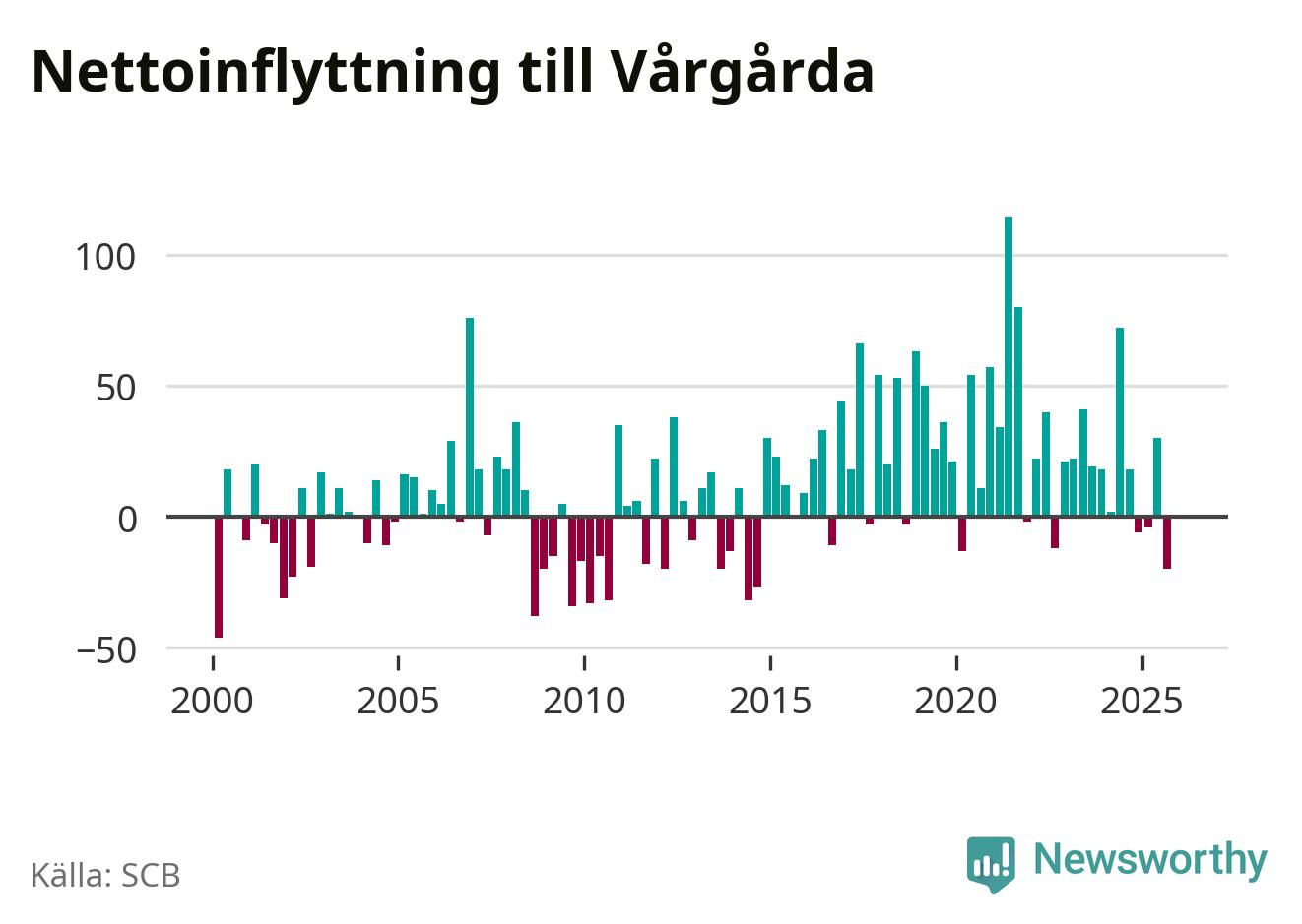 Under fjärde kvartalet 2025 flyttade 178 personer till kommunen samtidigt som lika många flyttade därifrån. Det är historiskt sett en stor utflyttning under ett kvartal. Sedan seklets början har Vårgårda oftast haft ett positivt flyttnetto.