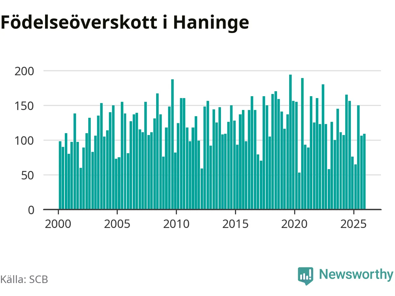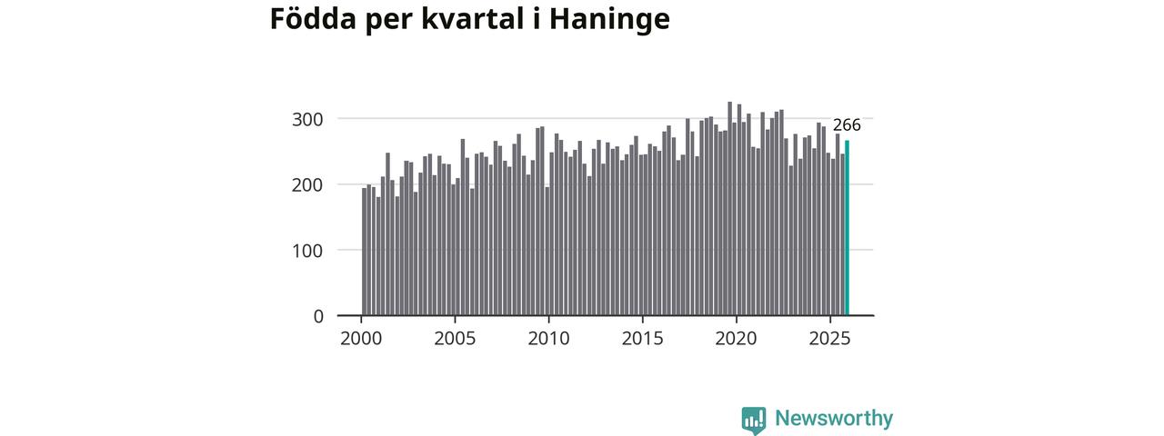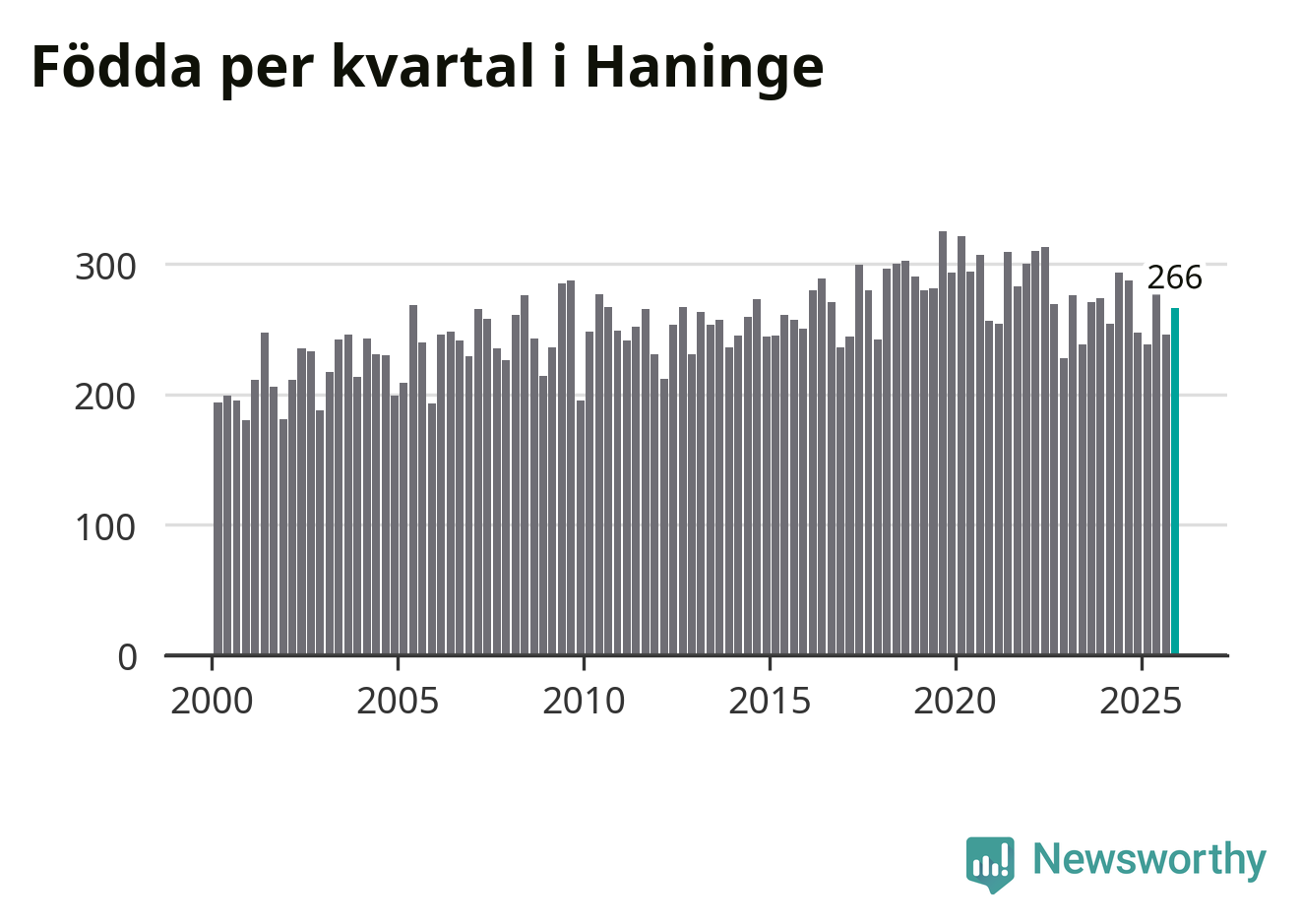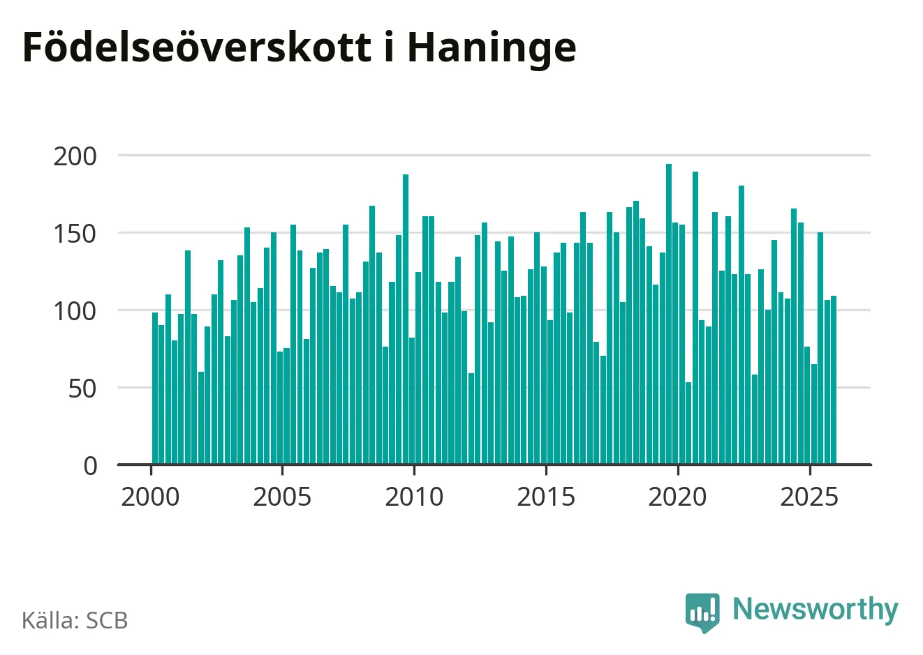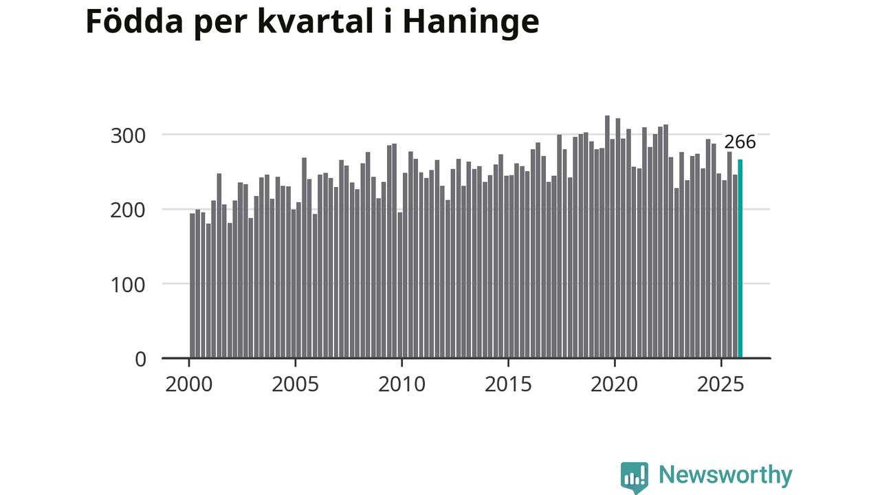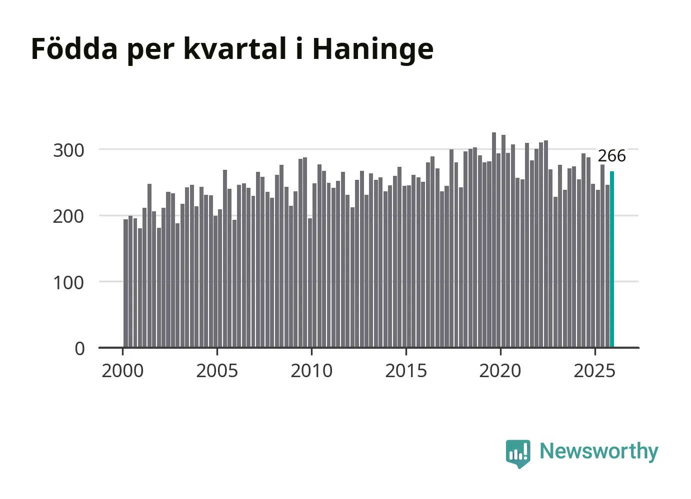 Enligt SCB:s siffror föddes 266 barn i Haninge under det senaste kvartalet. Samtidigt avled 157 personer. Haninge hade alltså ett positivt födelsenetto, vilket kommunen historiskt sett i princip alltid har haft.