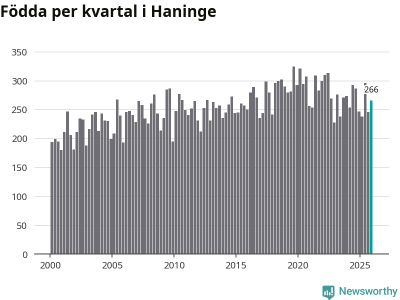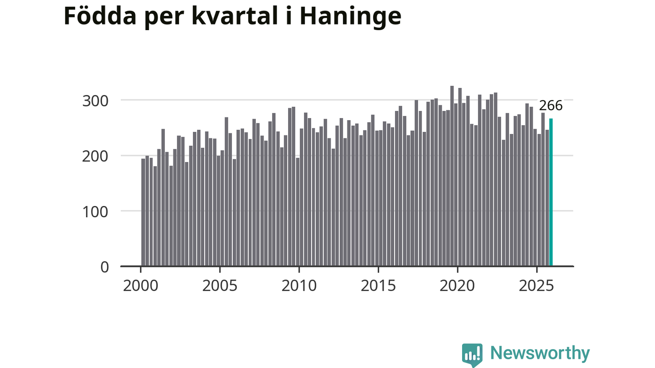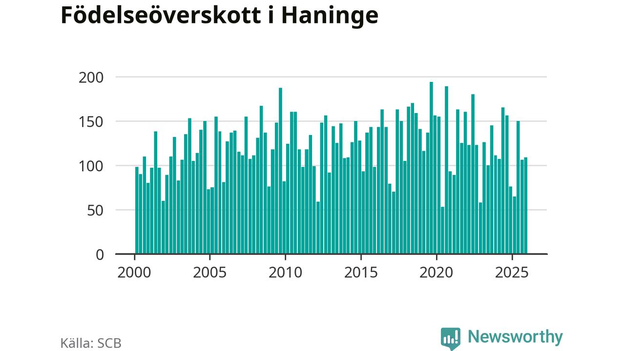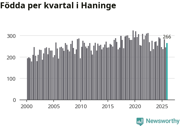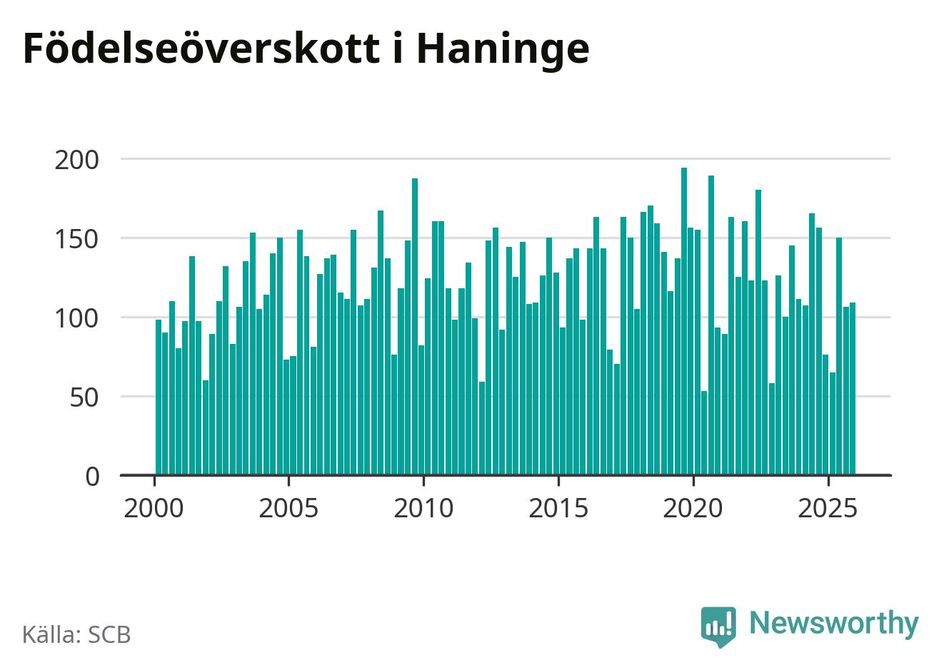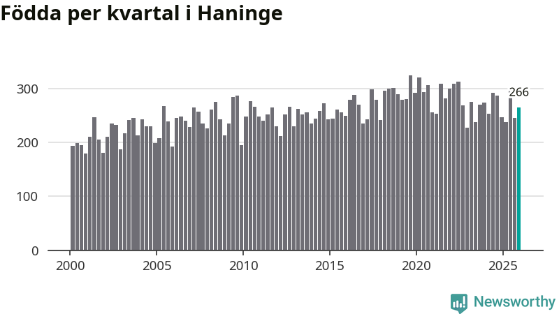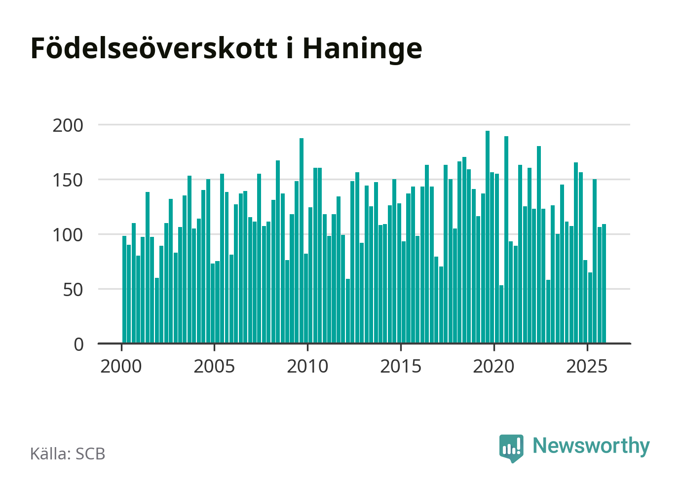 Enligt SCB:s siffror föddes 266 barn i Haninge under det senaste kvartalet. Samtidigt avled 157 personer. Haninge hade alltså ett positivt födelsenetto, vilket kommunen historiskt sett i princip alltid har haft.