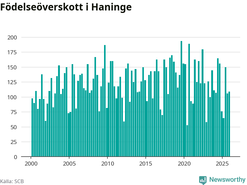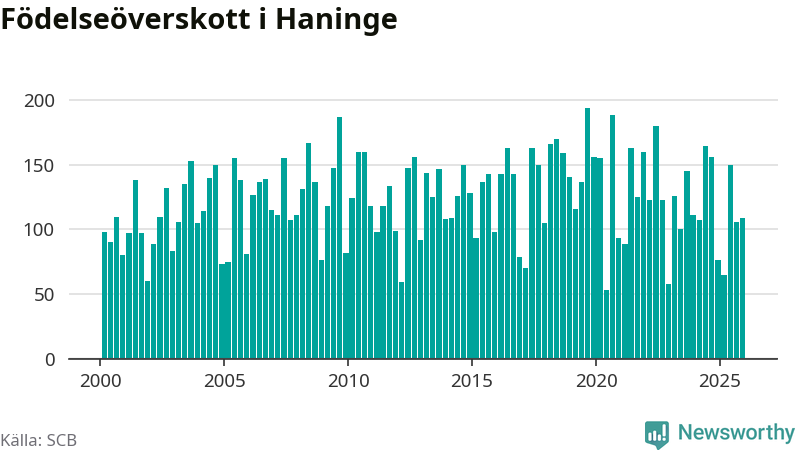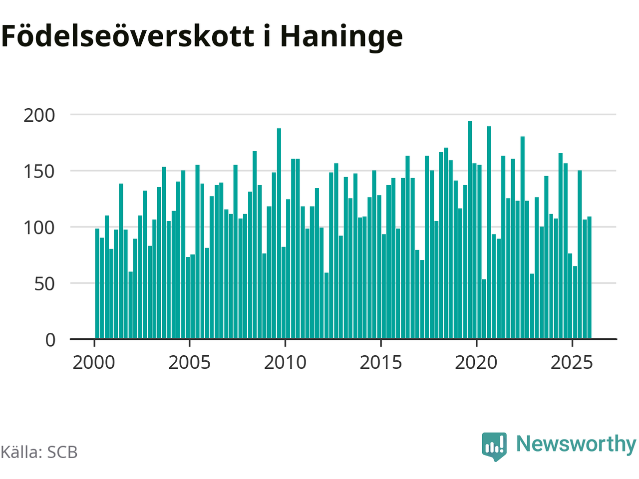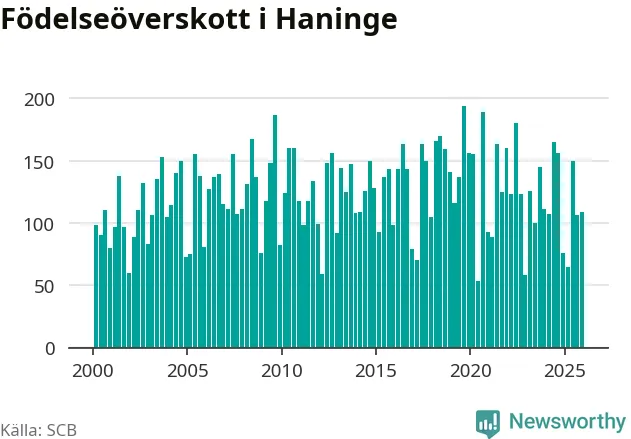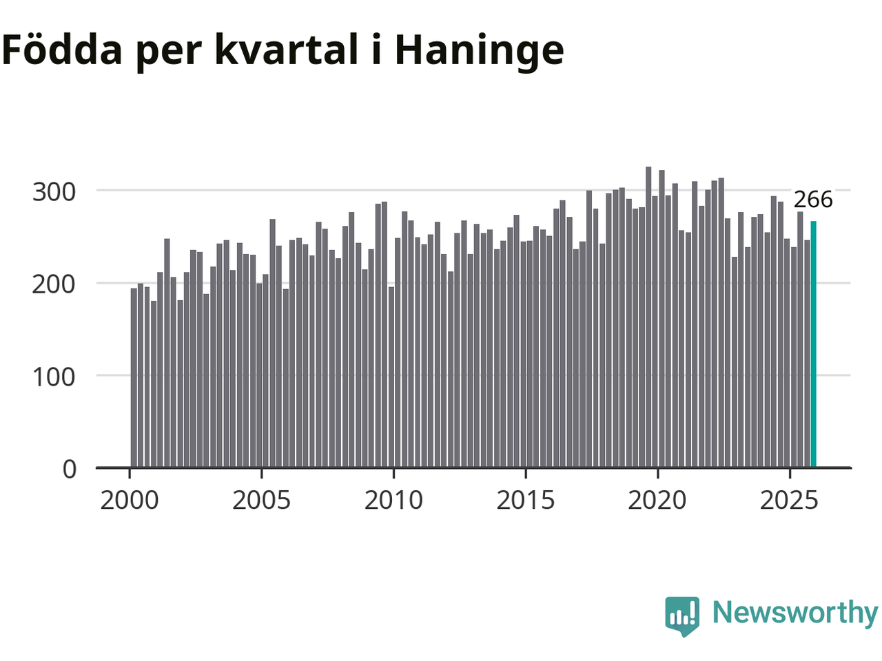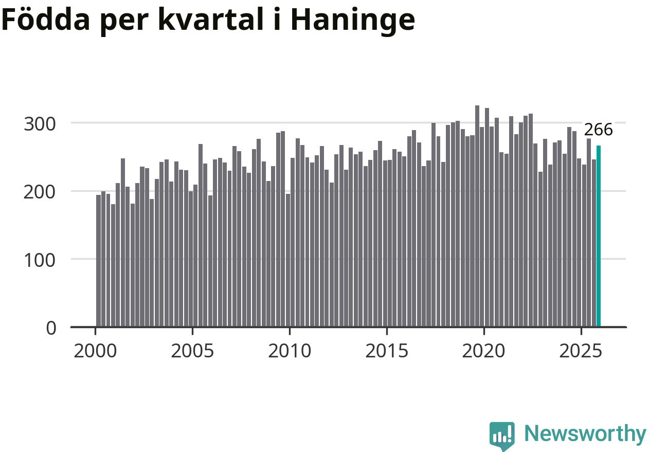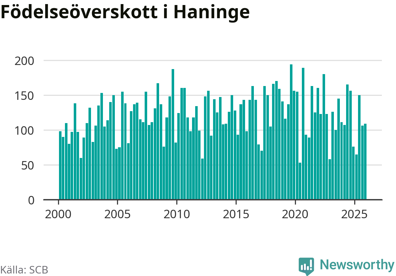 Enligt SCB:s siffror föddes 266 barn i Haninge under det senaste kvartalet. Samtidigt avled 157 personer. Haninge hade alltså ett positivt födelsenetto, vilket kommunen historiskt sett i princip alltid har haft.