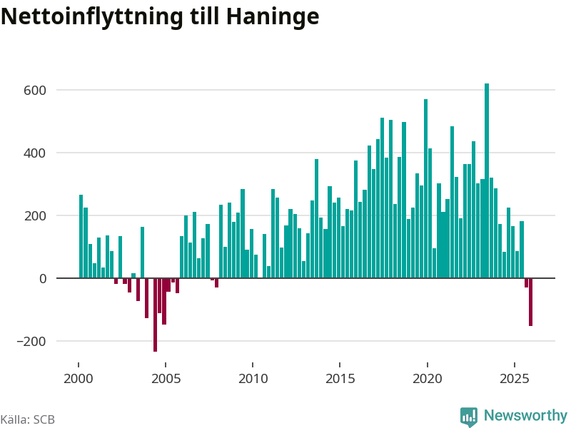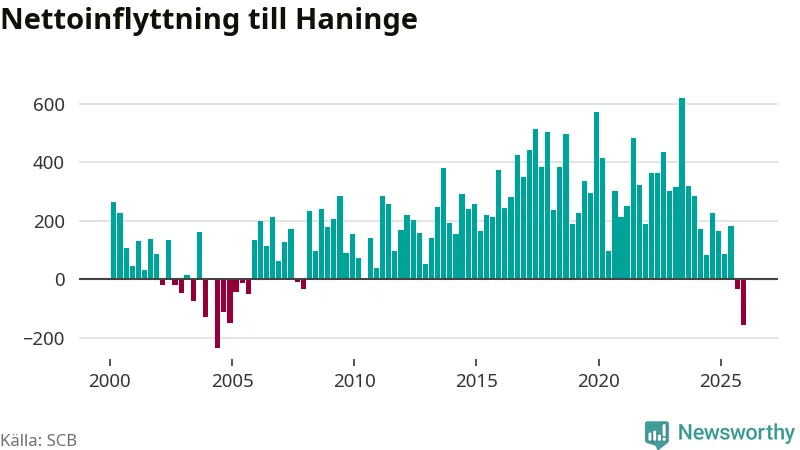 Under fjärde kvartalet 2025 flyttade 1 751 personer till kommunen medan 1 905 personer flyttade därifrån. Sedan seklets början har Haninge haft ett positivt flyttnetto under nästan alla kvartal.