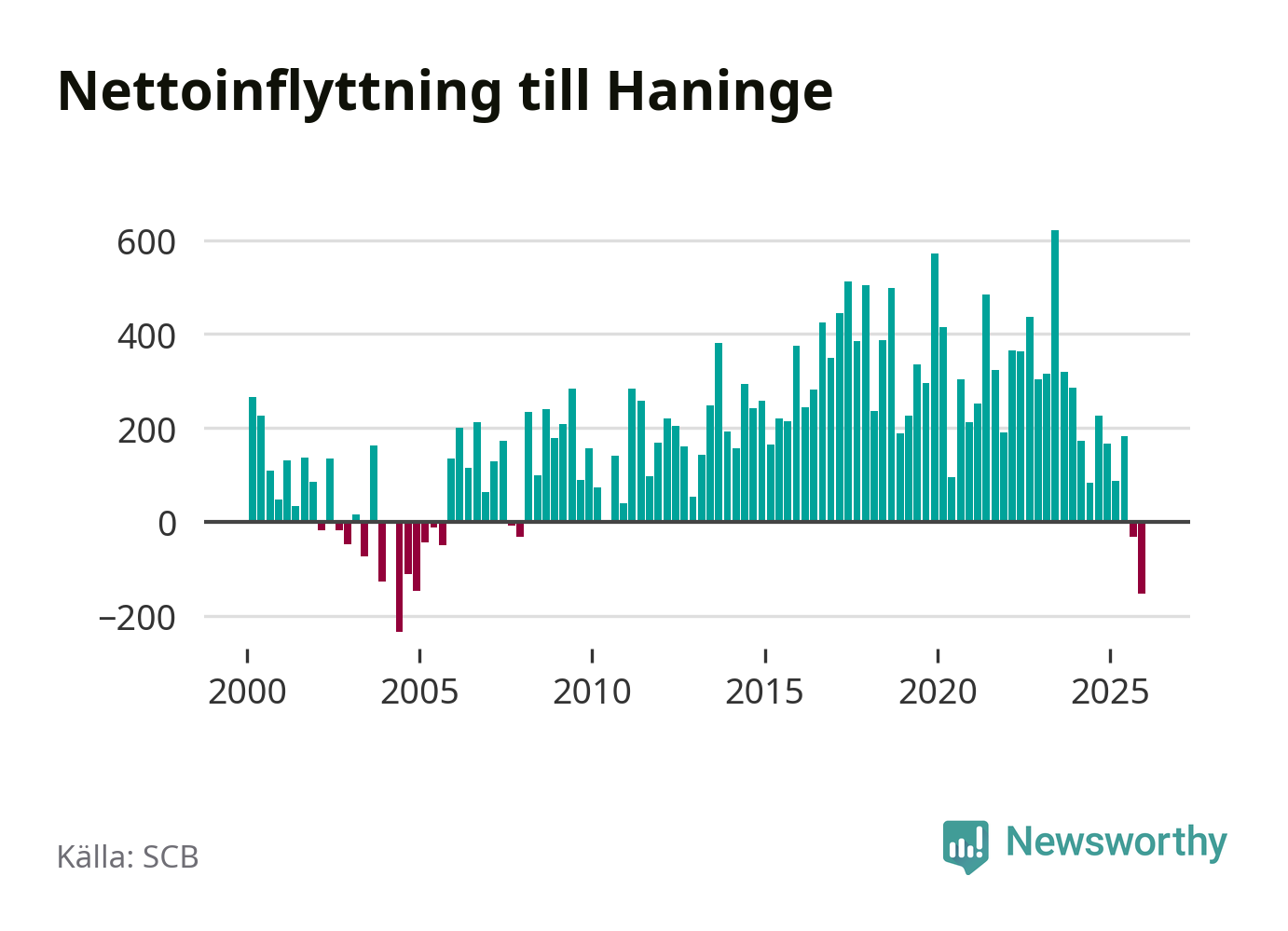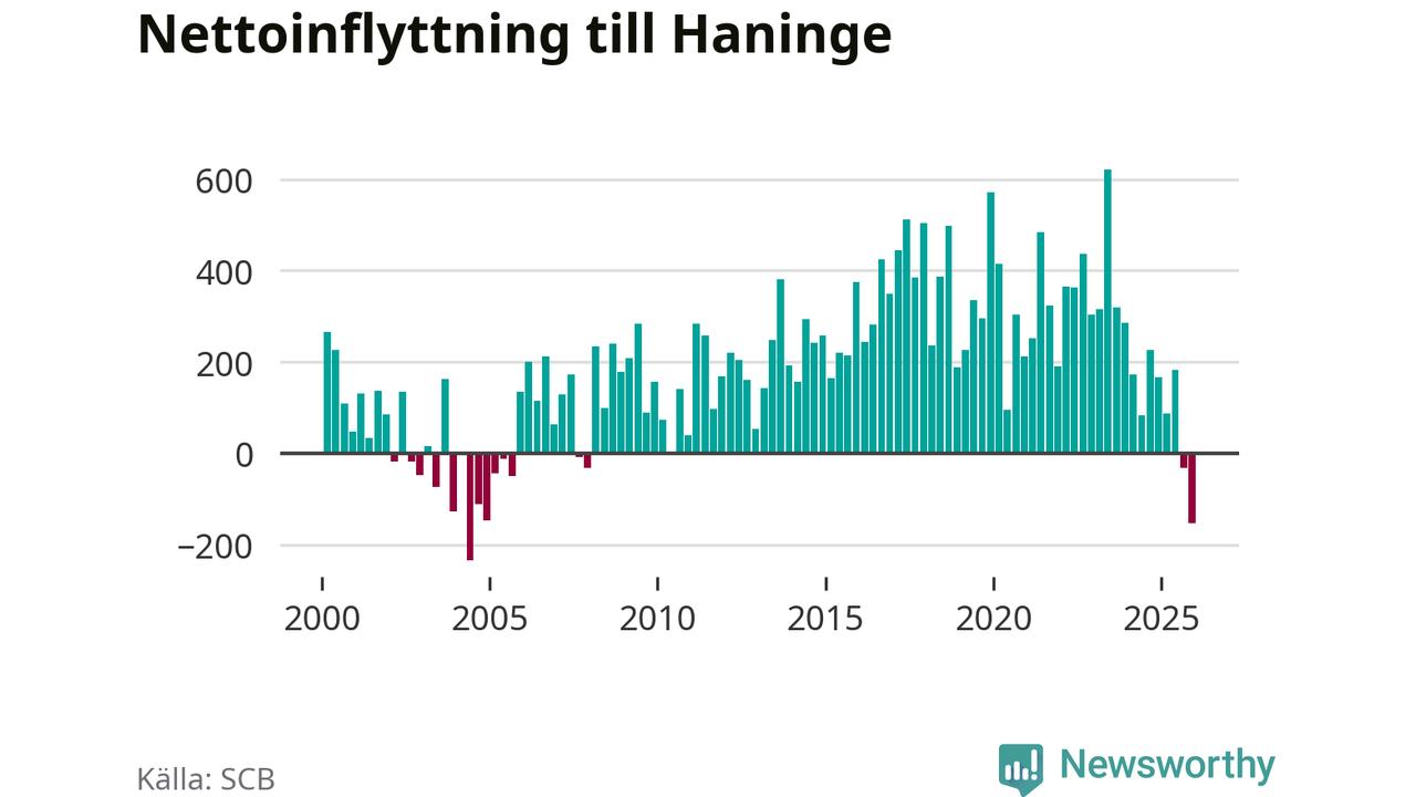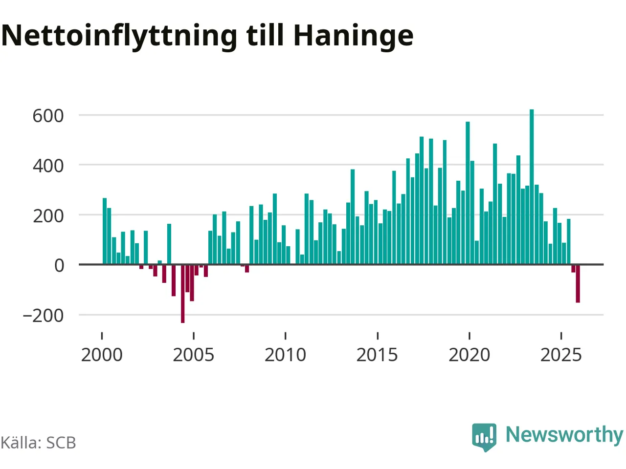 Det är första gången sedan det första kvartalet 2005 som befolkningen minskar – alltså första gången på 20 år. Det är också den fjärde största befolkningsminskningen i Haninge under ett kvartal under det här millenniet.