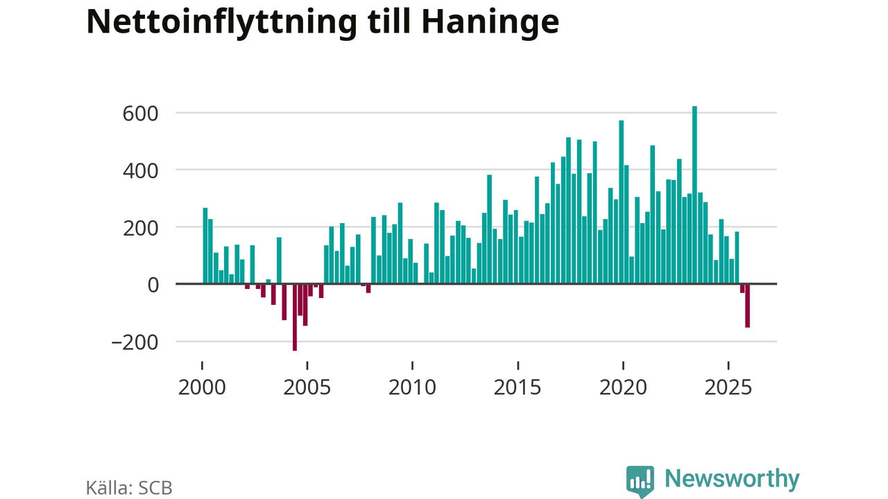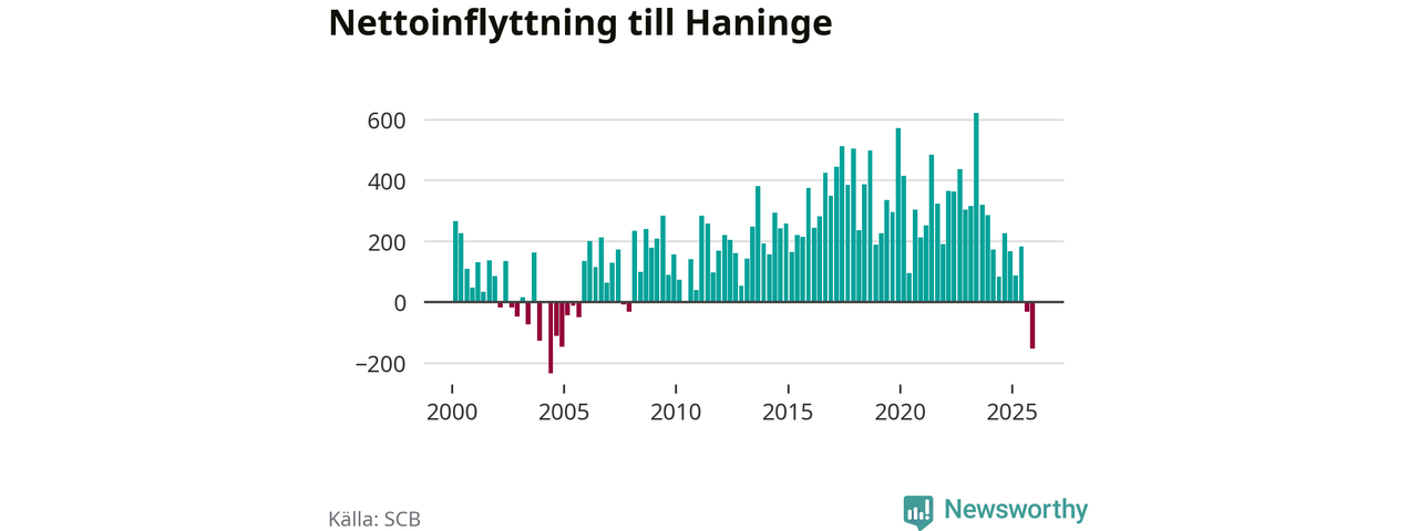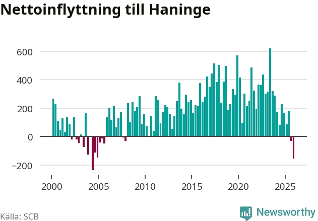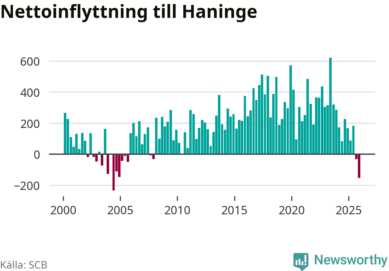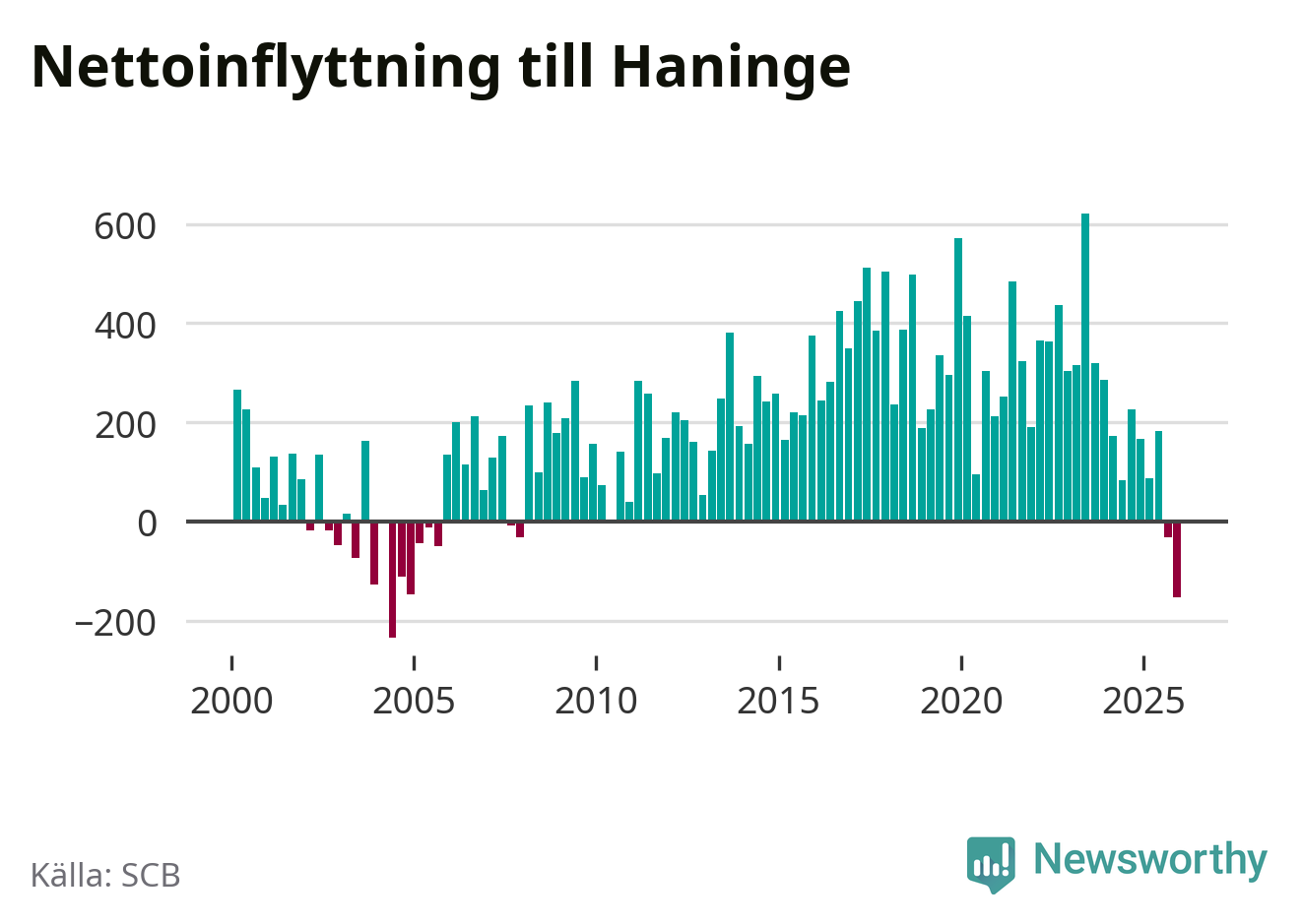 Det är första gången sedan det första kvartalet 2005 som befolkningen minskar – alltså första gången på 20 år. Det är också den fjärde största befolkningsminskningen i Haninge under ett kvartal under det här millenniet.