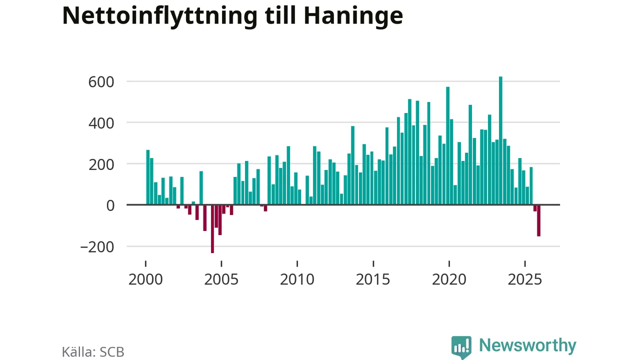 Haninges befolkning minskade under fjärde kvartalet 2025, visar SCB:s senaste statistik. Det är första gången sedan 2005 det händer.