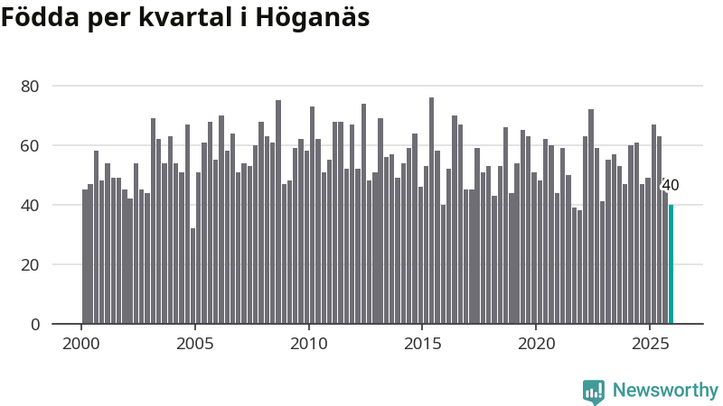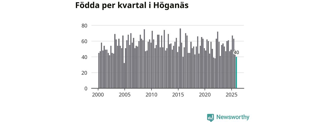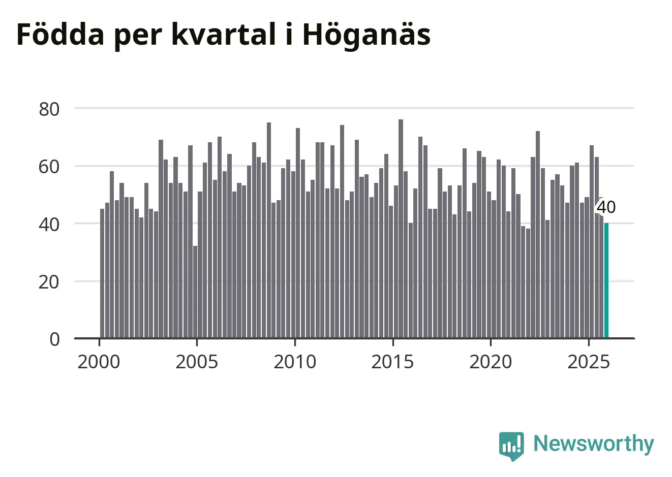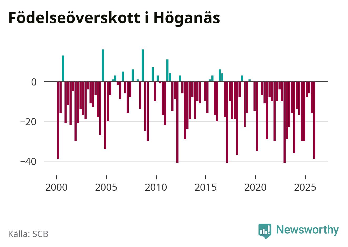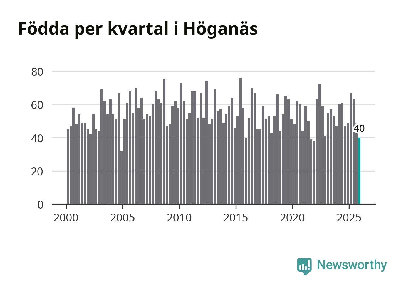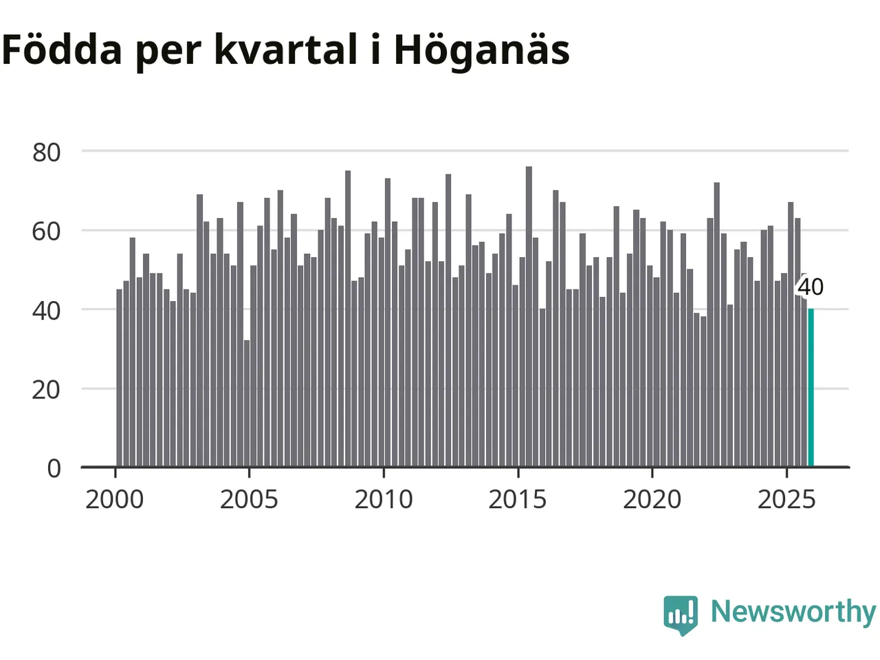 Enligt SCB:s siffror föddes 40 barn i Höganäs under det senaste kvartalet. Samtidigt avled 79 personer. Höganäs hade alltså ett negativt födelsenetto, vilket kommunen historiskt sett nästan alltid har haft.