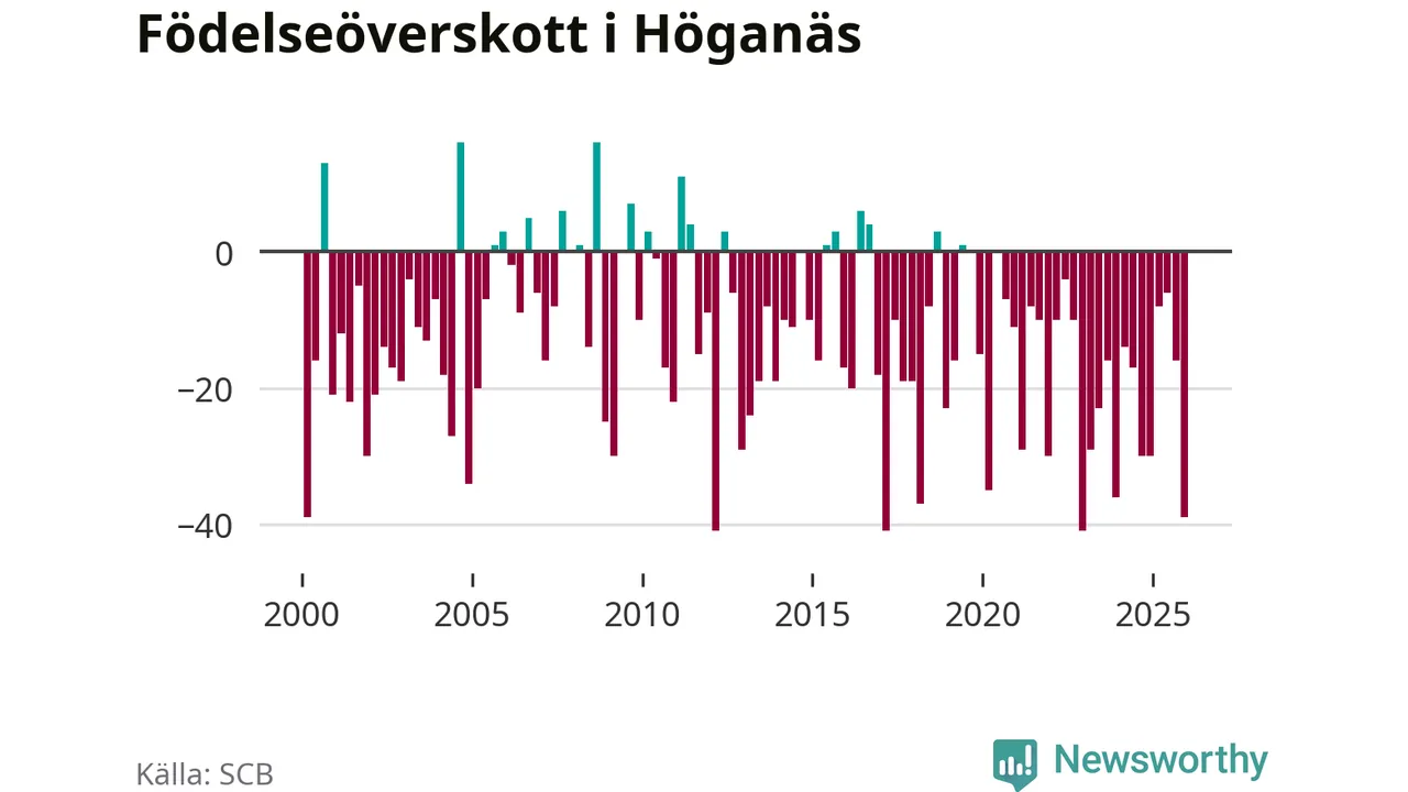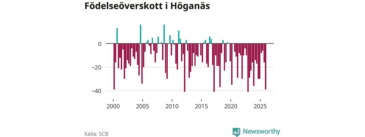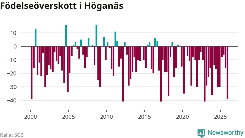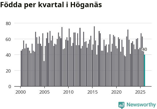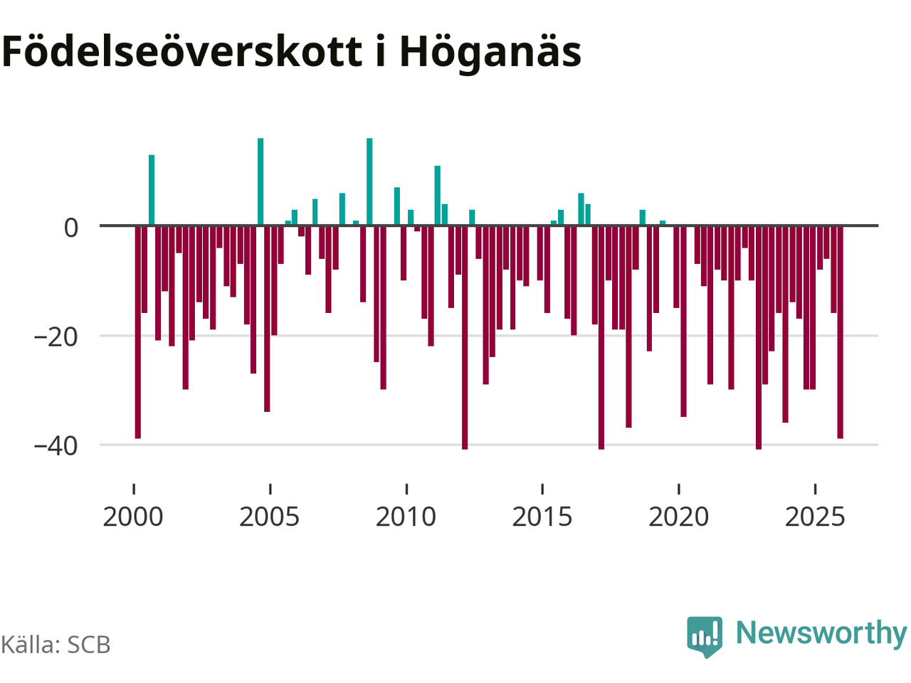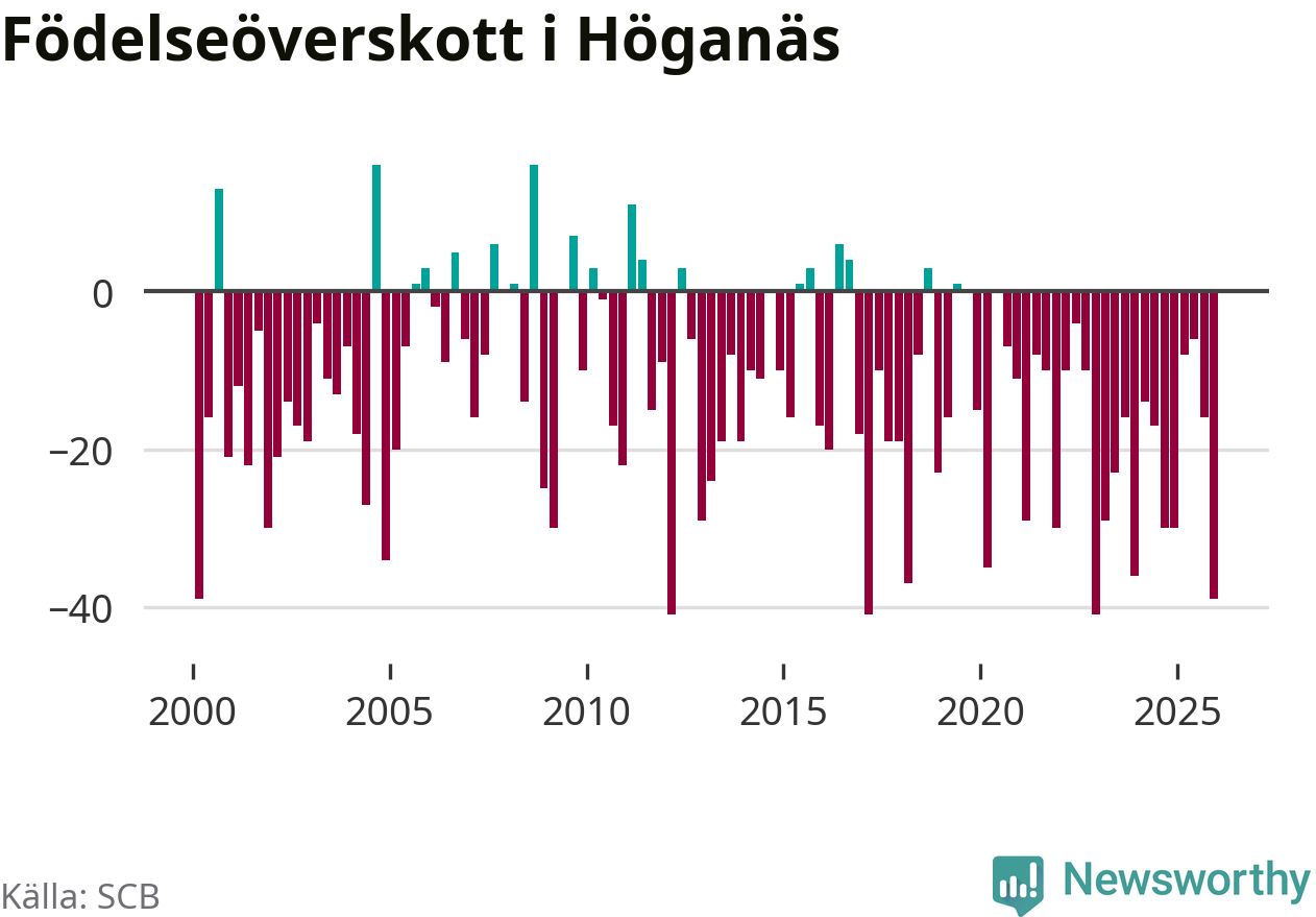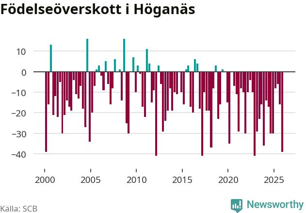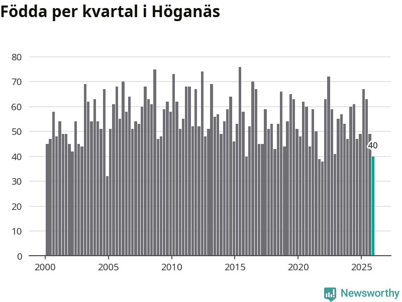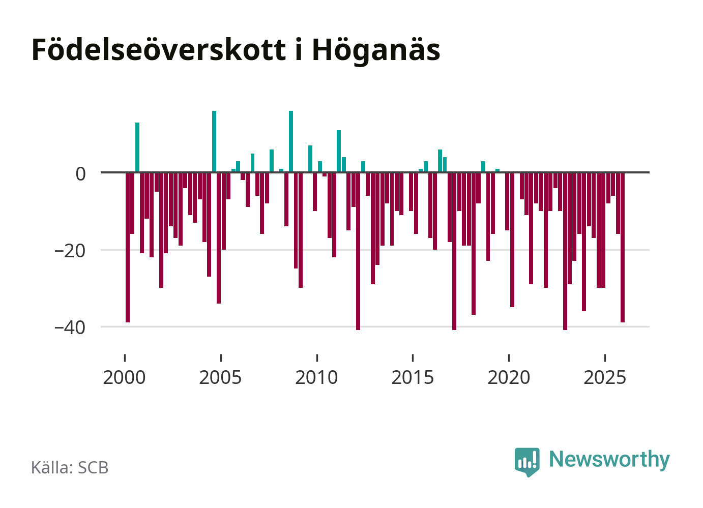 Enligt SCB:s siffror föddes 40 barn i Höganäs under det senaste kvartalet. Samtidigt avled 79 personer. Höganäs hade alltså ett negativt födelsenetto, vilket kommunen historiskt sett nästan alltid har haft.