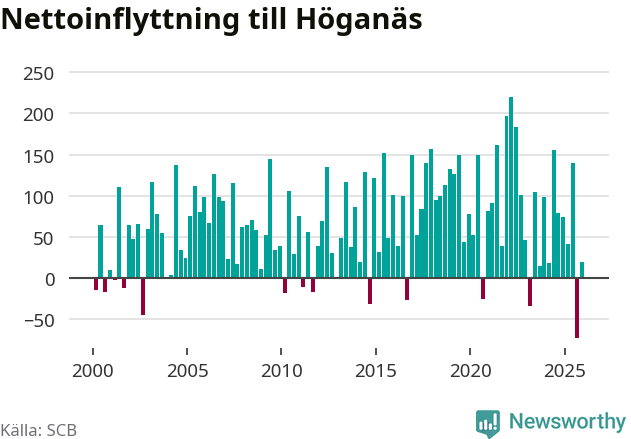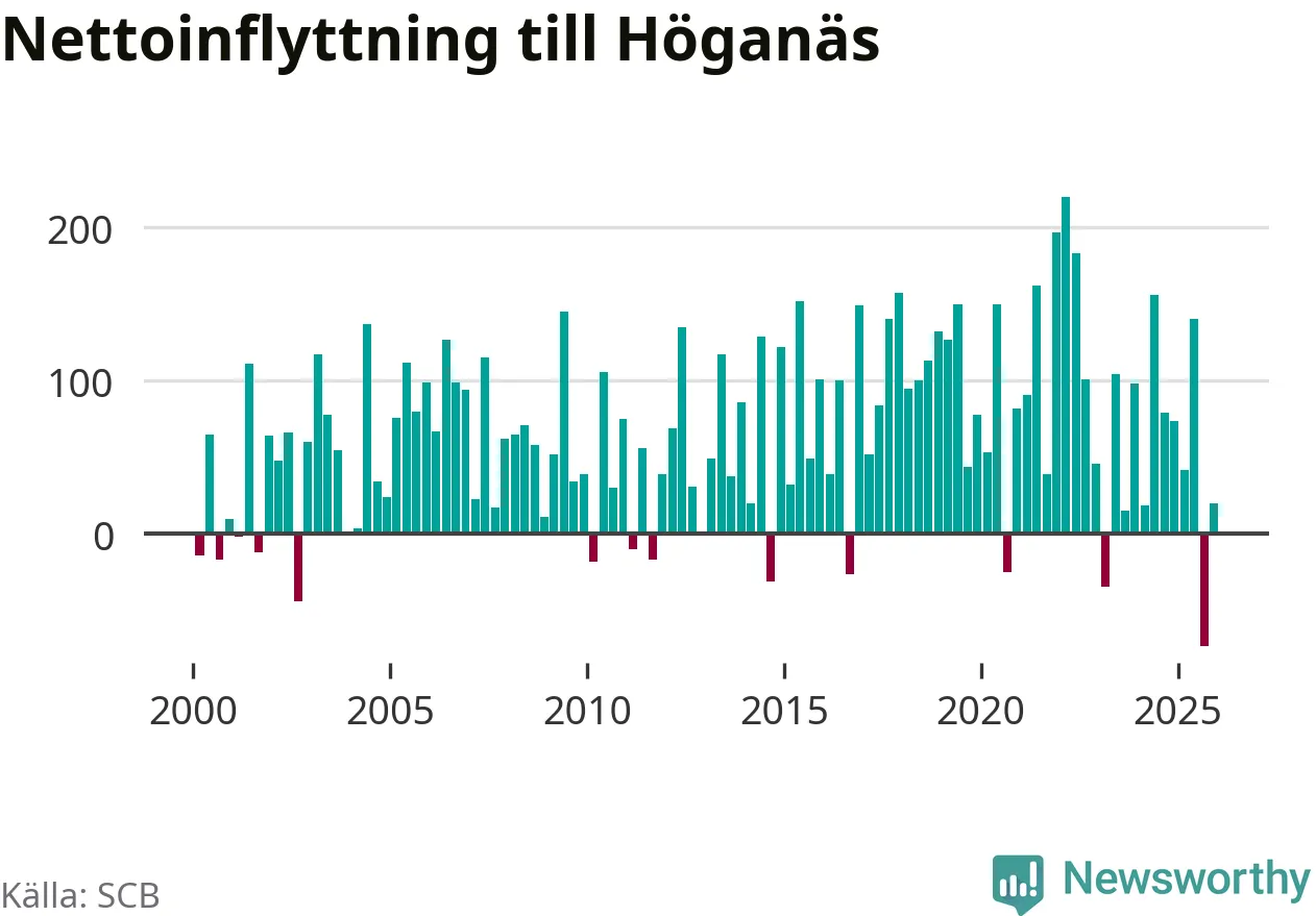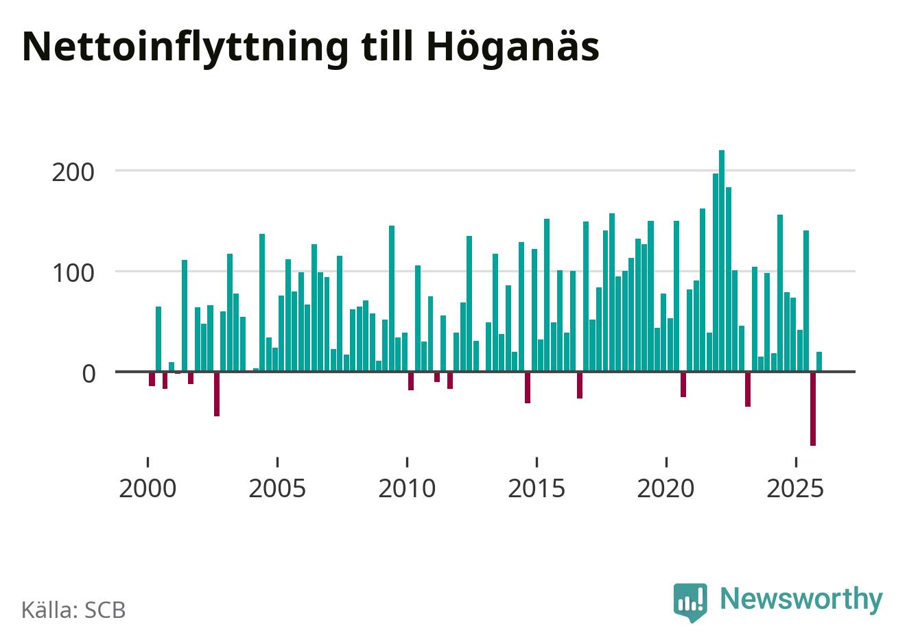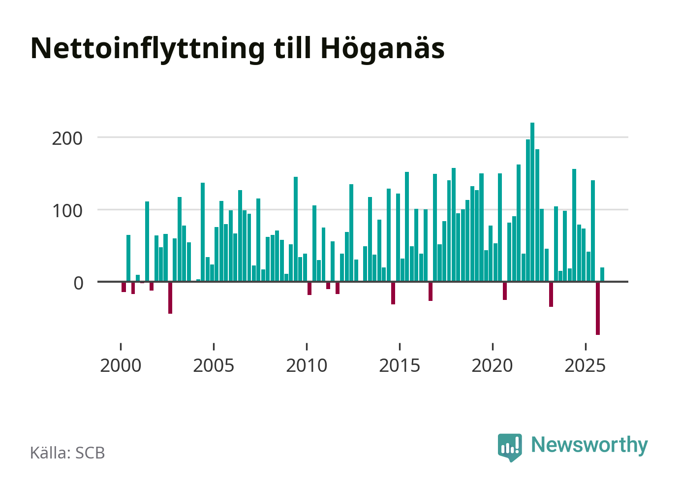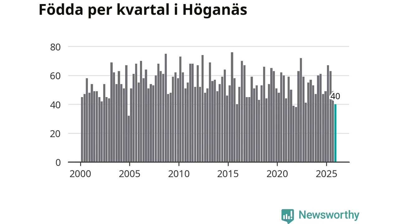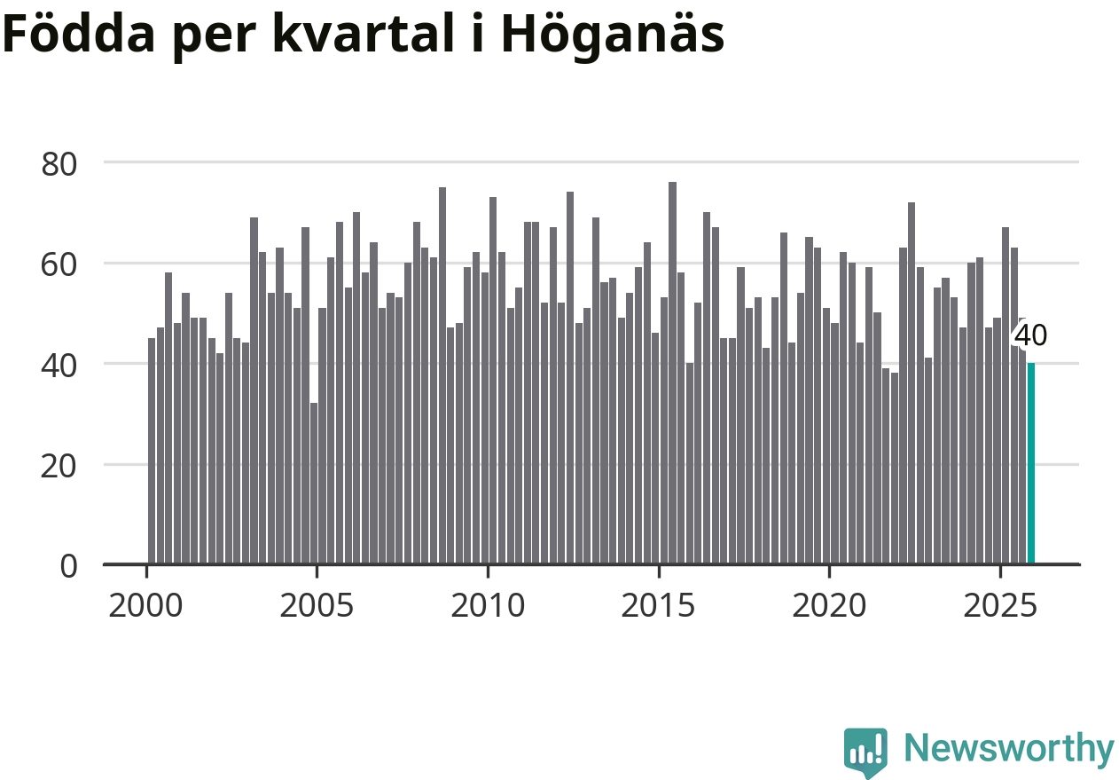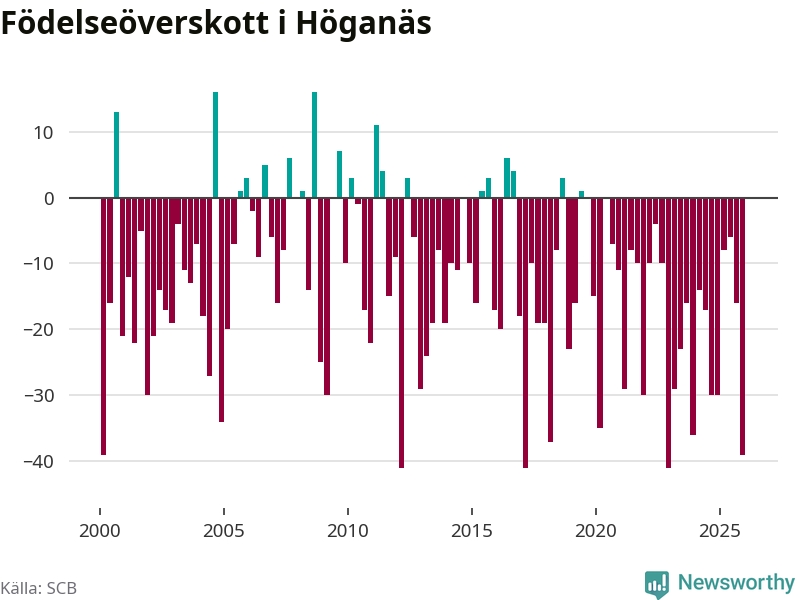 Enligt SCB:s siffror föddes 40 barn i Höganäs under det senaste kvartalet. Samtidigt avled 79 personer. Höganäs hade alltså ett negativt födelsenetto, vilket kommunen historiskt sett nästan alltid har haft.