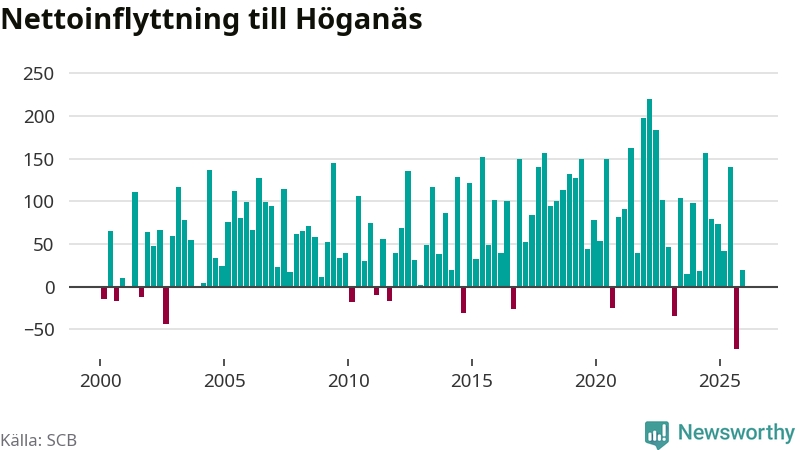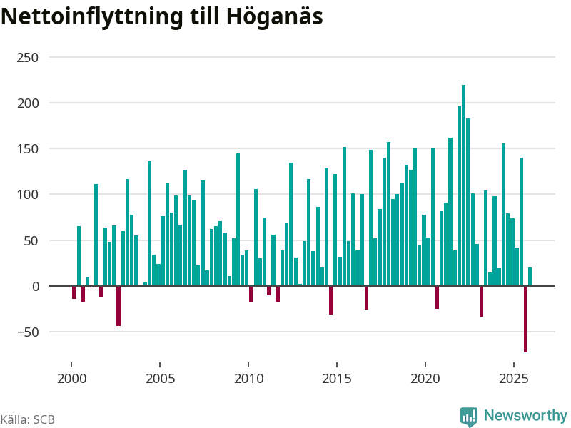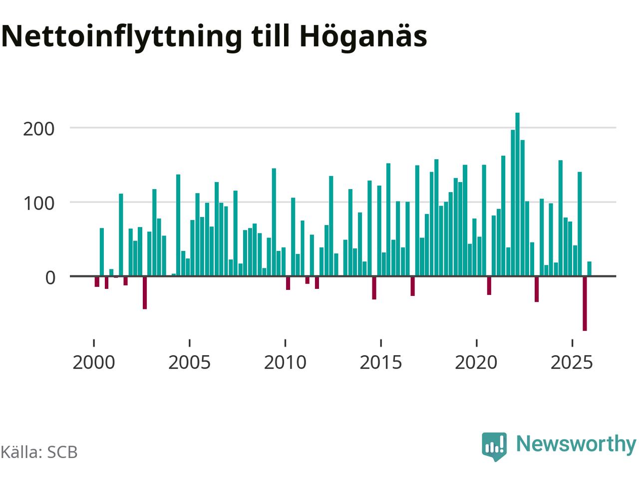 Under fjärde kvartalet 2025 flyttade 376 personer till kommunen medan 356 personer flyttade därifrån. Sedan seklets början har Höganäs haft ett positivt flyttnetto under nästan alla kvartal, inklusive det senaste kvartalet.
