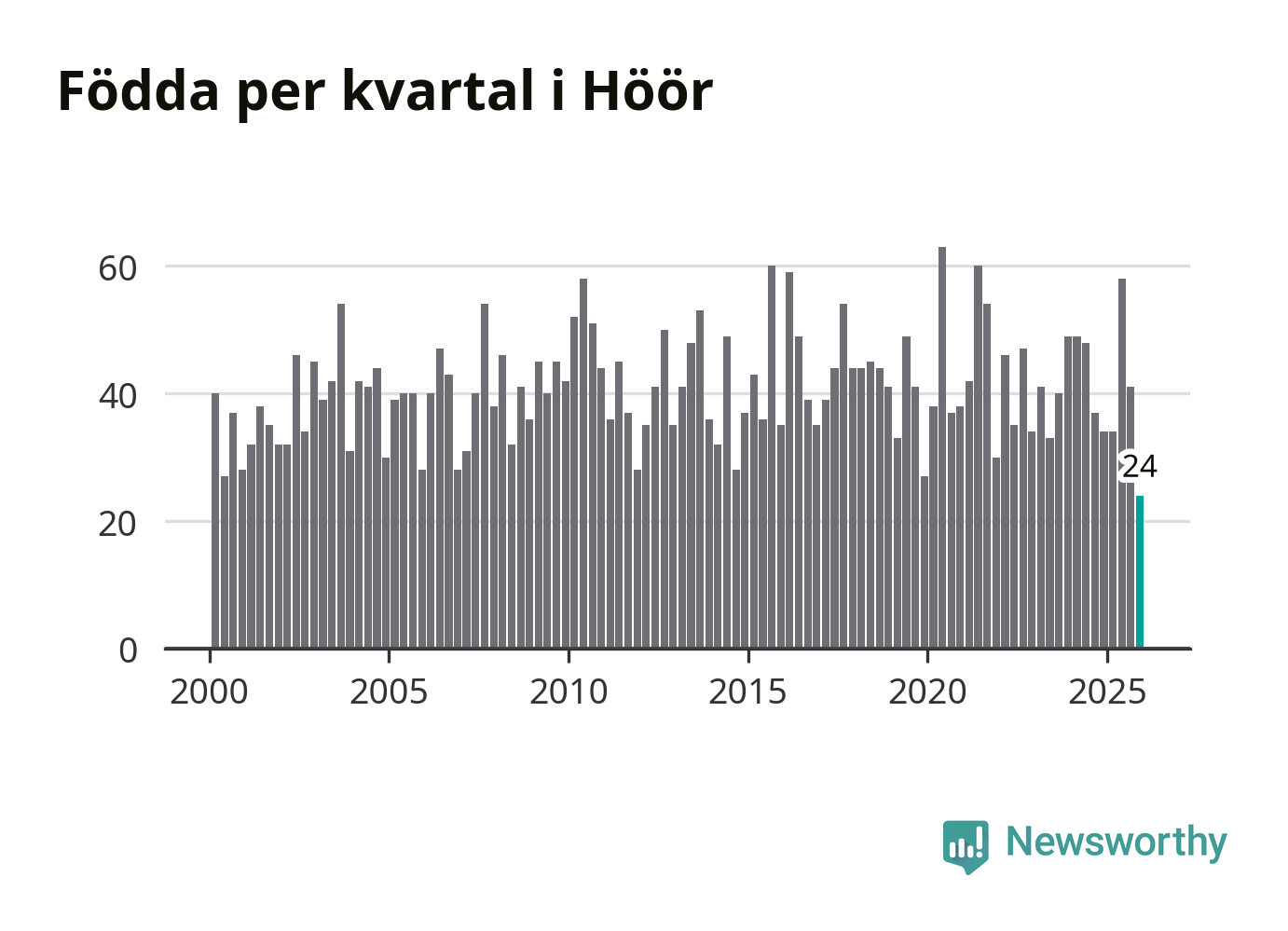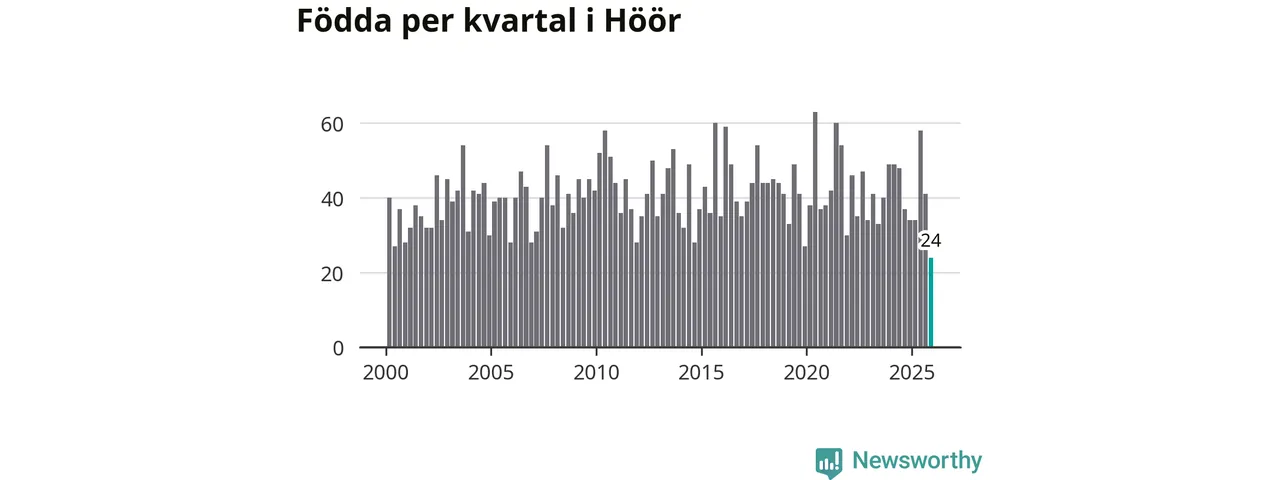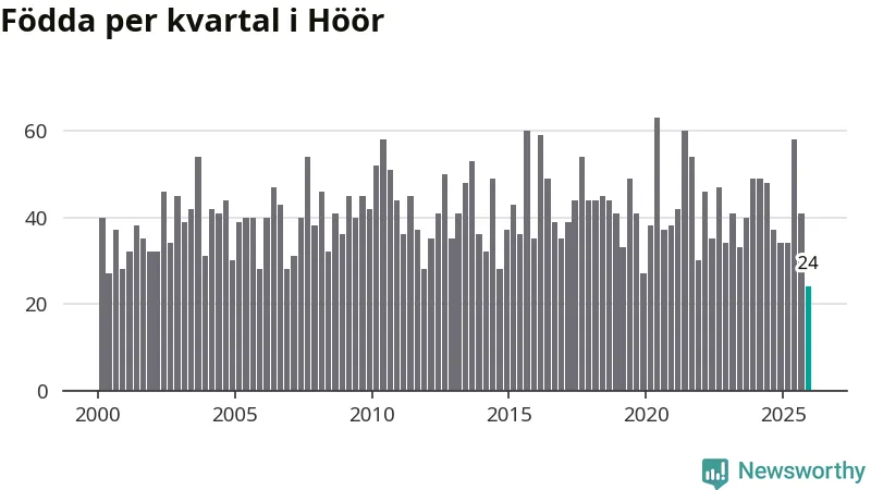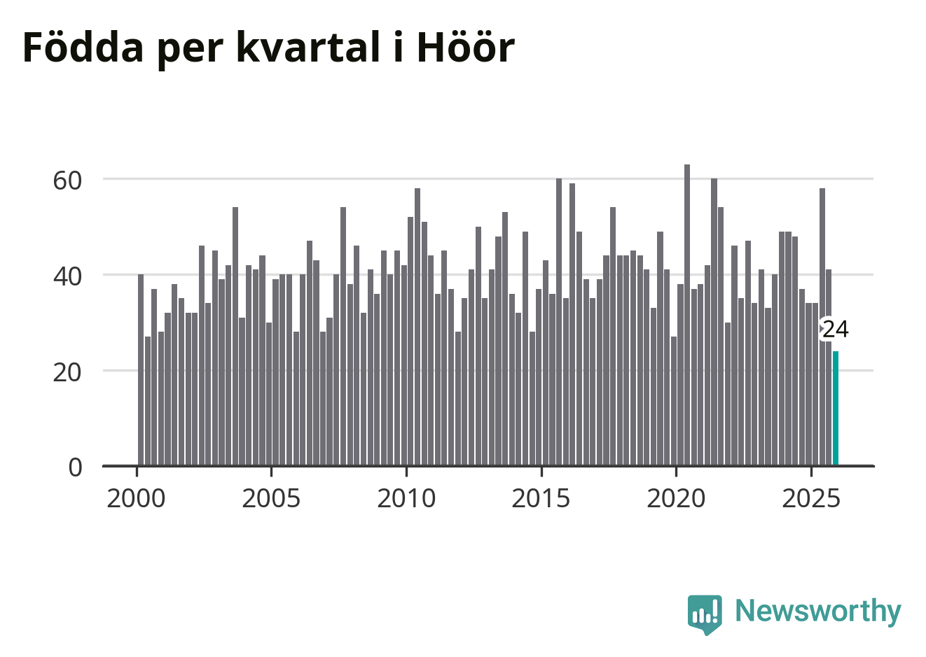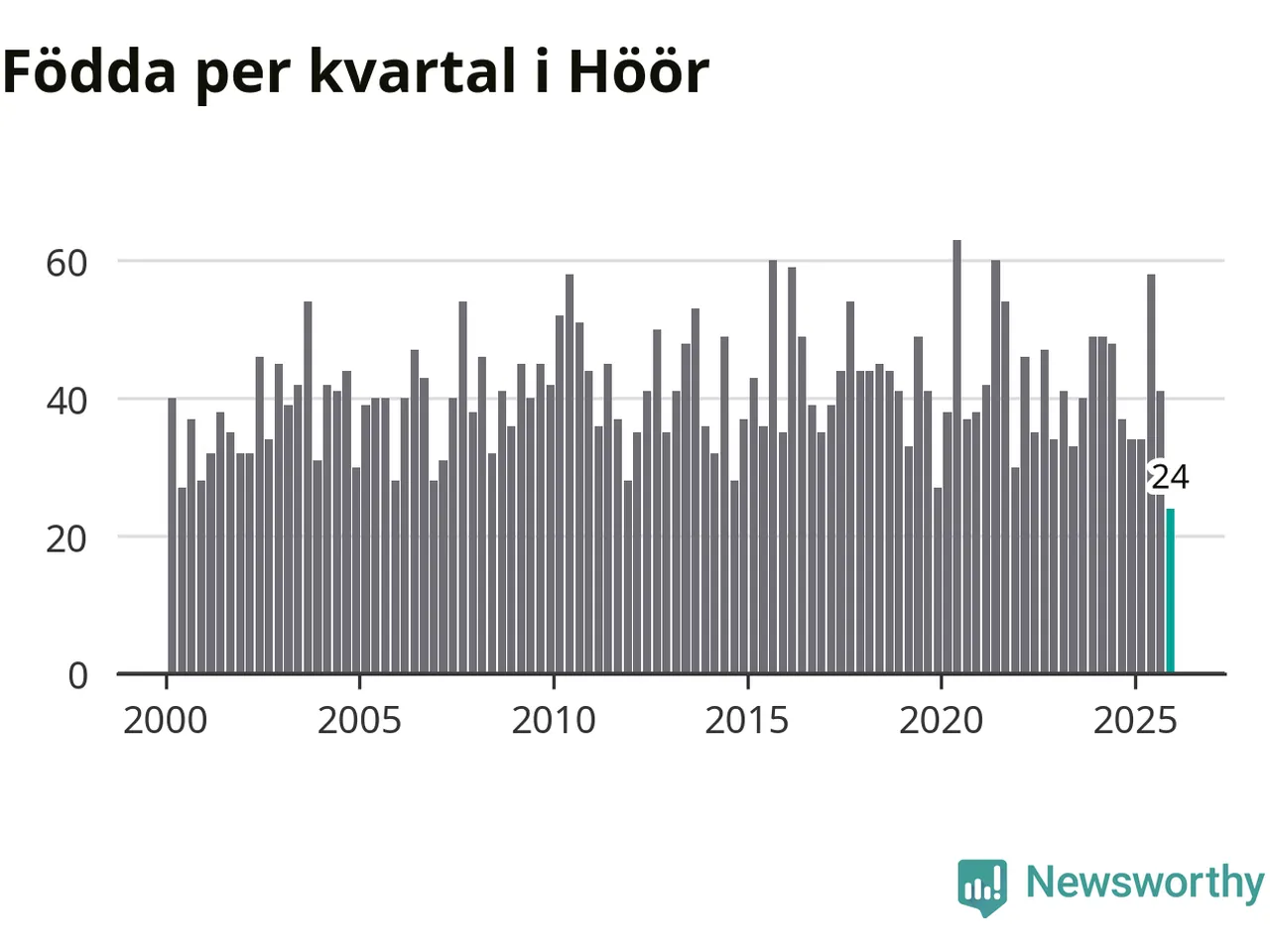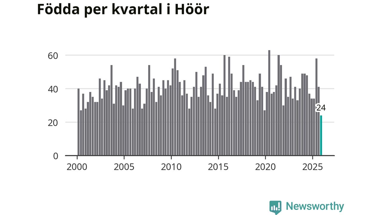 Enligt SCB:s siffror föddes 24 barn i Höör under det senaste kvartalet. Det är det lägsta födelsetal som registrerats i kommunen under 2000-talet. Det finns en osäkerhet här, eftersom SCB lägger på ett slumpmässigt brus på alla siffror. Samtidigt avled 36 personer. Höör hade alltså ett negativt födelsenetto under fjärde kvartalet. Historiskt har dock födelsenettot oftast varit positivt.