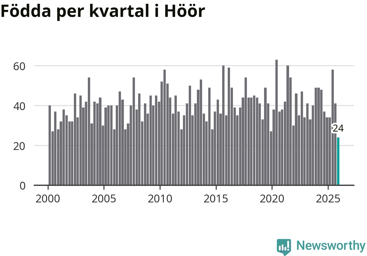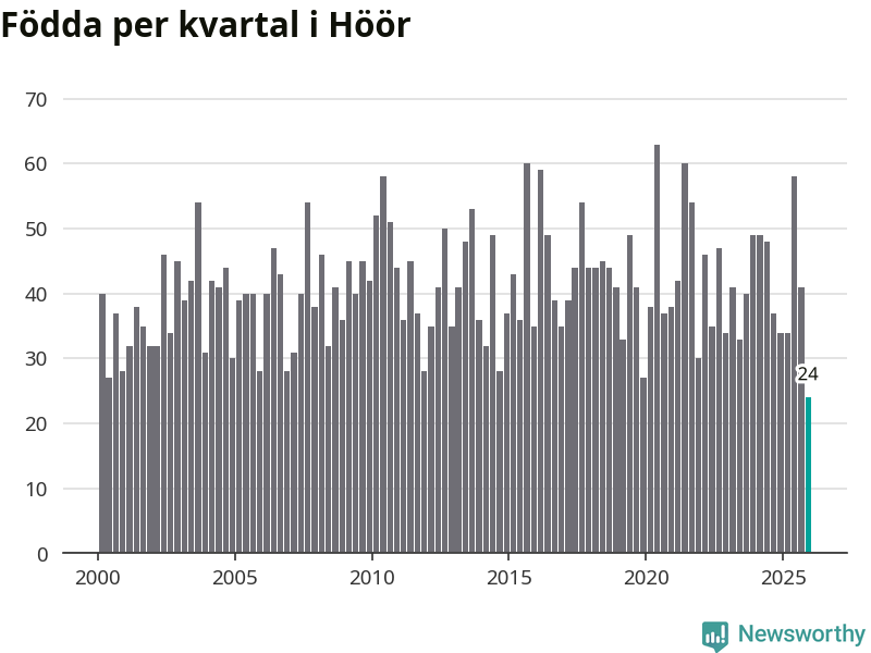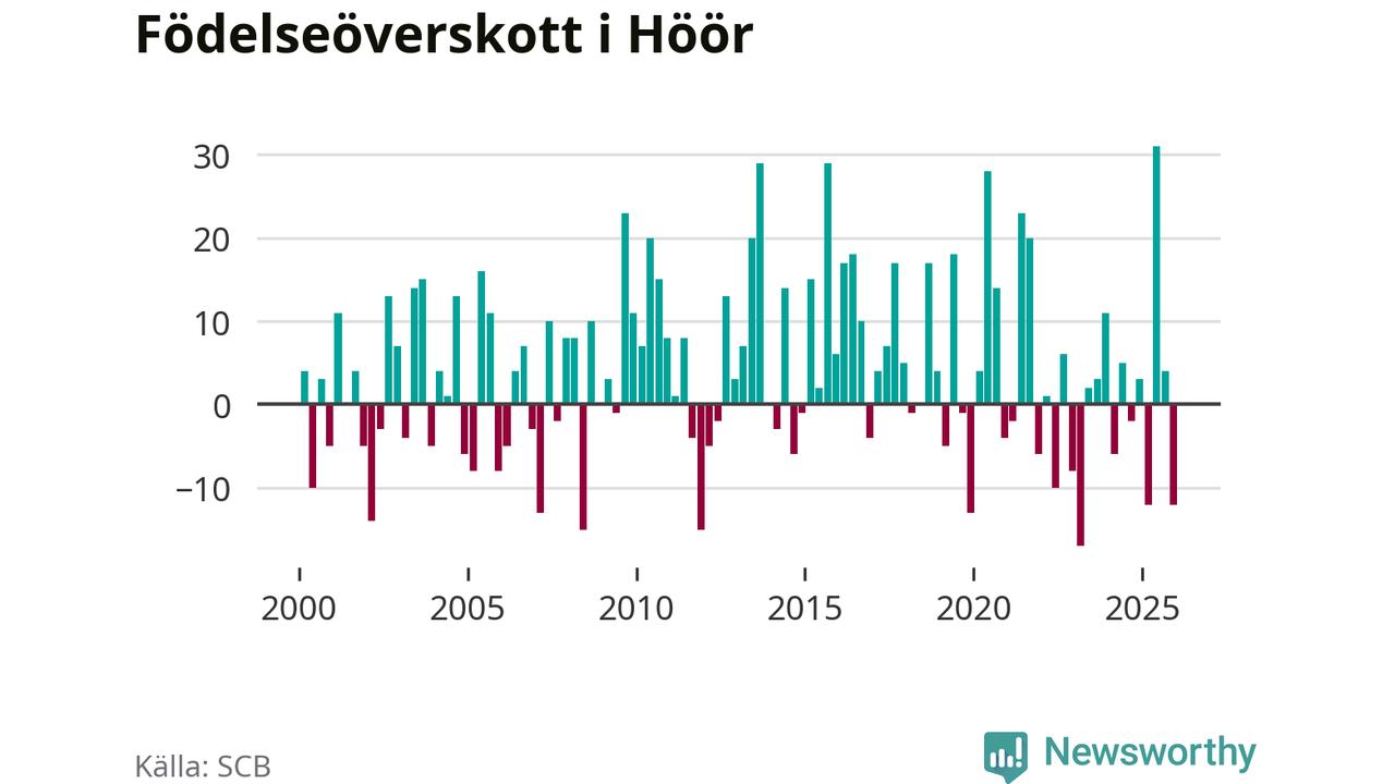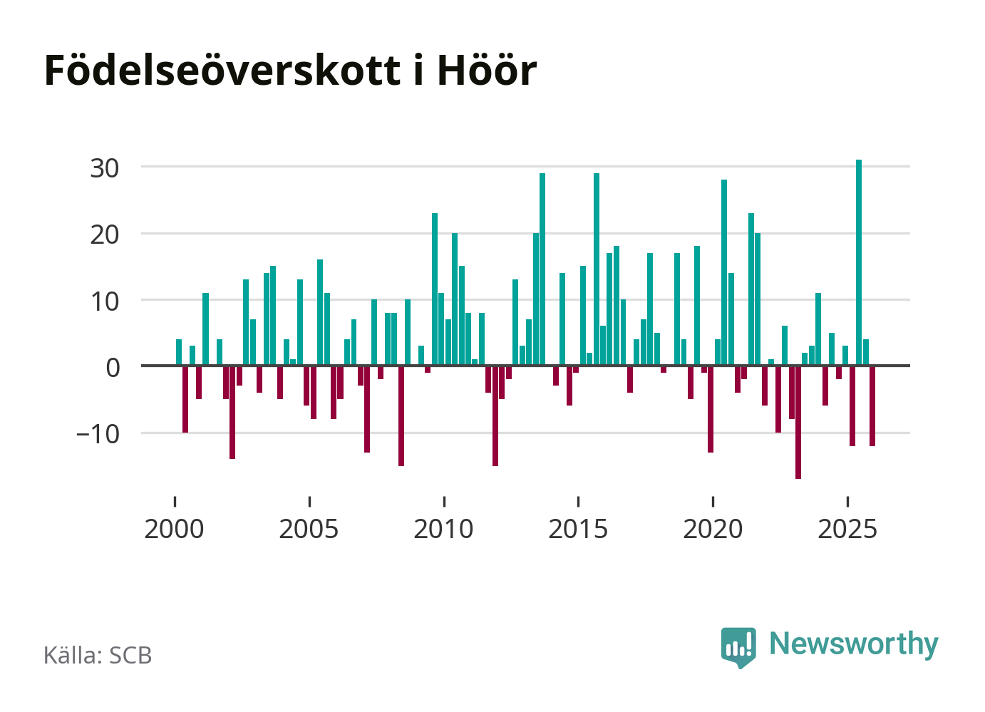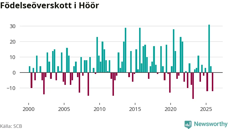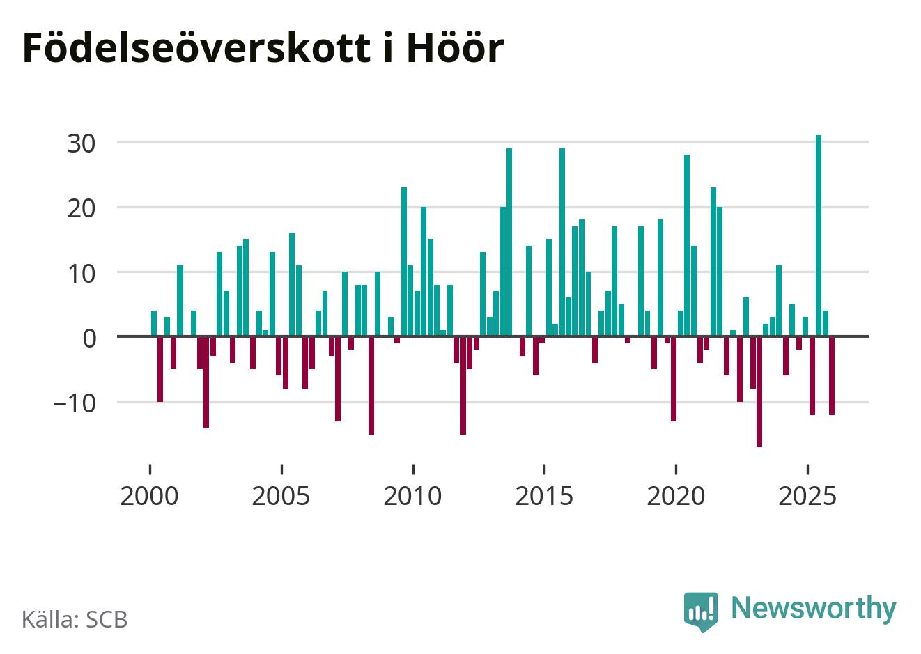 Enligt SCB:s siffror föddes 24 barn i Höör under det senaste kvartalet. Det är det lägsta födelsetal som registrerats i kommunen under 2000-talet. Det finns en osäkerhet här, eftersom SCB lägger på ett slumpmässigt brus på alla siffror. Samtidigt avled 36 personer. Höör hade alltså ett negativt födelsenetto under fjärde kvartalet. Historiskt har dock födelsenettot oftast varit positivt.