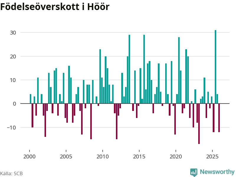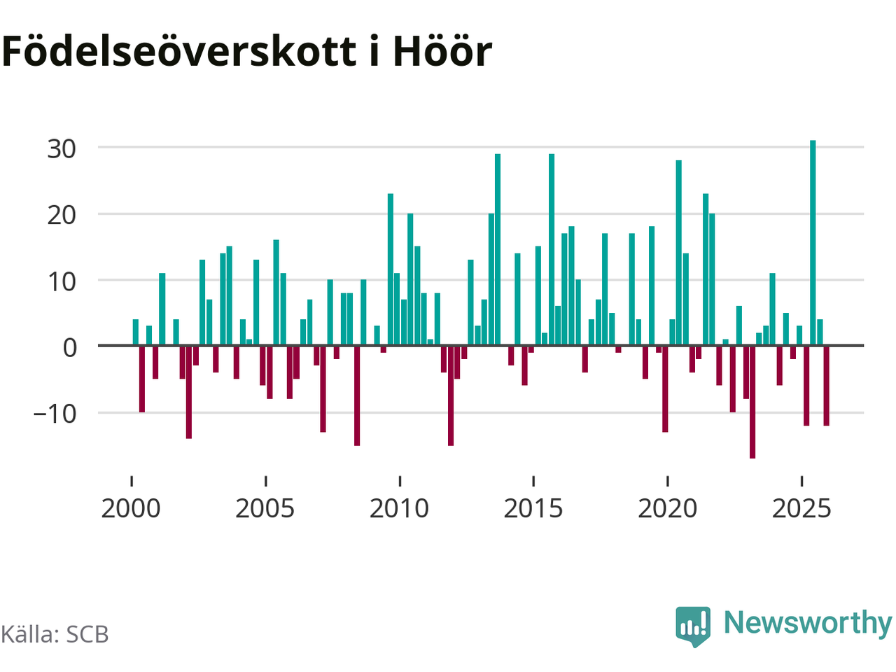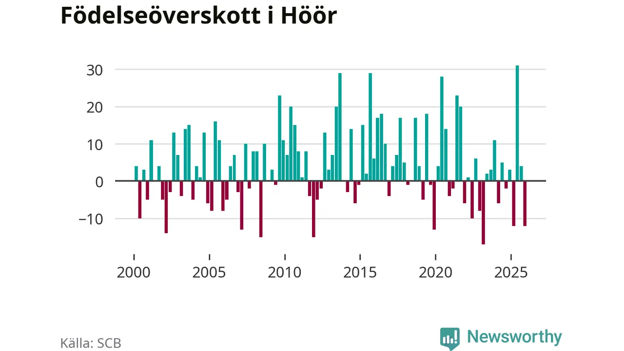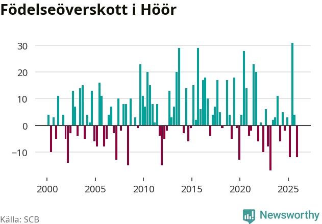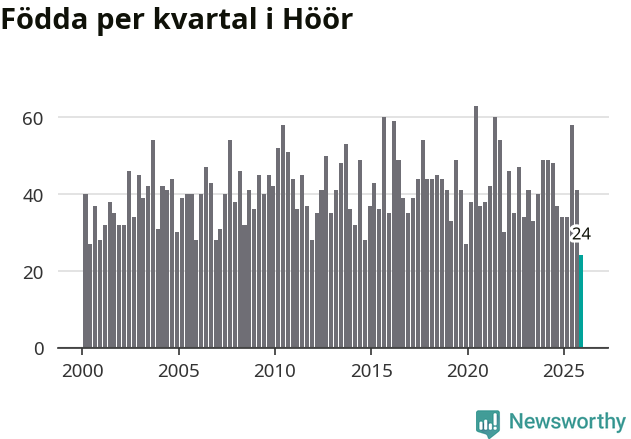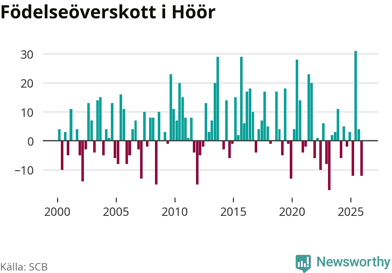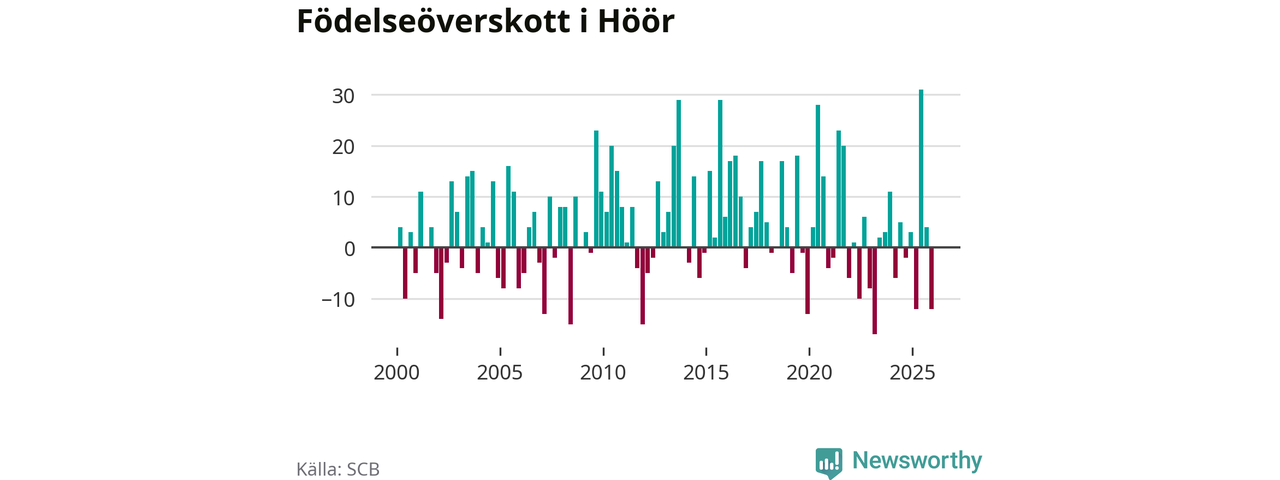 Enligt SCB:s siffror föddes 24 barn i Höör under det senaste kvartalet. Det är det lägsta födelsetal som registrerats i kommunen under 2000-talet. Det finns en osäkerhet här, eftersom SCB lägger på ett slumpmässigt brus på alla siffror. Samtidigt avled 36 personer. Höör hade alltså ett negativt födelsenetto under fjärde kvartalet. Historiskt har dock födelsenettot oftast varit positivt.