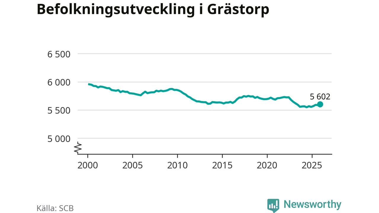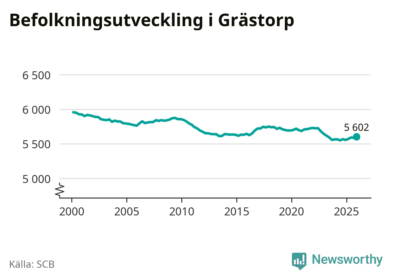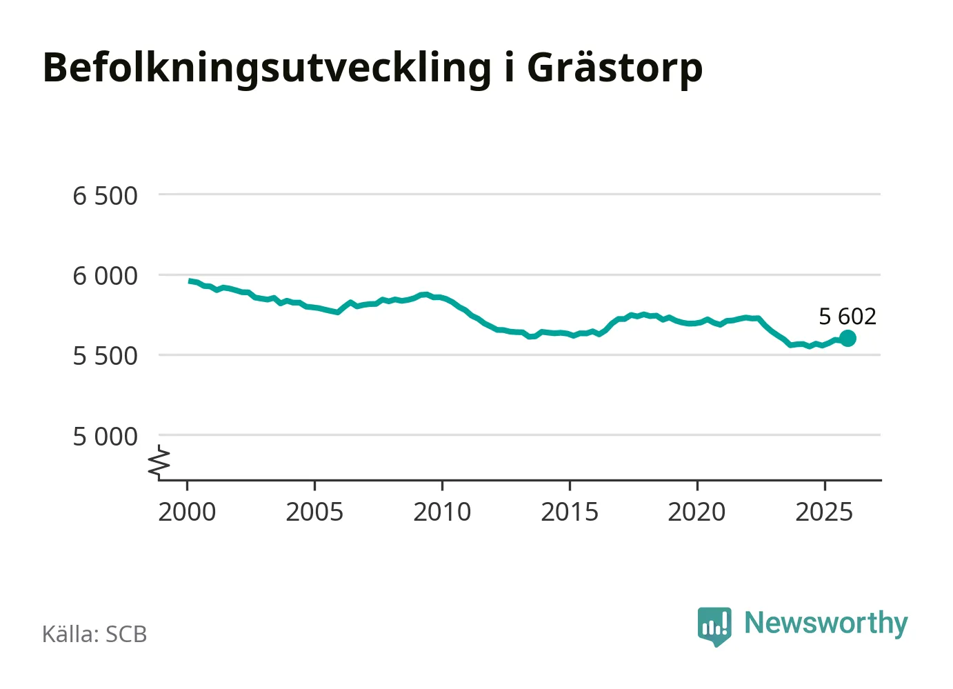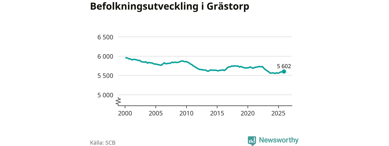 Befolkningen ökade i Grästorps kommun under det fjärde kvartalet 2025. Den 31 december bodde enligt SCB:s senaste siffror 5 602 personer i kommunen, vilket är 16 fler än i slutet av tredje kvartalet. Folkökningen är den tredje största i Västra Götaland procentuellt sett.