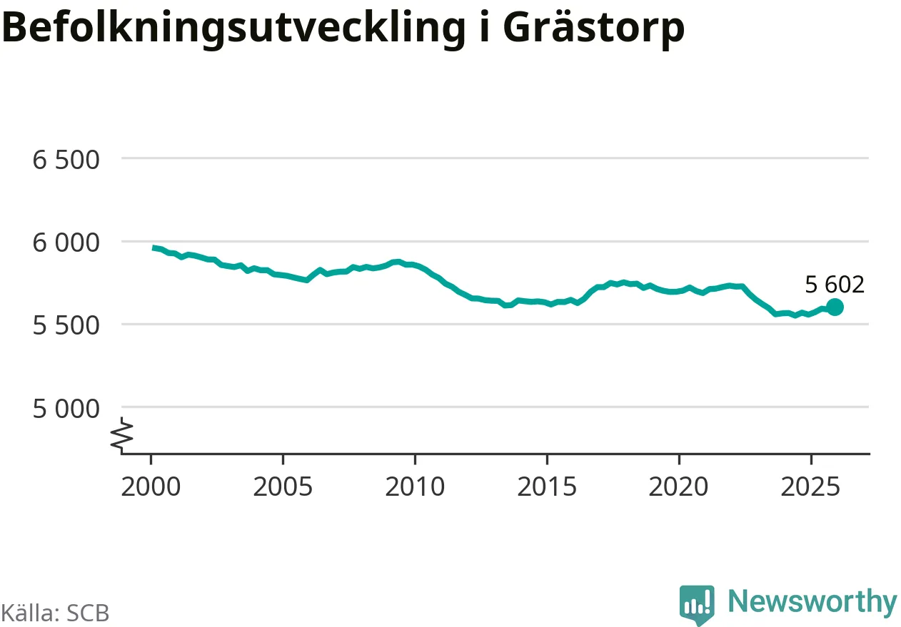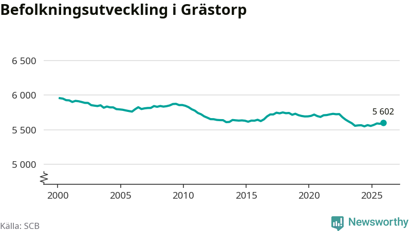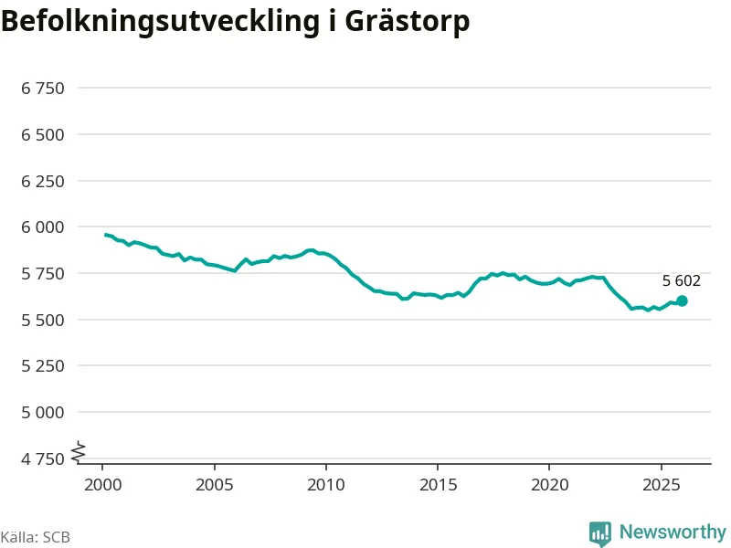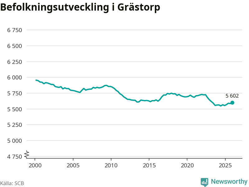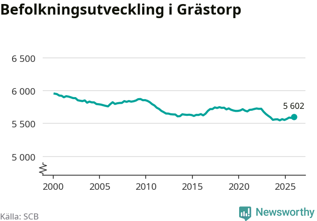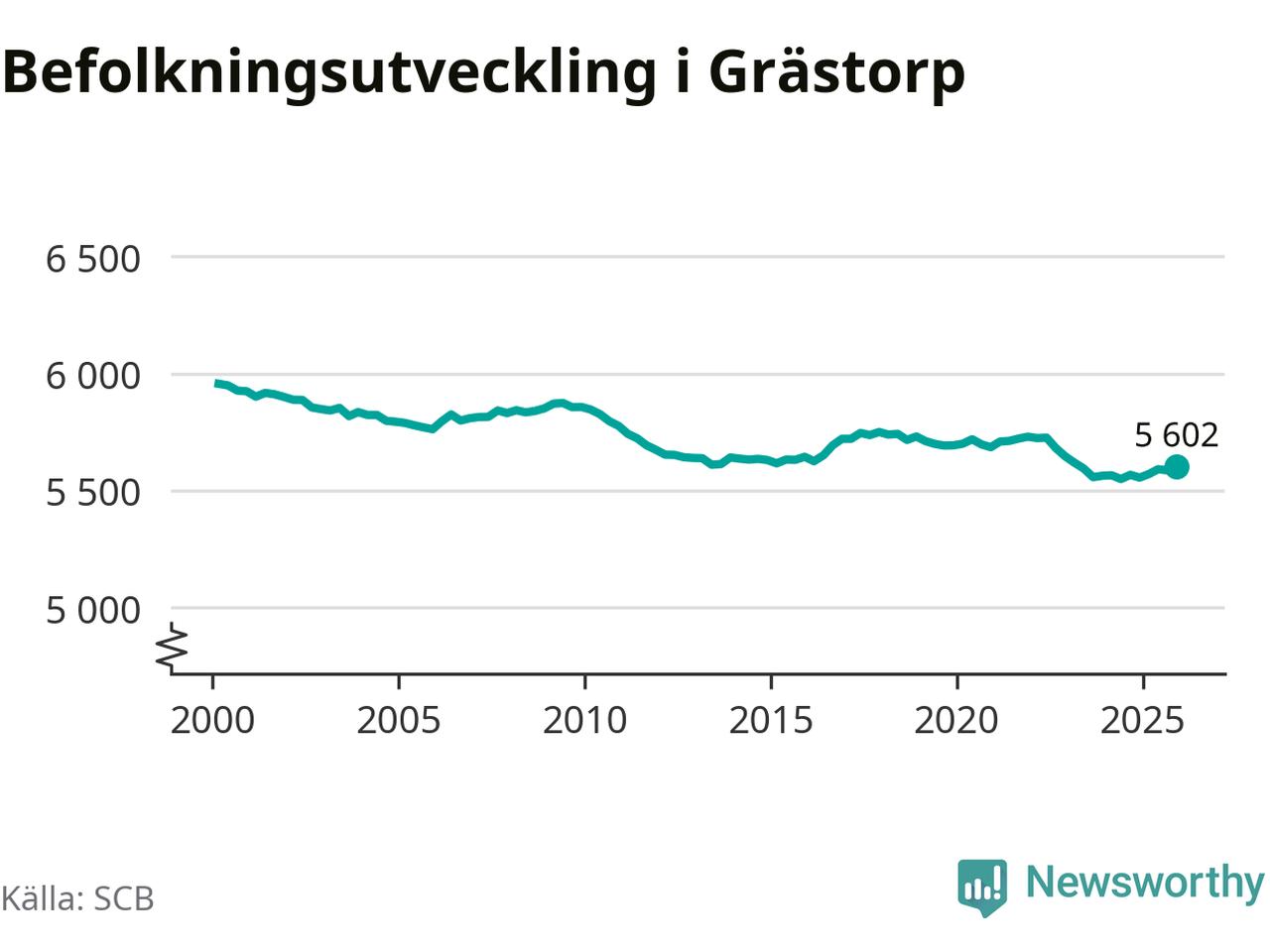Befolkningen ökade i Grästorps kommun under det fjärde kvartalet 2025. Den 31 december bodde enligt SCB:s senaste siffror 5 602 personer i kommunen, vilket är 16 fler än i slutet av tredje kvartalet. Folkökningen är den tredje största i Västra Götaland procentuellt sett.