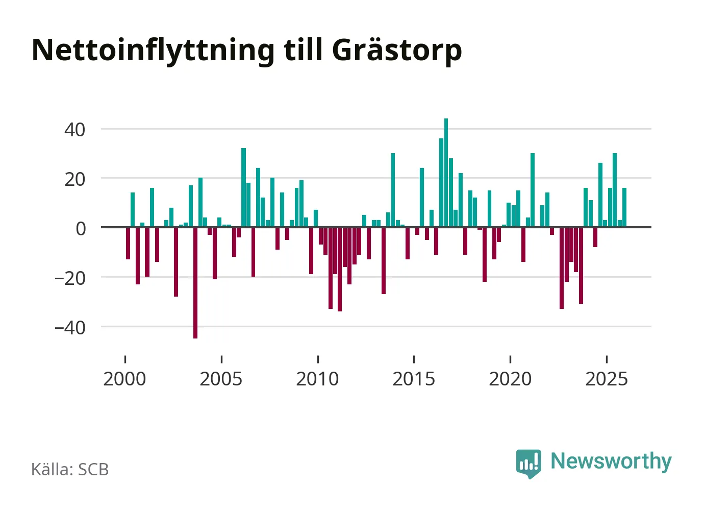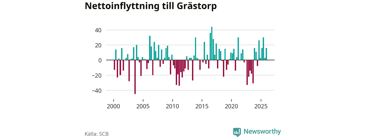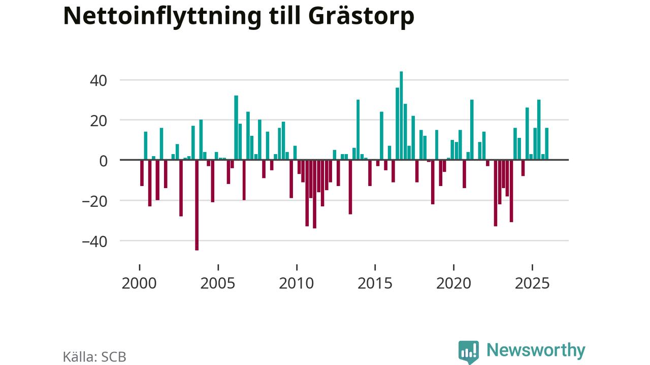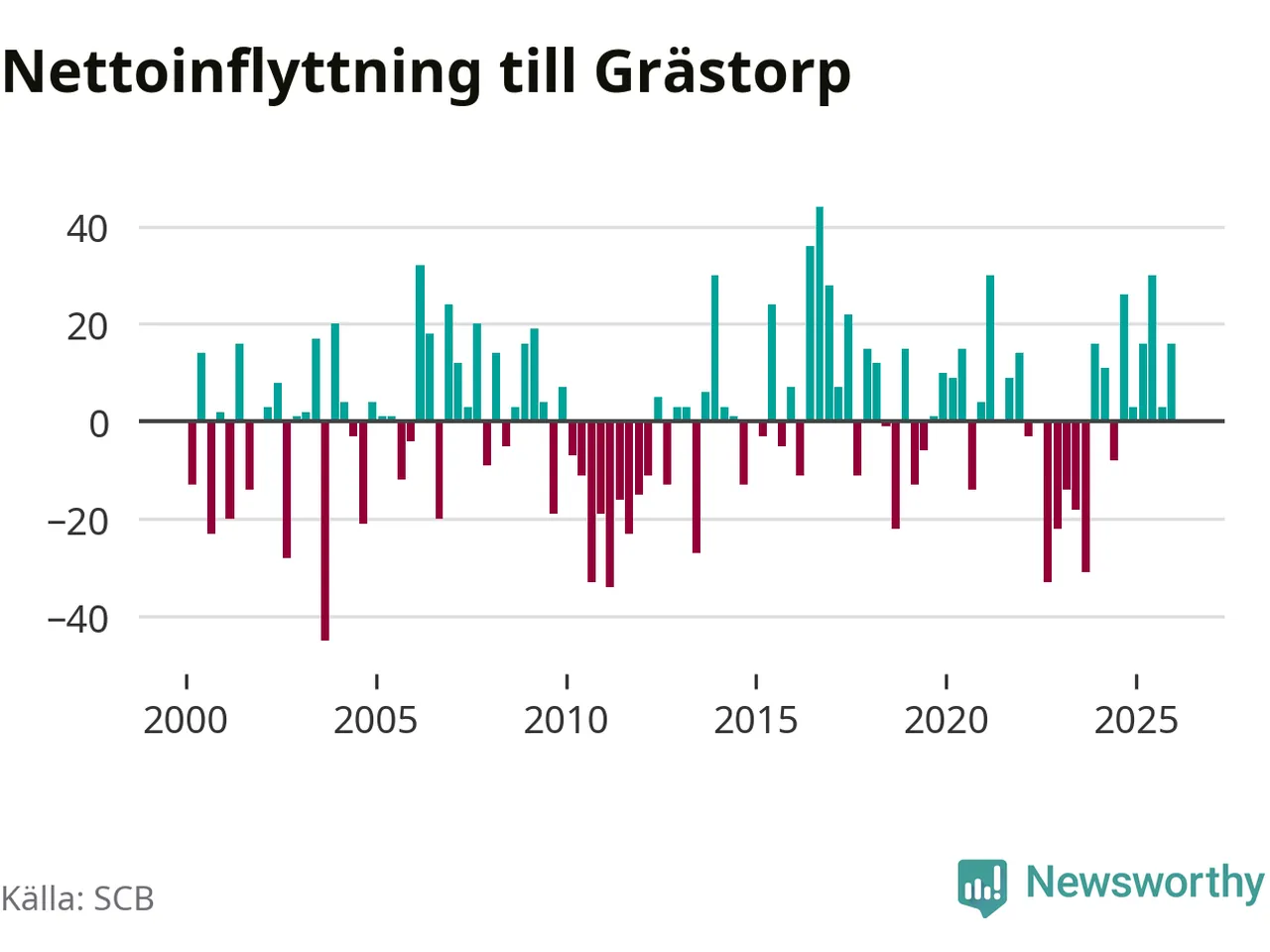 Fler flyttade till än från Grästorps kommun. Befolkningen ökade under det fjärde kvartalet 2025. Det visar nya siffror från SCB.