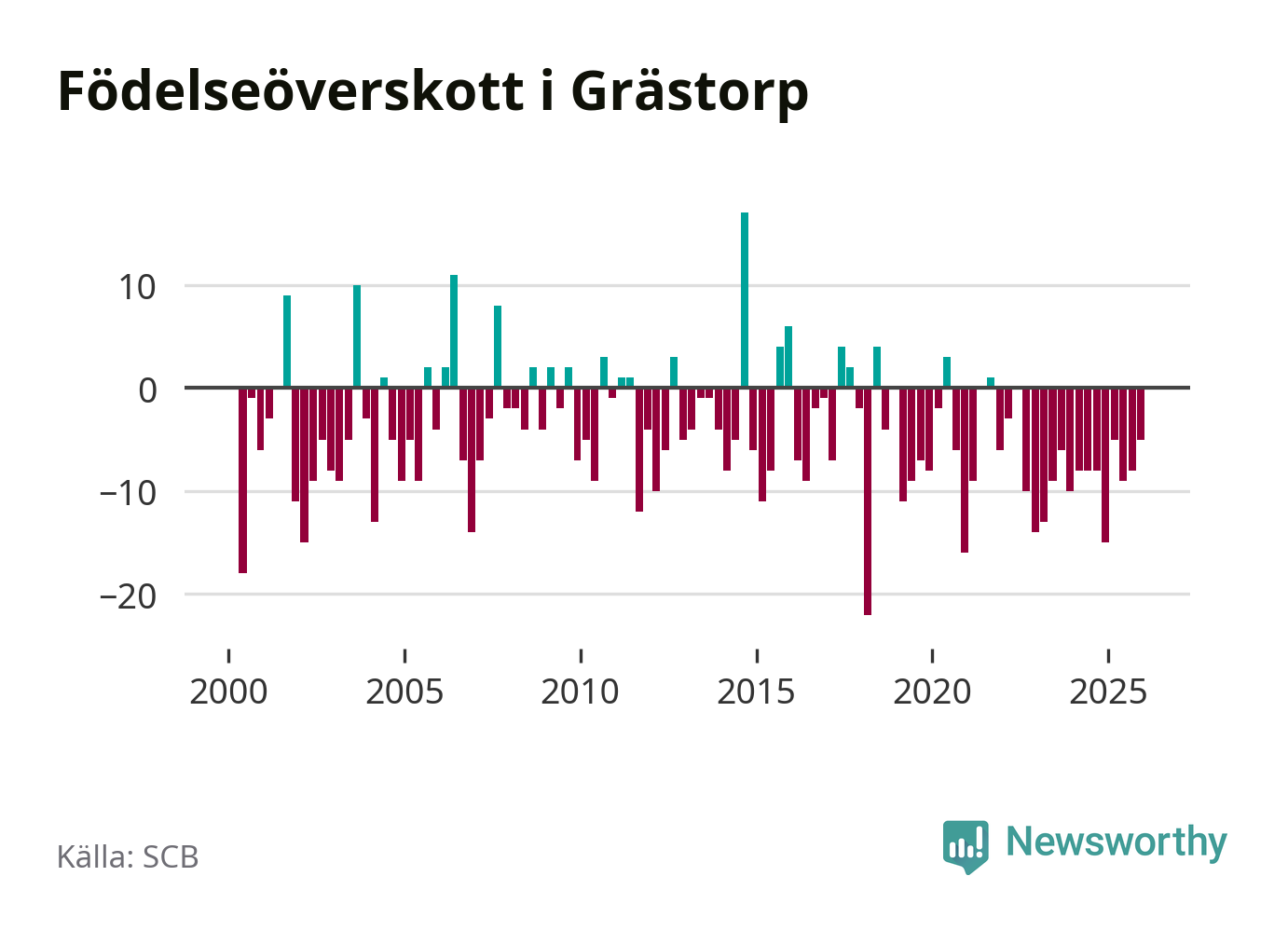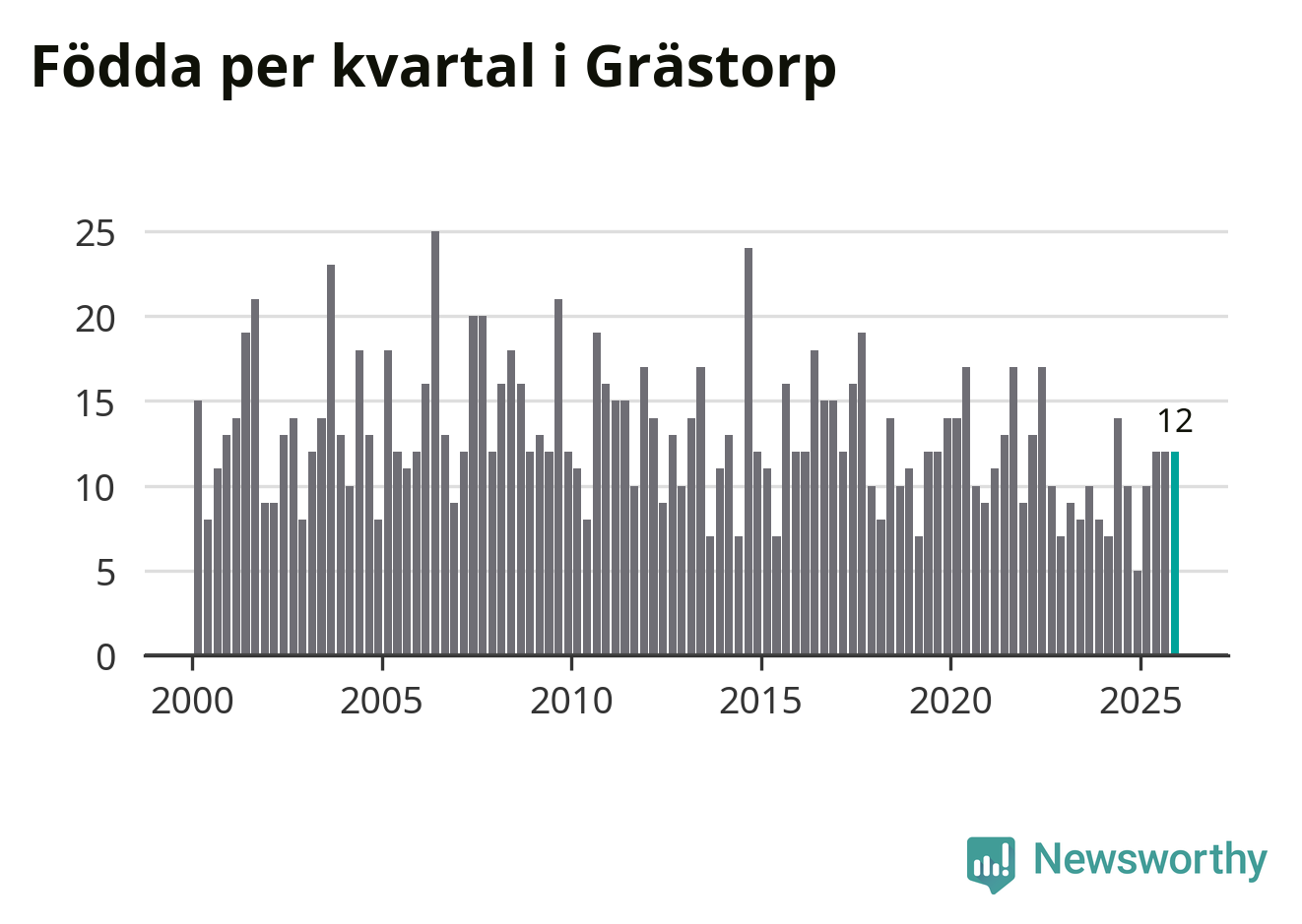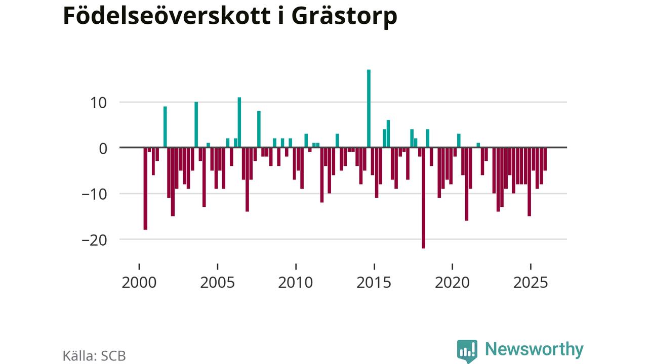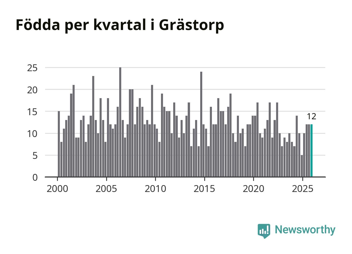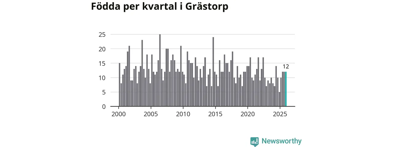 Enligt SCB:s siffror föddes tolv barn i Grästorp under det senaste kvartalet. Samtidigt avled 17 personer. Skillnaden mellan antal födda och döda är så liten att det inte går att säga om det beror på något annat än SCB:s röjandeskydd. Kommunen har oftast haft negativt födelsenetto tidigare.