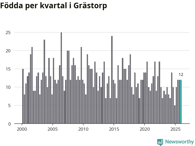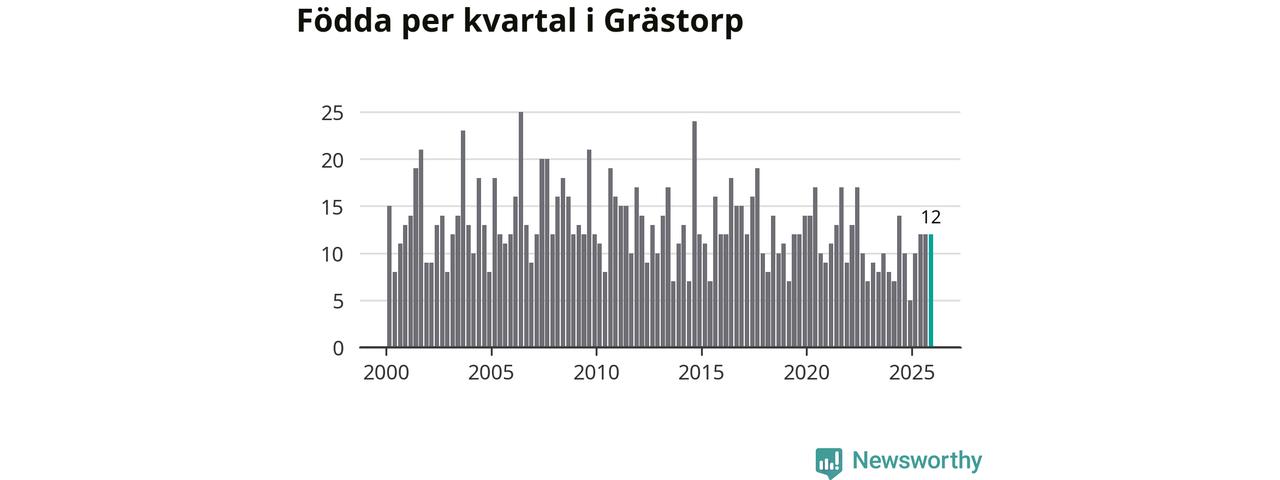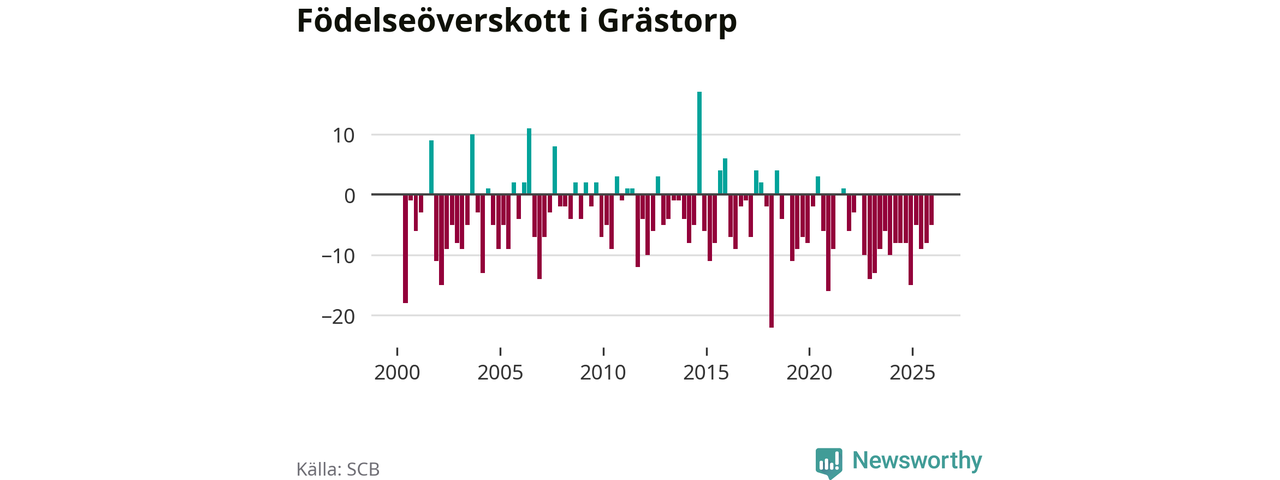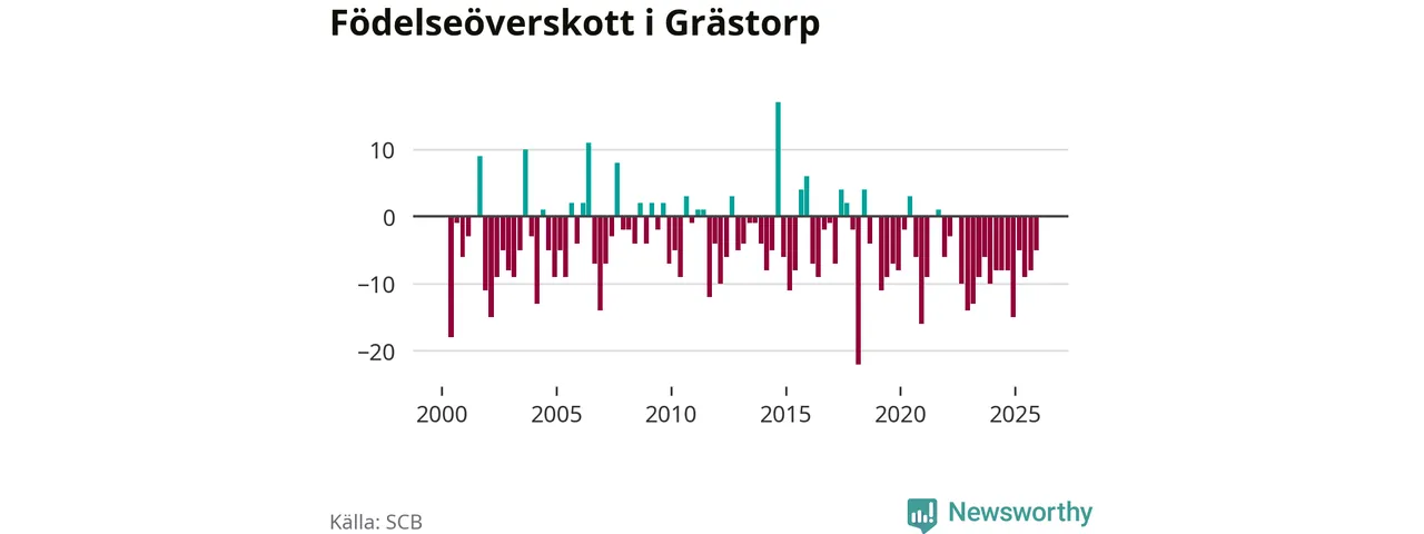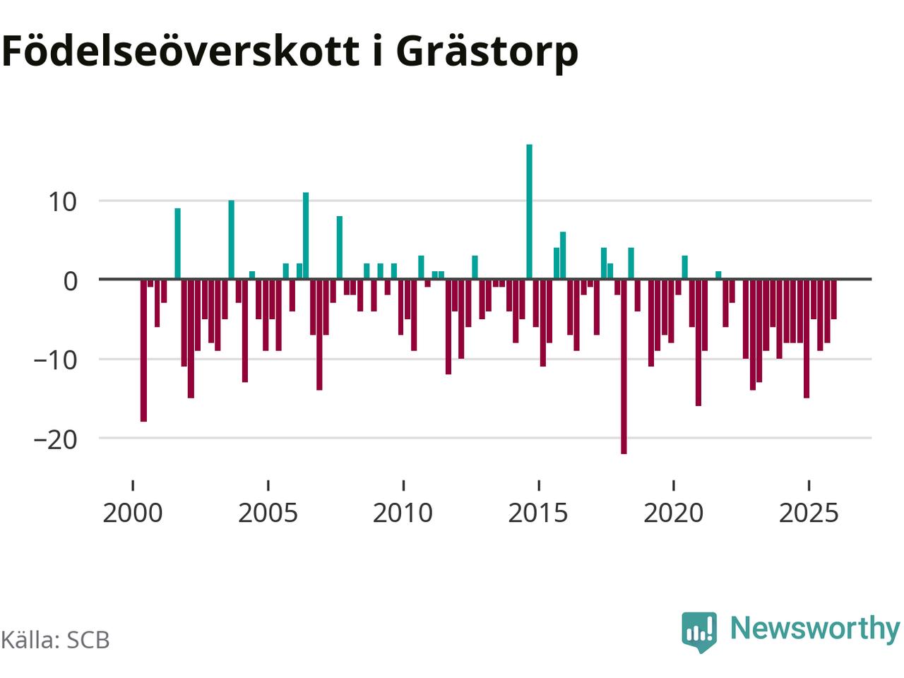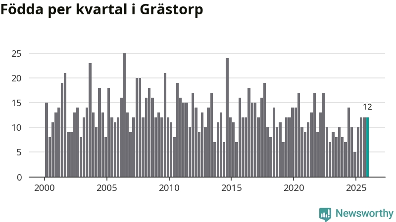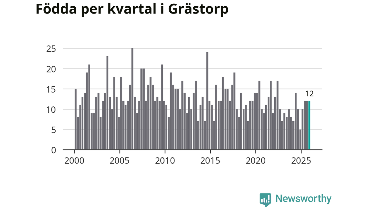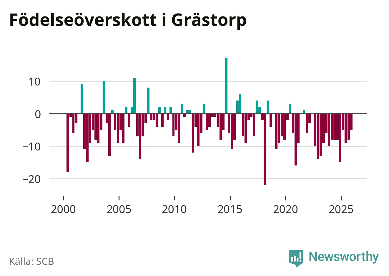 Enligt SCB:s siffror föddes tolv barn i Grästorp under det senaste kvartalet. Samtidigt avled 17 personer. Skillnaden mellan antal födda och döda är så liten att det inte går att säga om det beror på något annat än SCB:s röjandeskydd. Kommunen har oftast haft negativt födelsenetto tidigare.