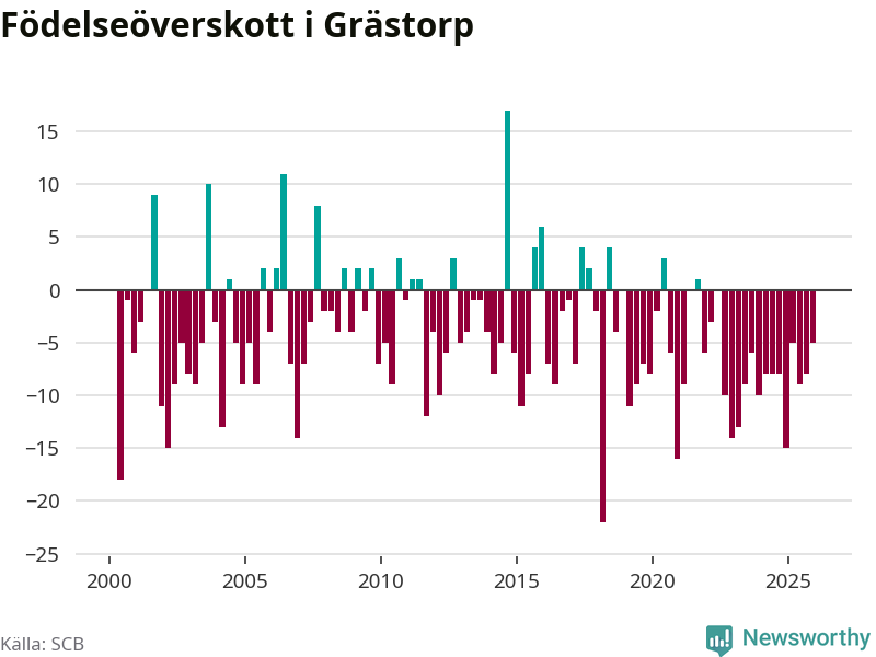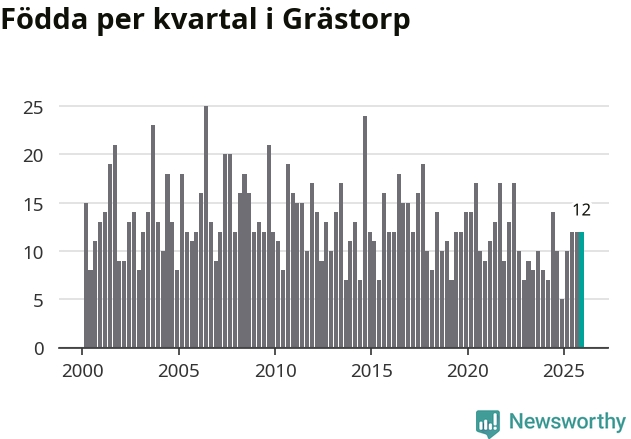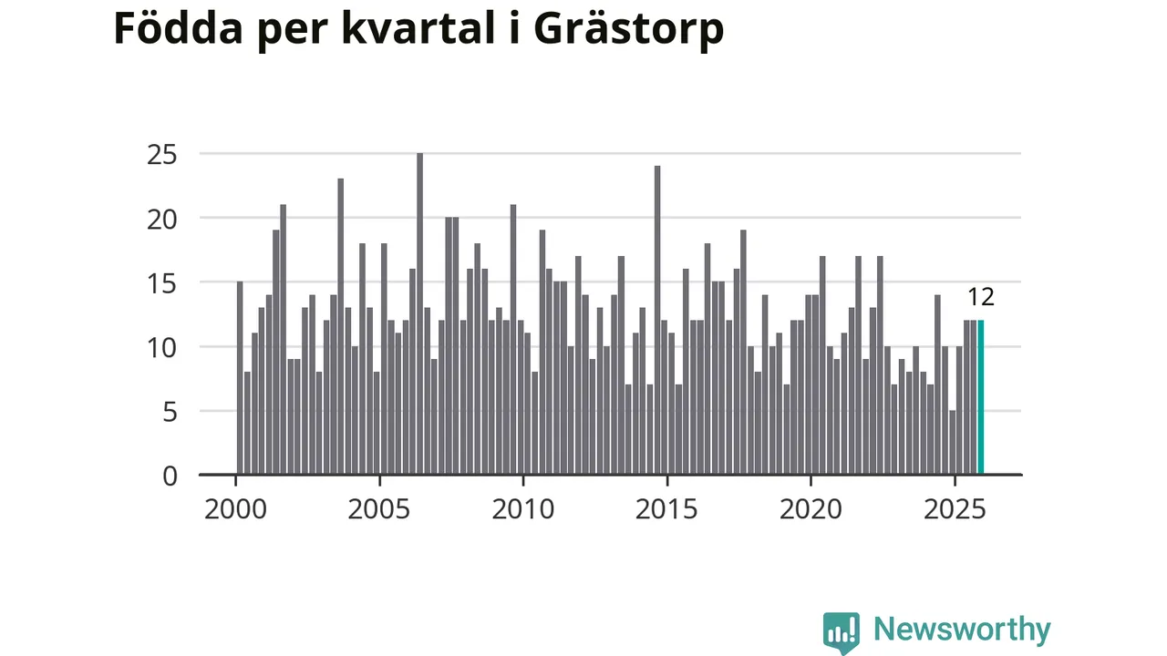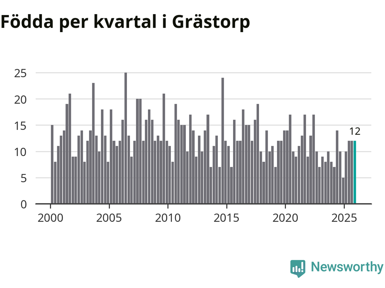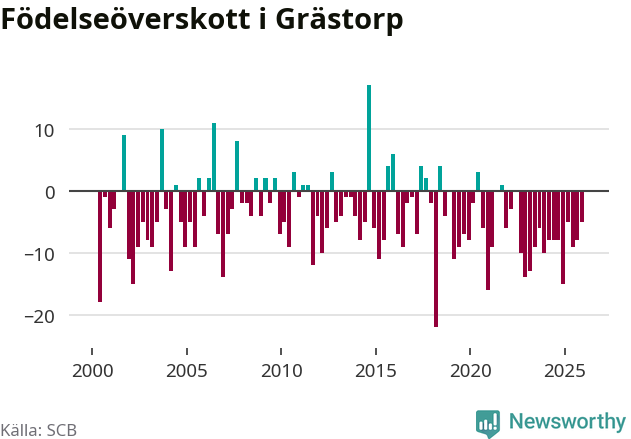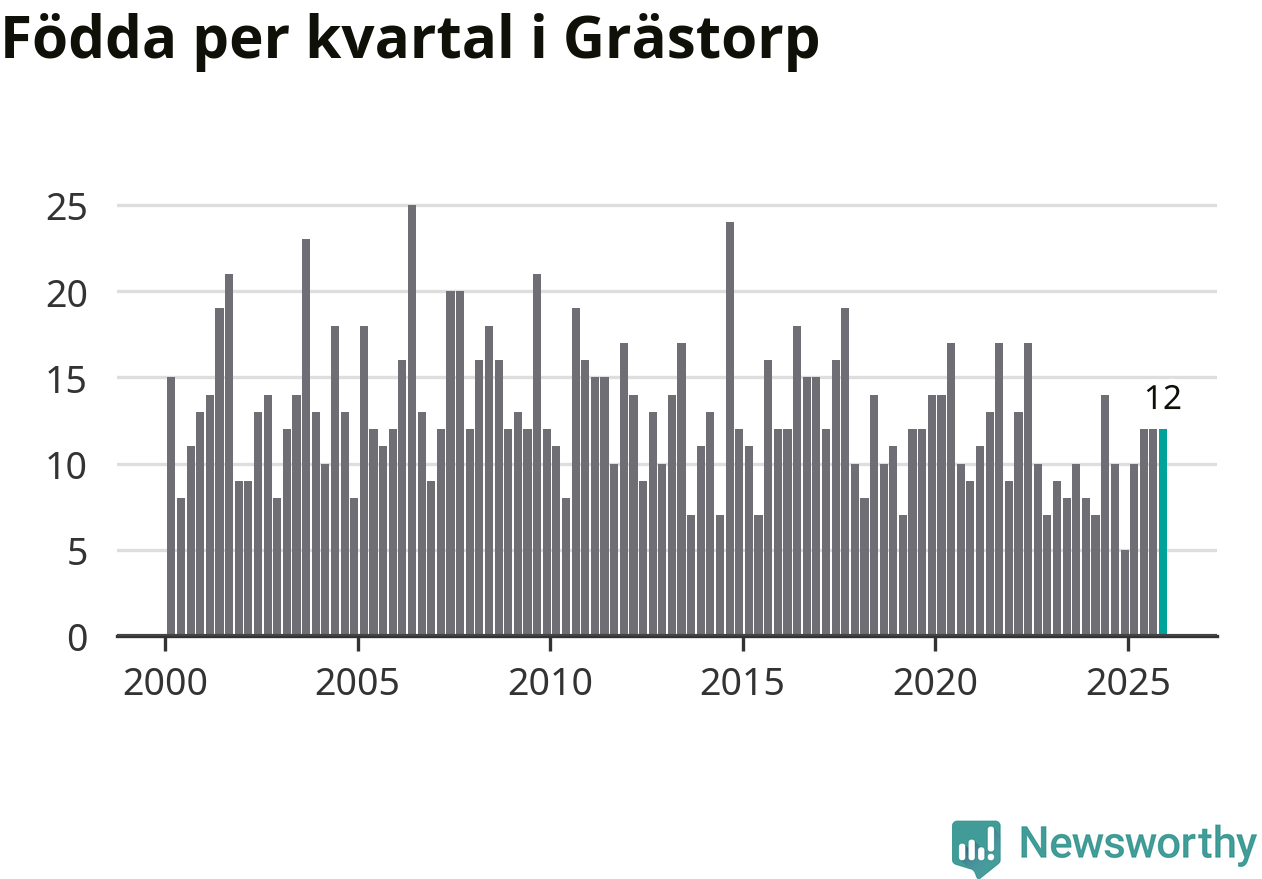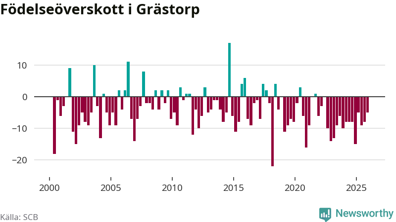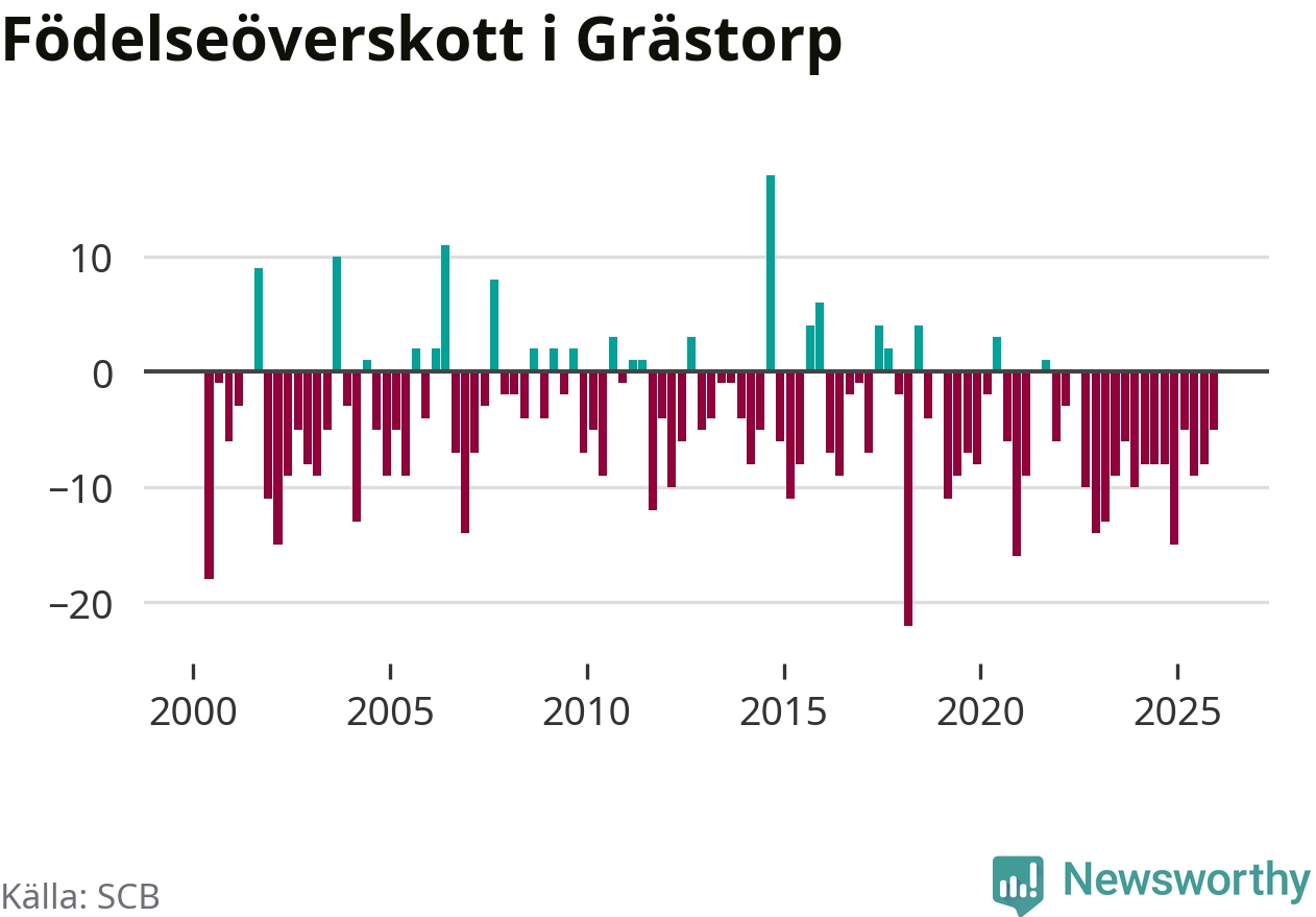 Enligt SCB:s siffror föddes tolv barn i Grästorp under det senaste kvartalet. Samtidigt avled 17 personer. Skillnaden mellan antal födda och döda är så liten att det inte går att säga om det beror på något annat än SCB:s röjandeskydd. Kommunen har oftast haft negativt födelsenetto tidigare.