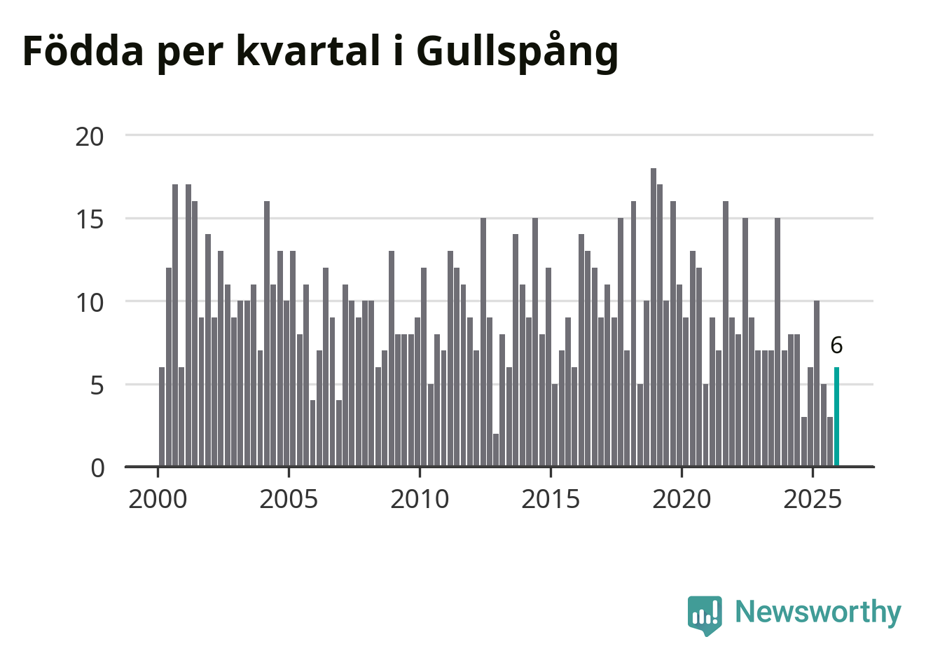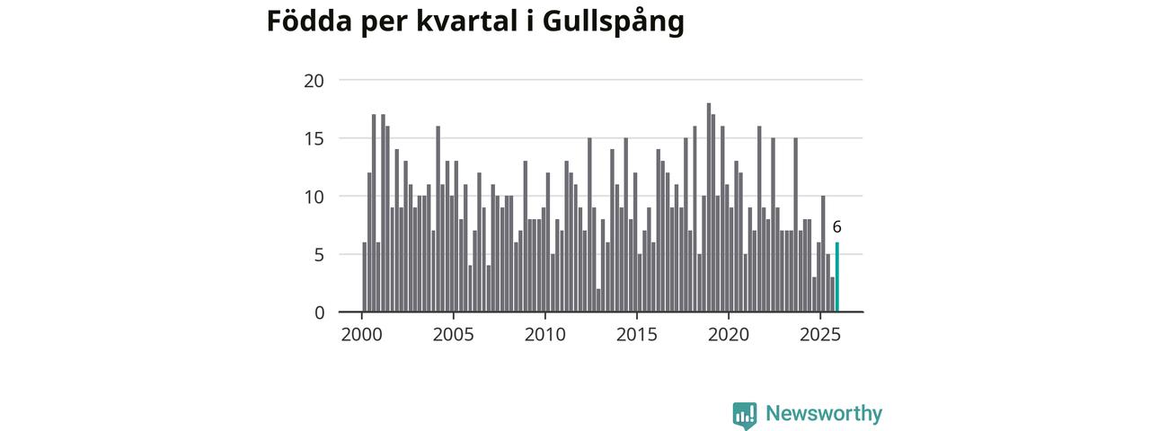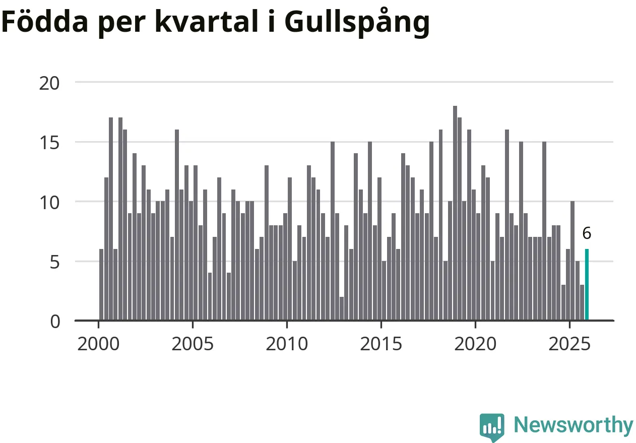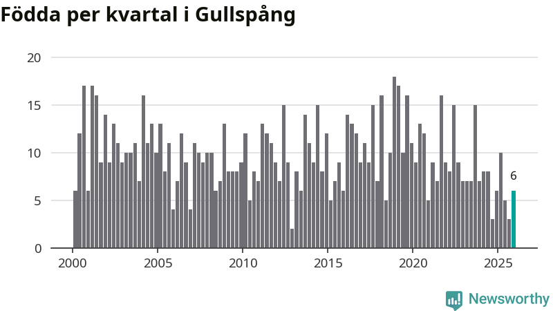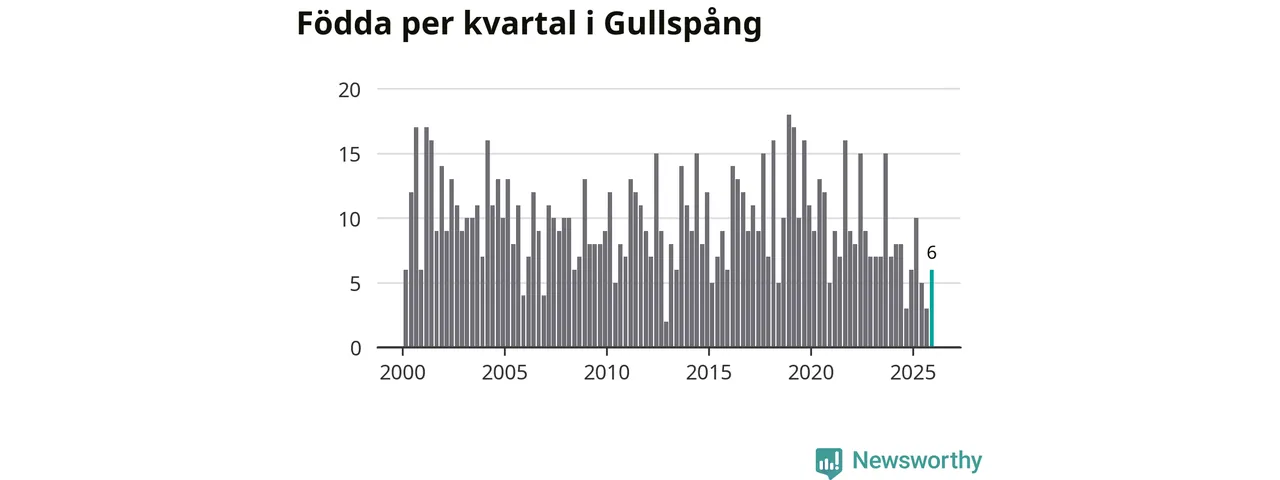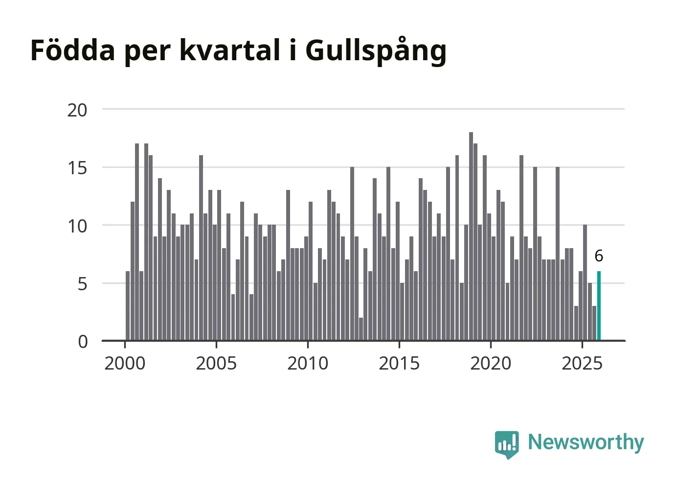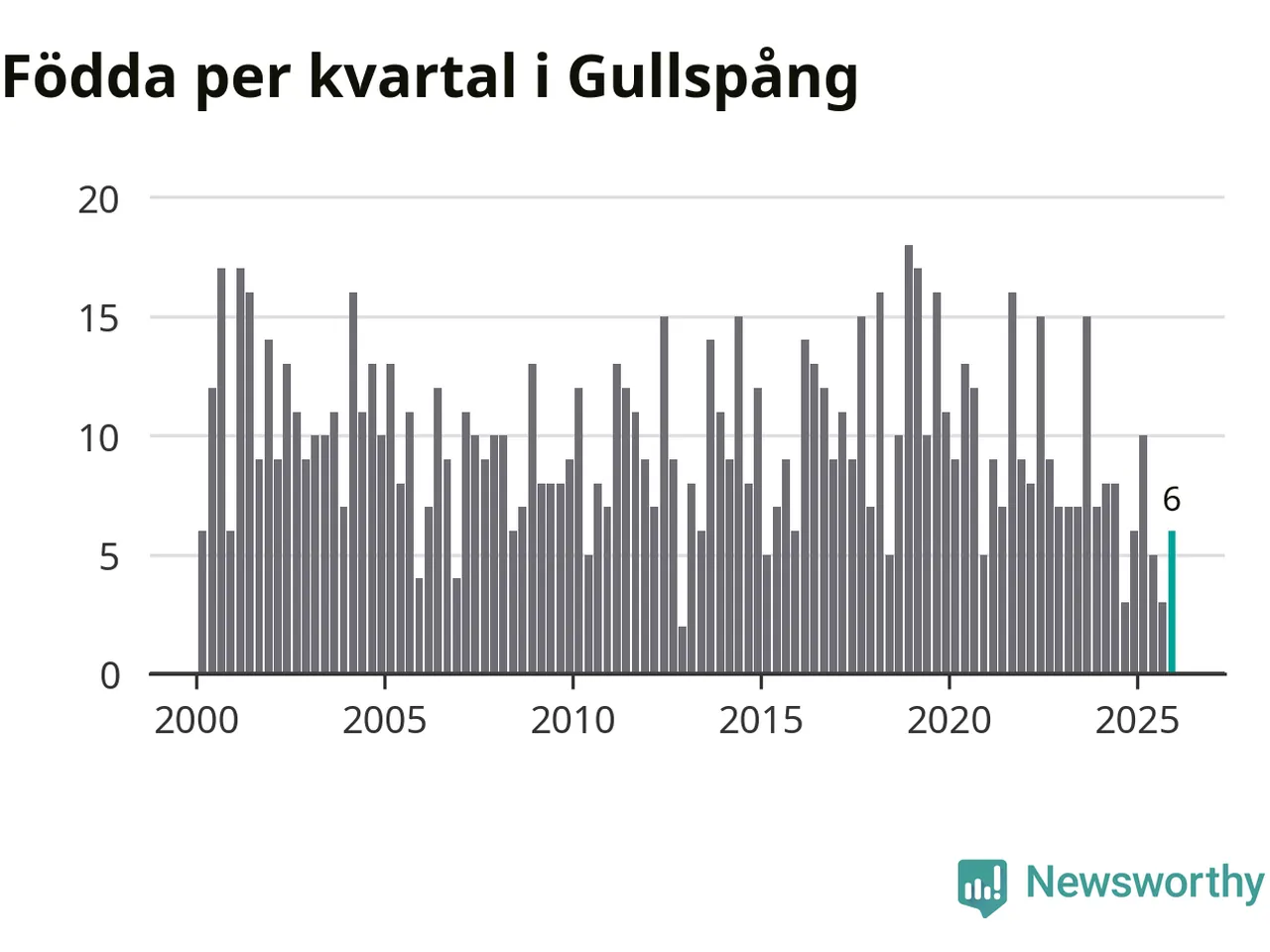 Enligt SCB:s siffror föddes sex barn i Gullspång under det senaste kvartalet. Samtidigt avled 22 personer. Gullspång hade alltså ett negativt födelsenetto, vilket kommunen historiskt sett nästan alltid har haft.