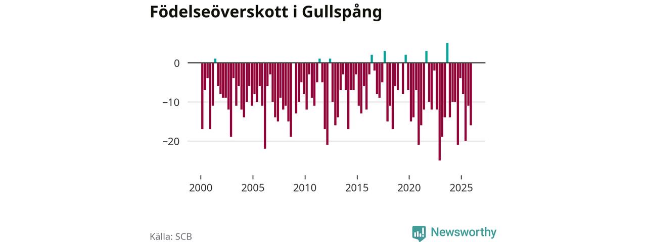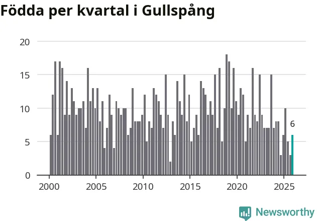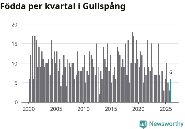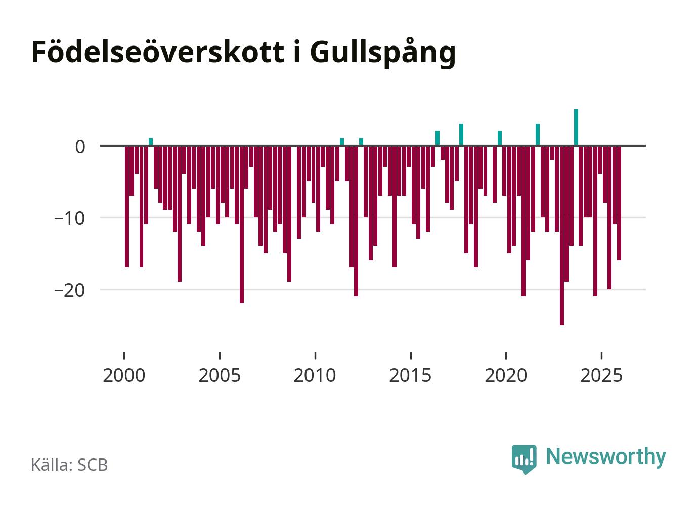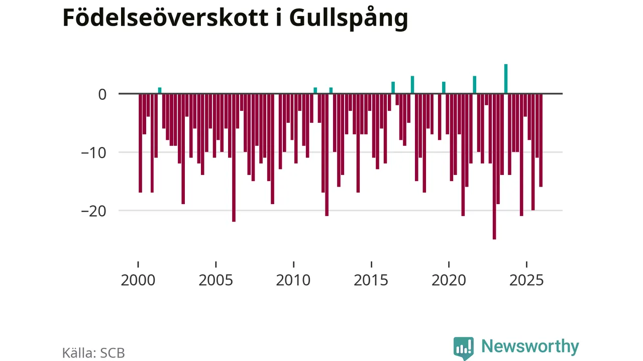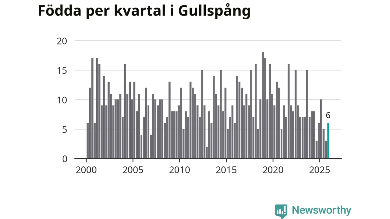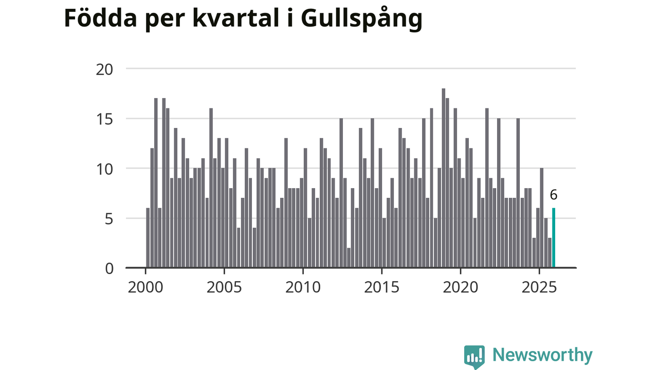 Enligt SCB:s siffror föddes sex barn i Gullspång under det senaste kvartalet. Samtidigt avled 22 personer. Gullspång hade alltså ett negativt födelsenetto, vilket kommunen historiskt sett nästan alltid har haft.