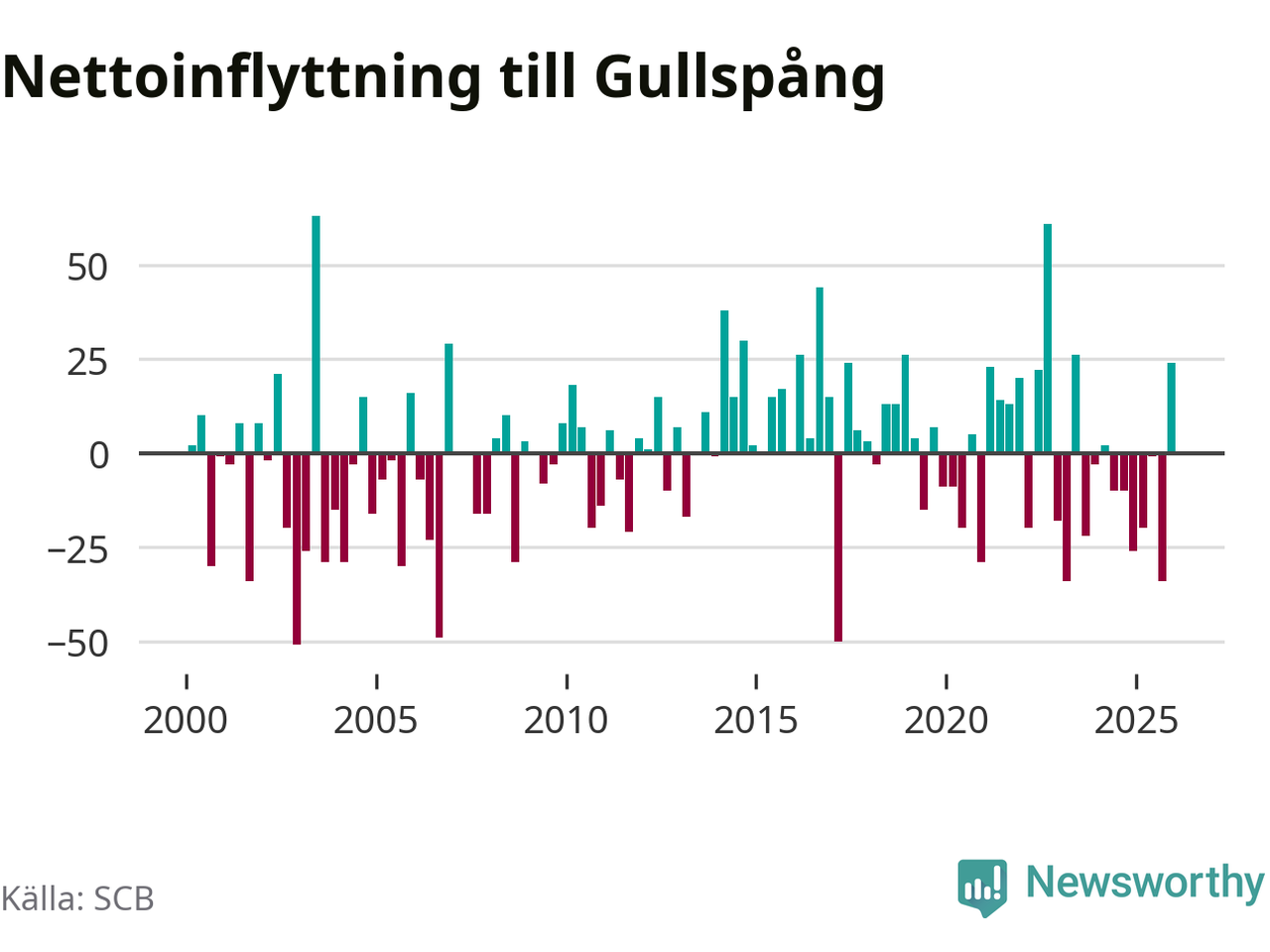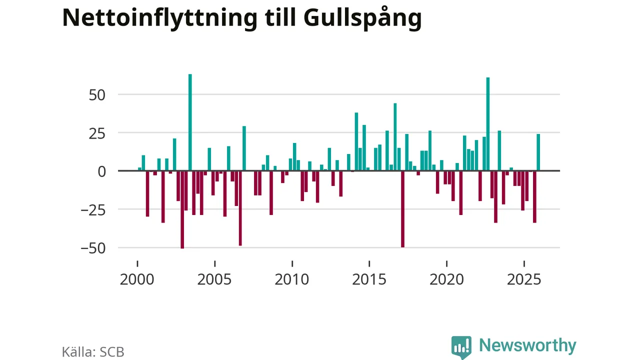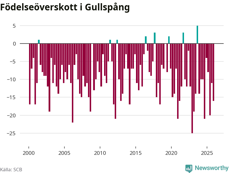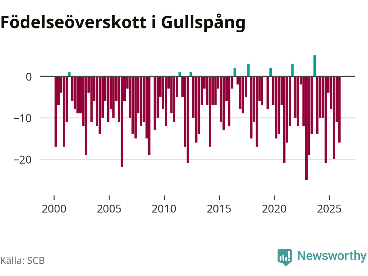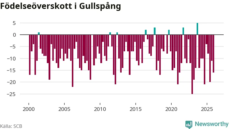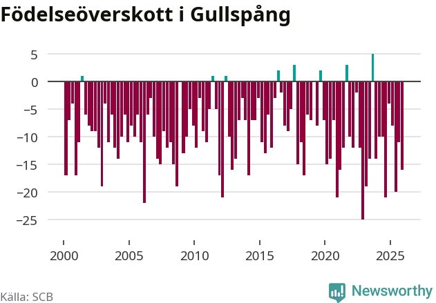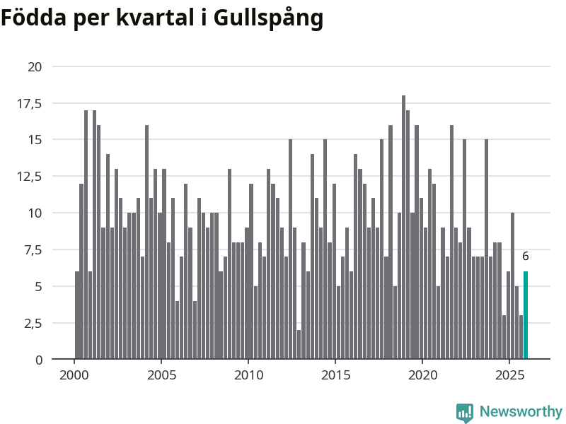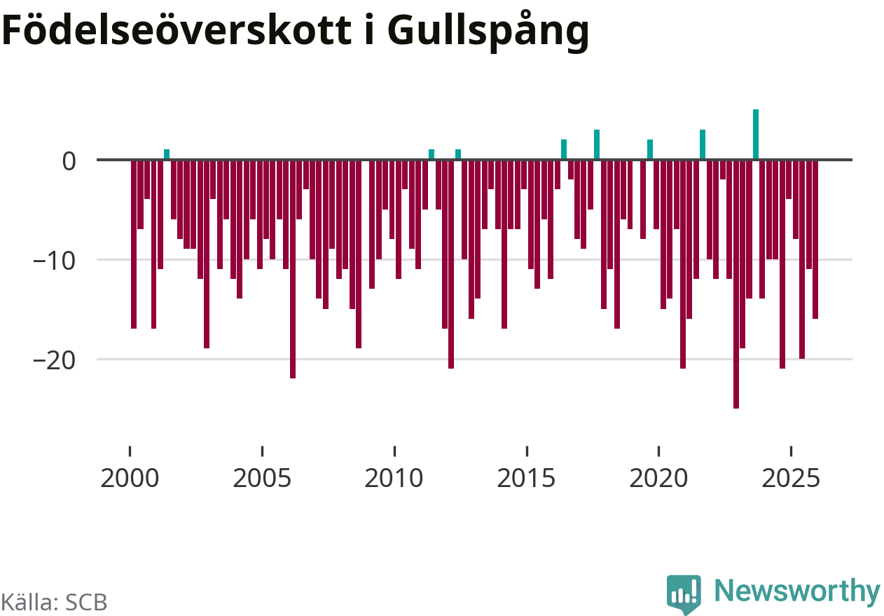 Enligt SCB:s siffror föddes sex barn i Gullspång under det senaste kvartalet. Samtidigt avled 22 personer. Gullspång hade alltså ett negativt födelsenetto, vilket kommunen historiskt sett nästan alltid har haft.