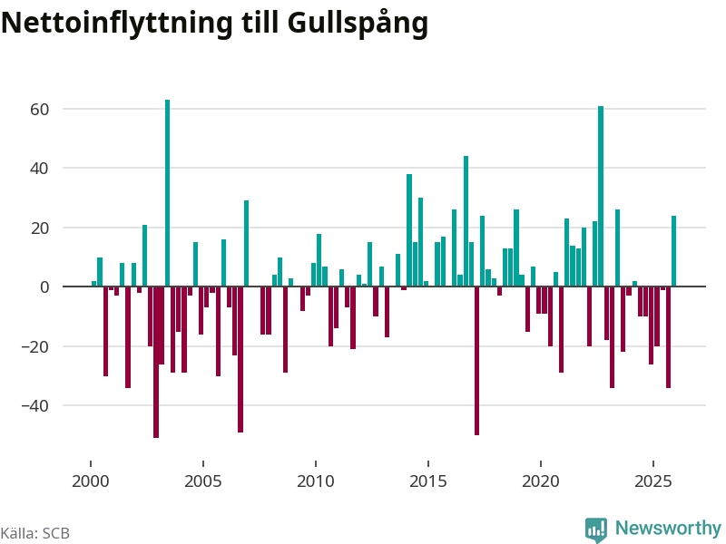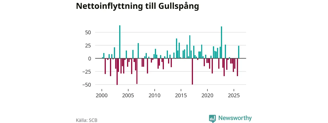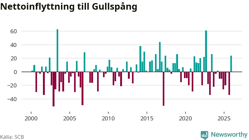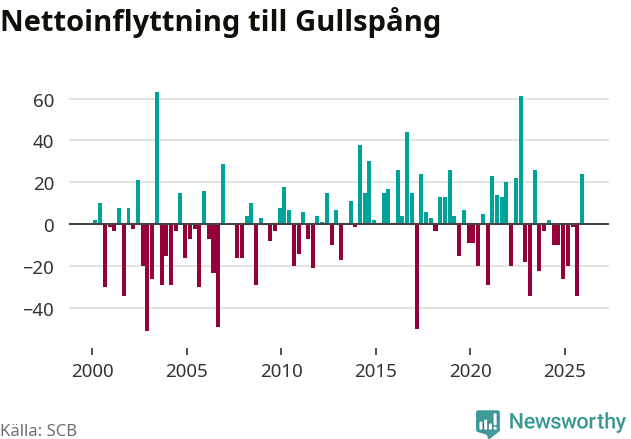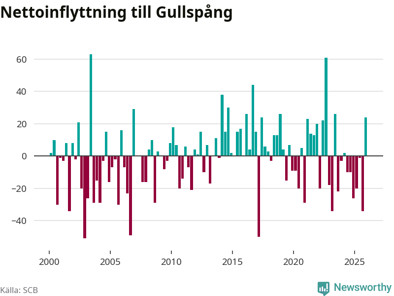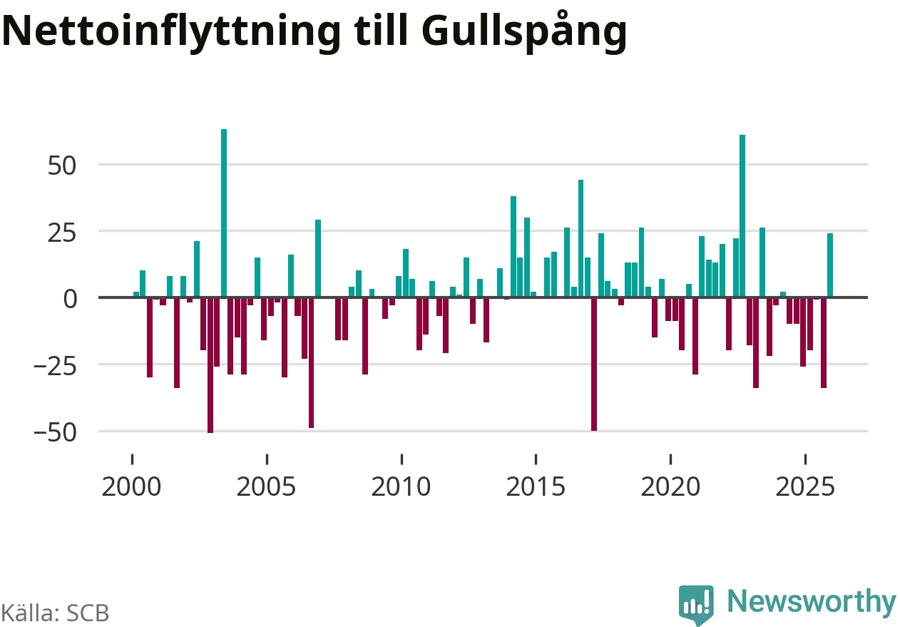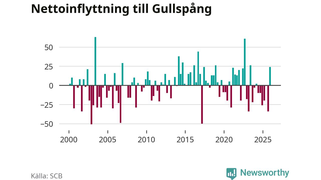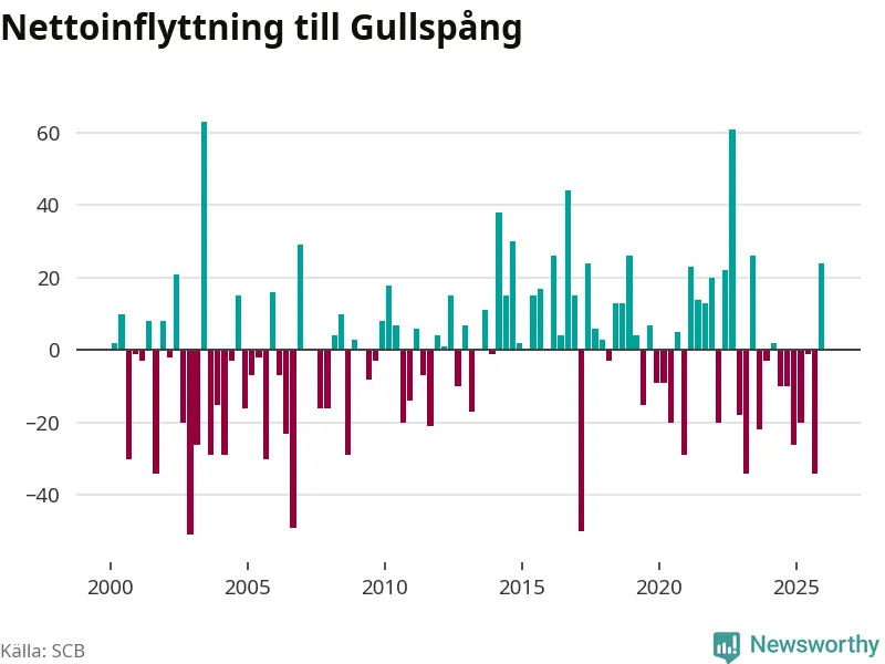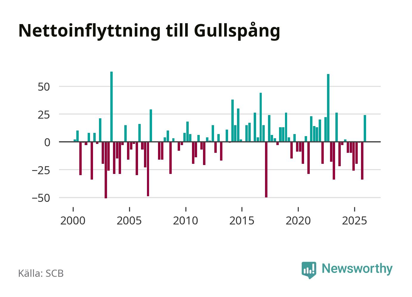 Under fjärde kvartalet 2025 flyttade 84 personer till kommunen medan 60 personer flyttade därifrån. Sedan seklets början har Gullspång haft ungefär lika många kvartal med positivt flyttnetto som negativt, inklusive det senaste kvartalet.