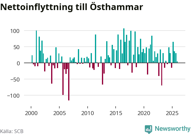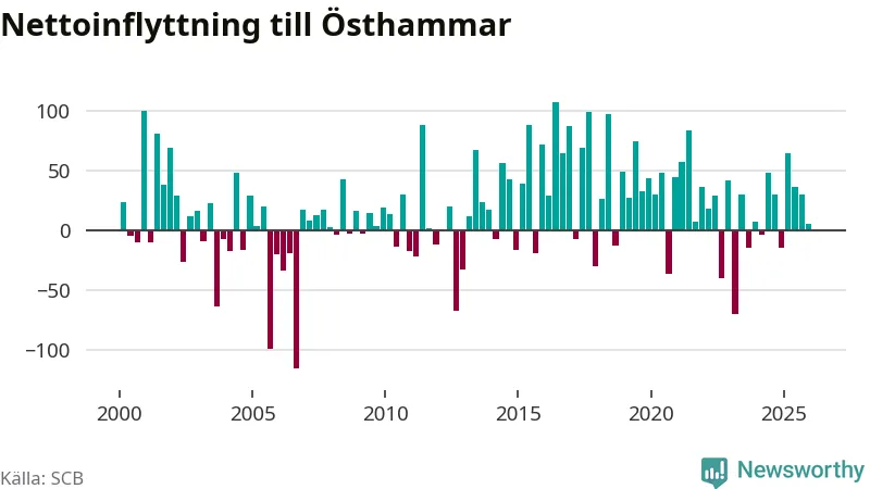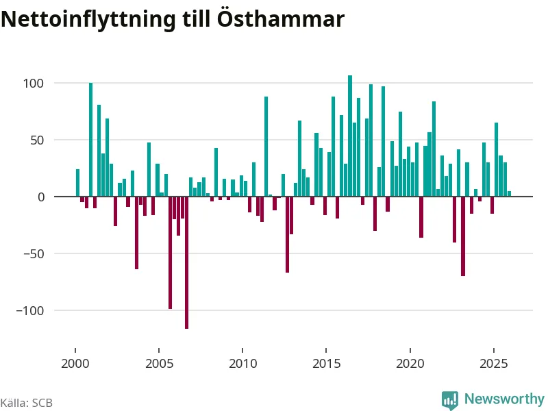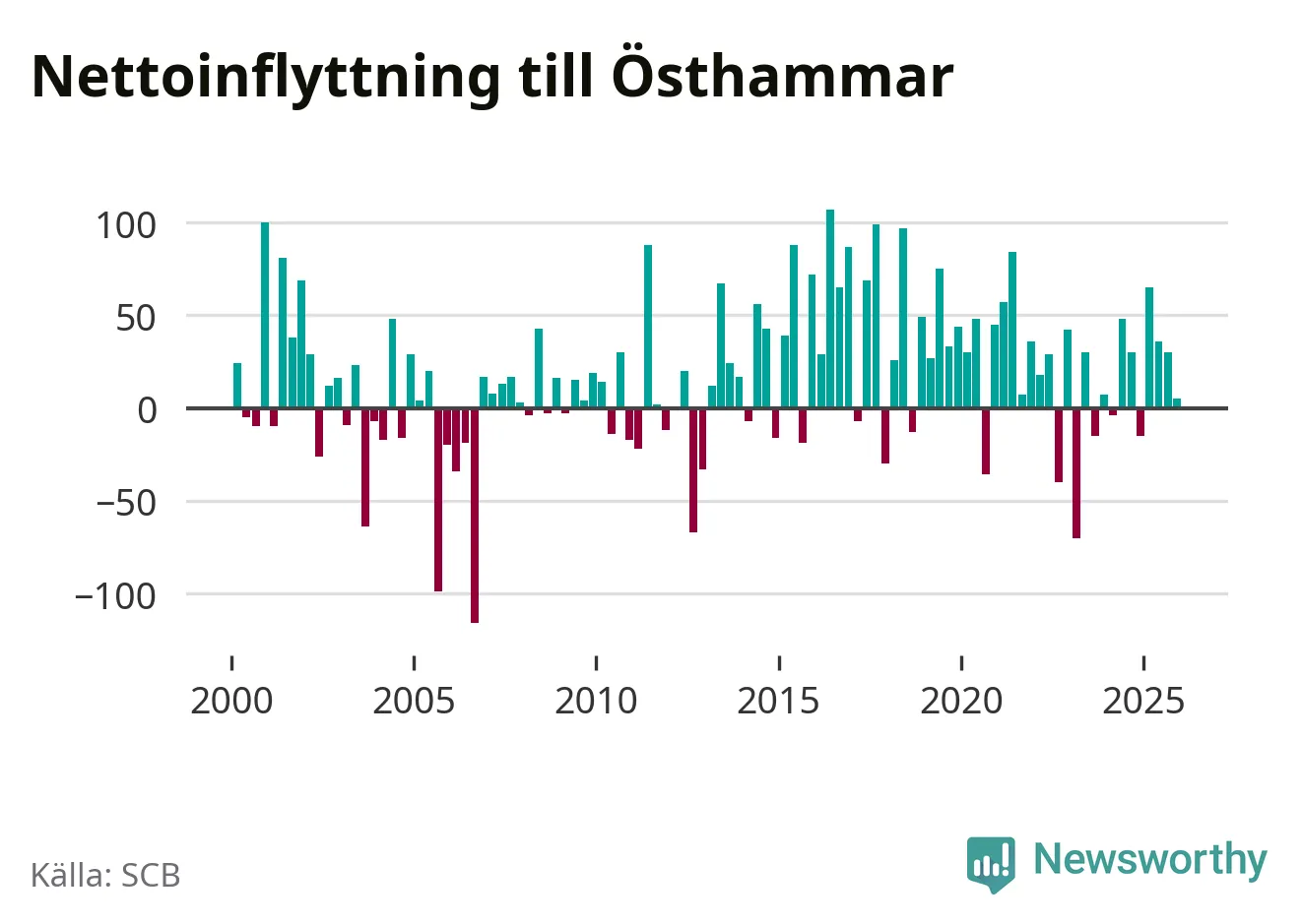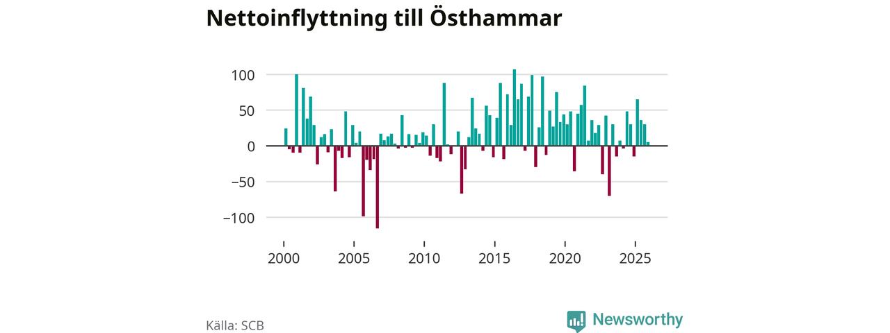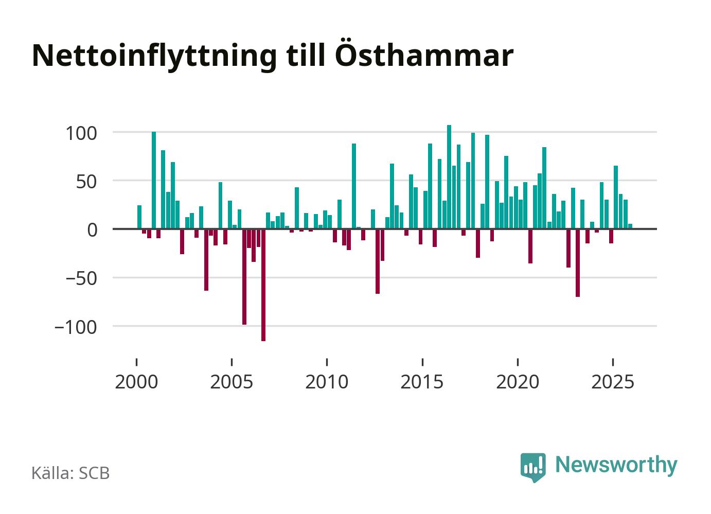 Under fjärde kvartalet 2025 flyttade 225 personer till kommunen medan 220 personer flyttade därifrån. Skillnaden mellan antalet in- och utflyttade är så liten att den lika gärna kan bero på SCB:s slumpmässiga brus. Sedan seklets början har Östhammar oftast haft ett positivt flyttnetto.