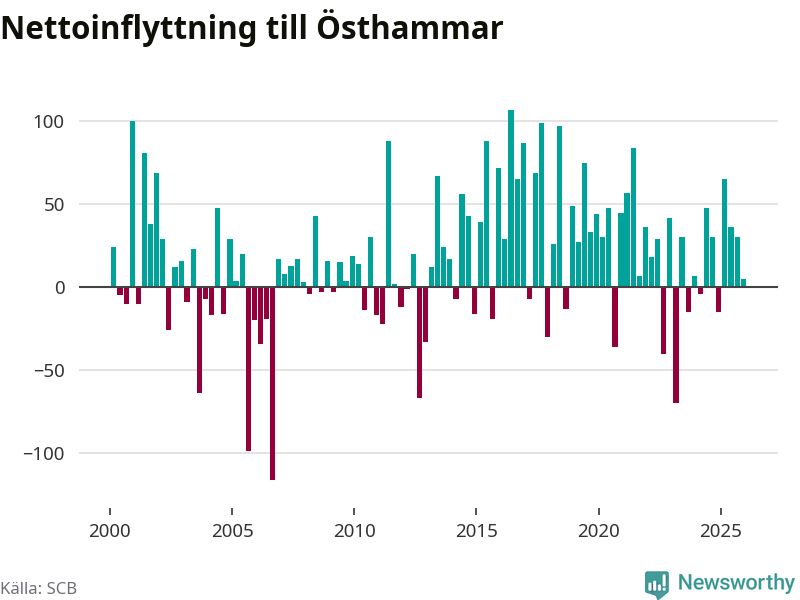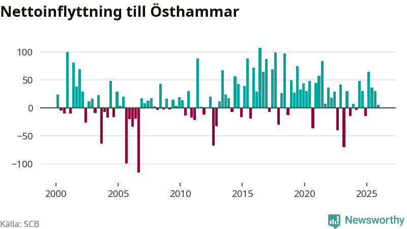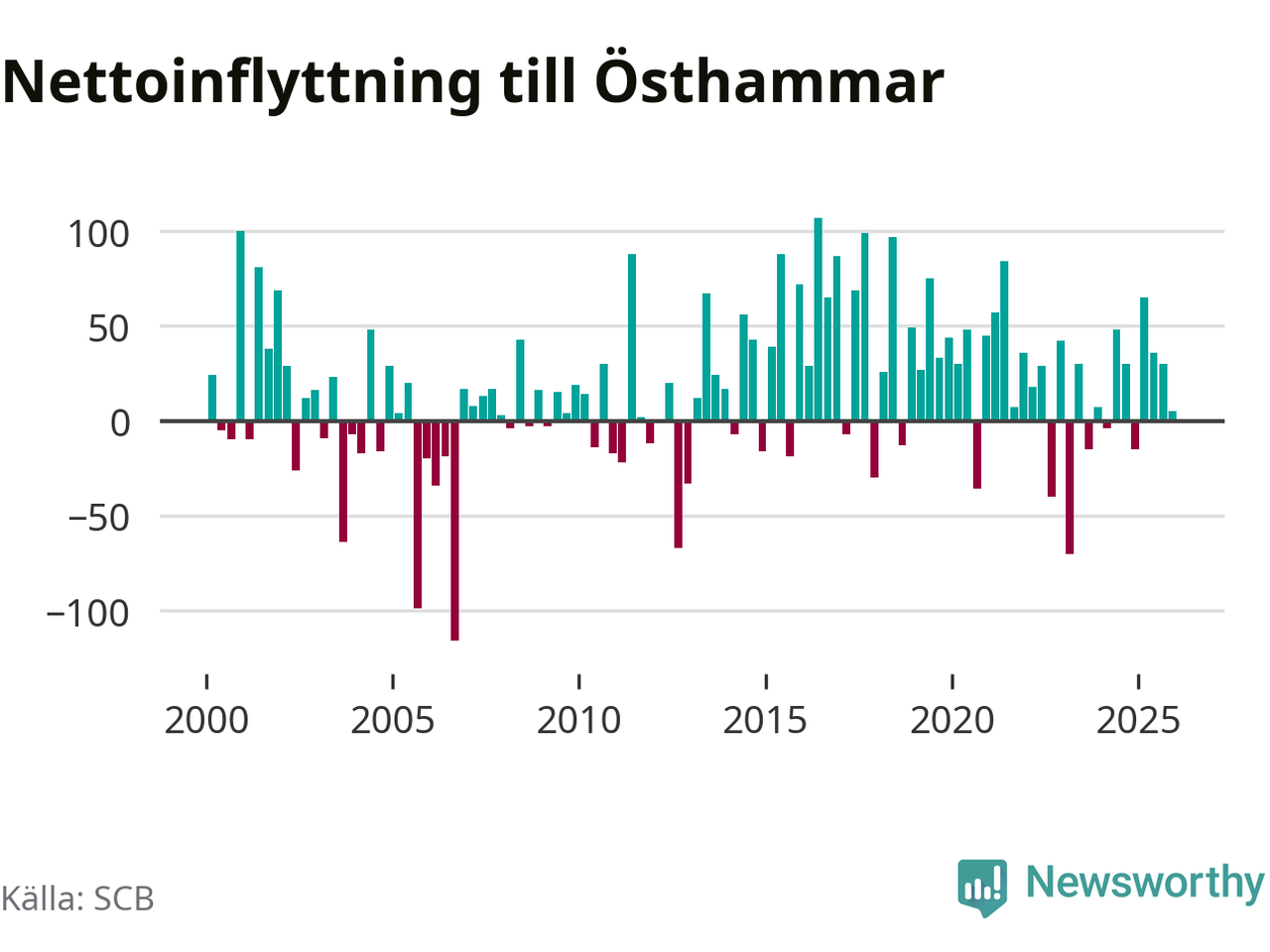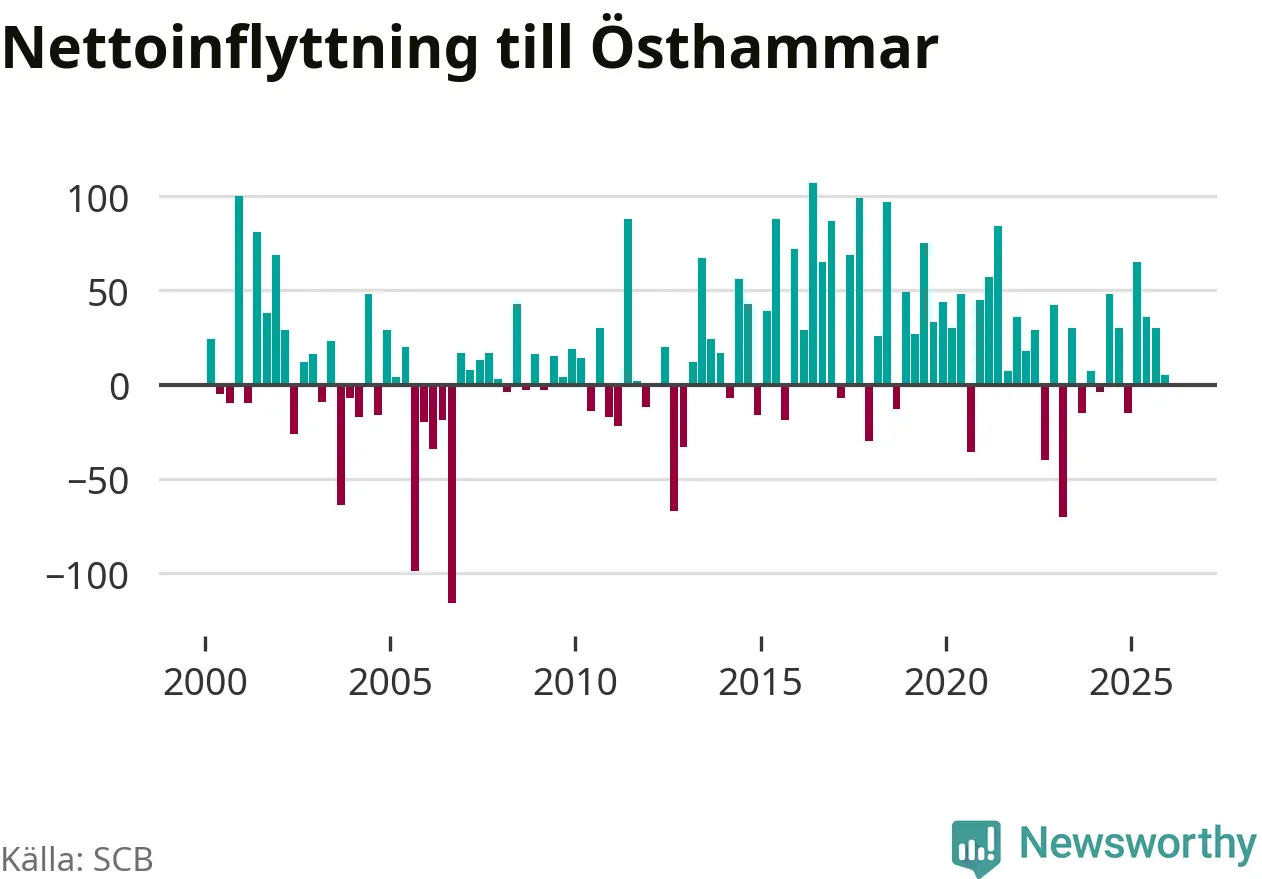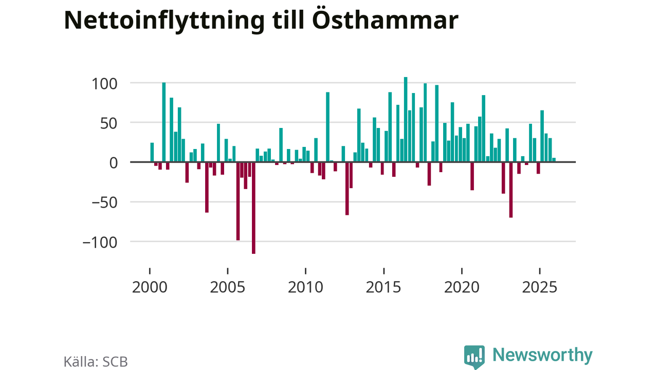 Under fjärde kvartalet 2025 flyttade 225 personer till kommunen medan 220 personer flyttade därifrån. Skillnaden mellan antalet in- och utflyttade är så liten att den lika gärna kan bero på SCB:s slumpmässiga brus. Sedan seklets början har Östhammar oftast haft ett positivt flyttnetto.
