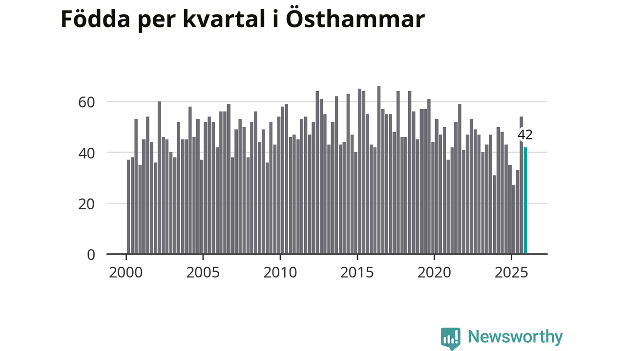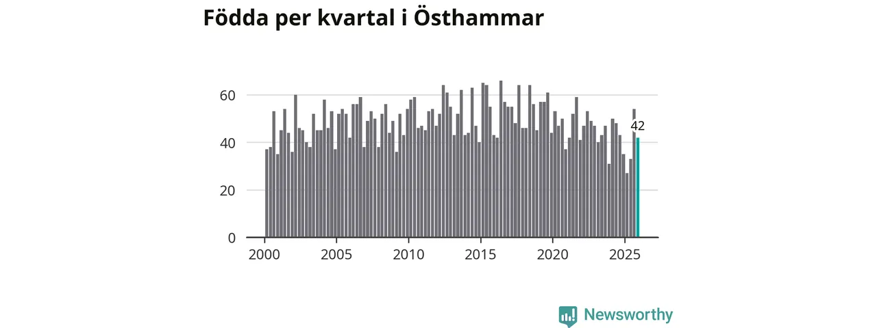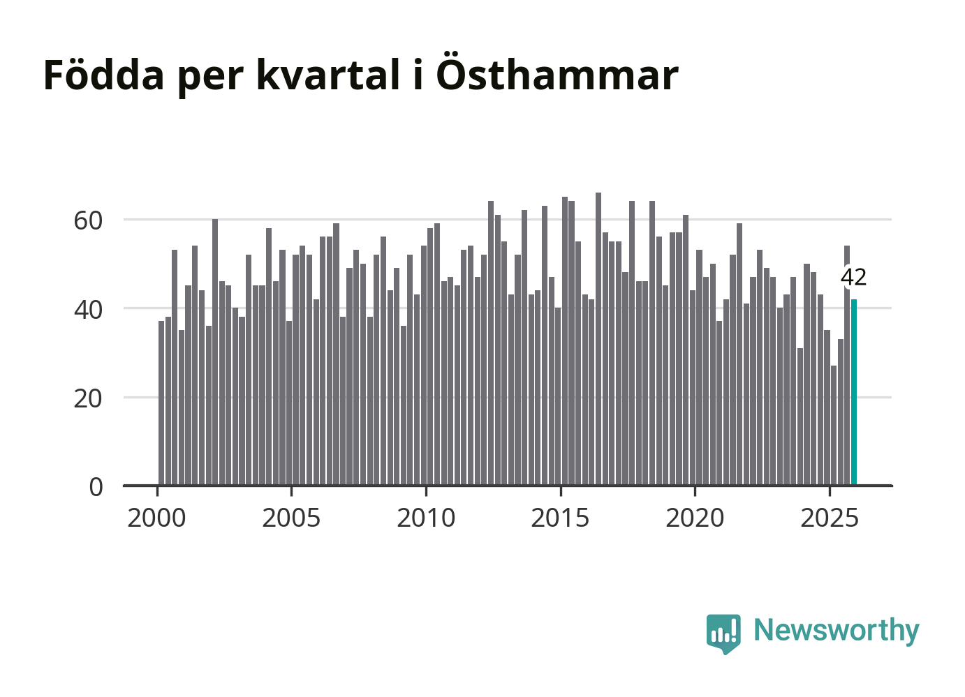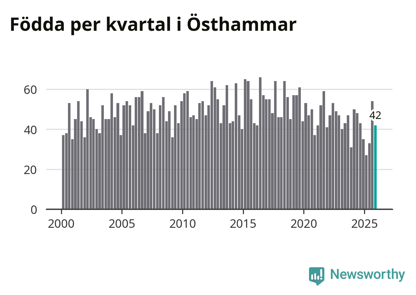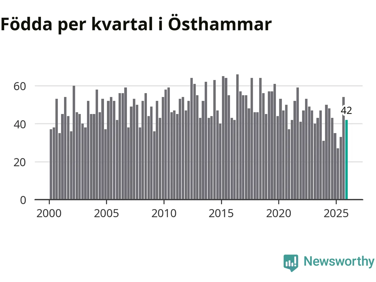 Enligt SCB:s siffror föddes 42 barn i Östhammar under det senaste kvartalet. Samtidigt avled 73 personer. Östhammar hade alltså ett negativt födelsenetto, vilket kommunen historiskt sett nästan alltid har haft.