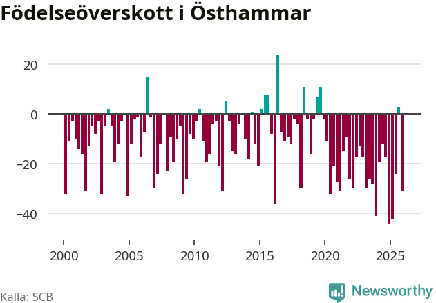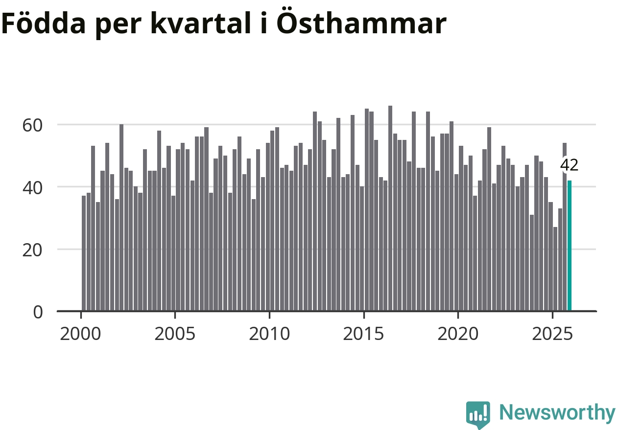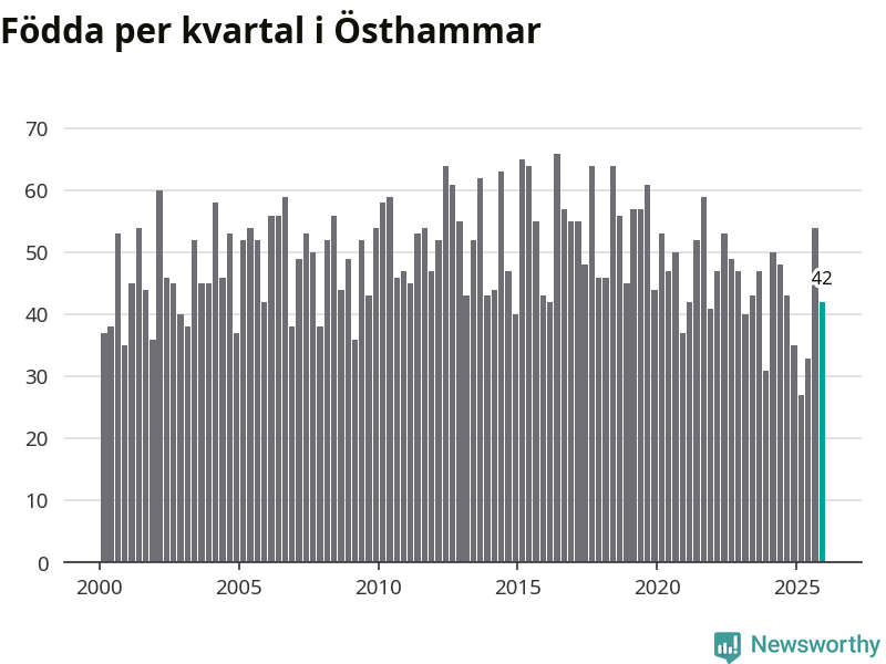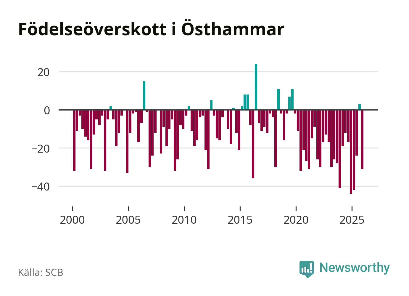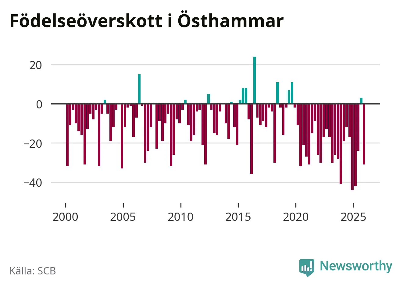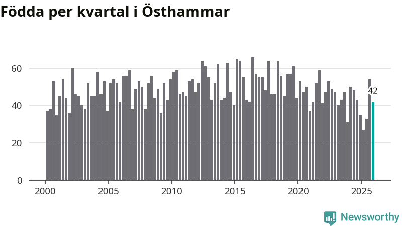 Enligt SCB:s siffror föddes 42 barn i Östhammar under det senaste kvartalet. Samtidigt avled 73 personer. Östhammar hade alltså ett negativt födelsenetto, vilket kommunen historiskt sett nästan alltid har haft.