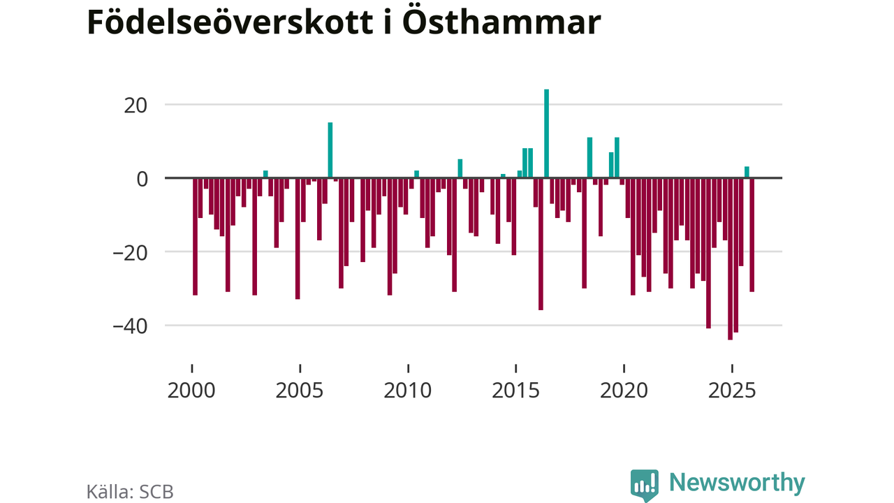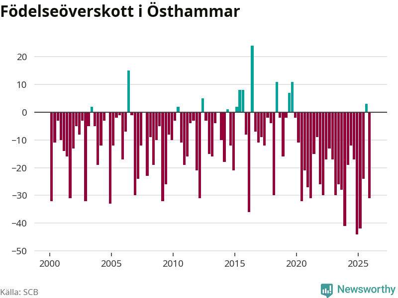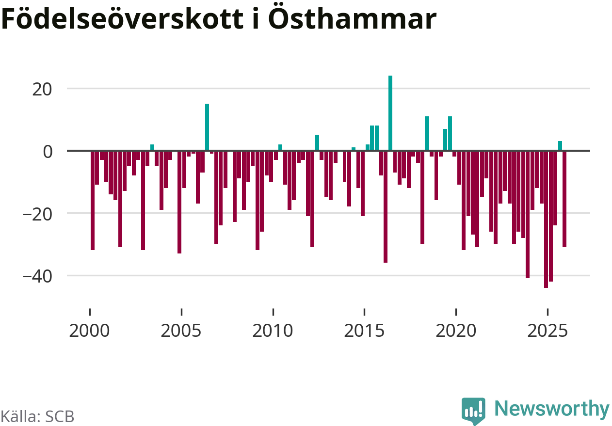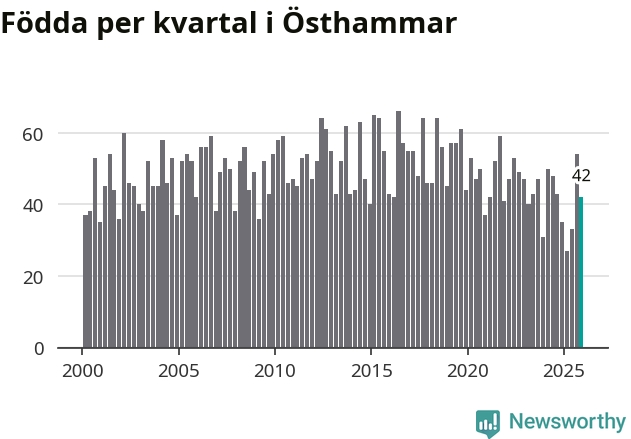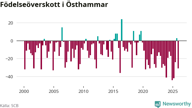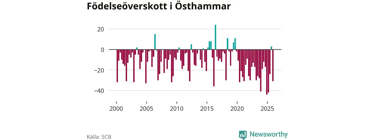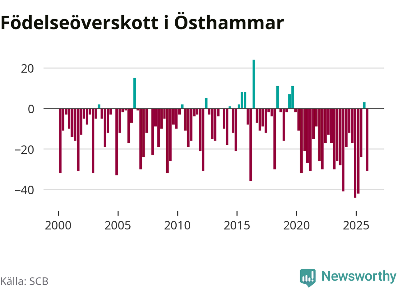 Enligt SCB:s siffror föddes 42 barn i Östhammar under det senaste kvartalet. Samtidigt avled 73 personer. Östhammar hade alltså ett negativt födelsenetto, vilket kommunen historiskt sett nästan alltid har haft.