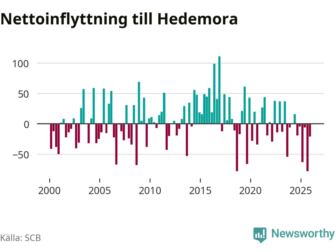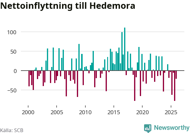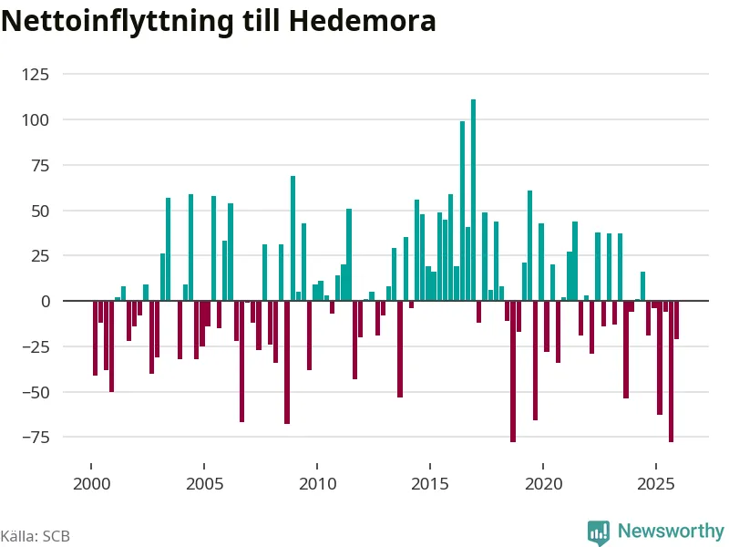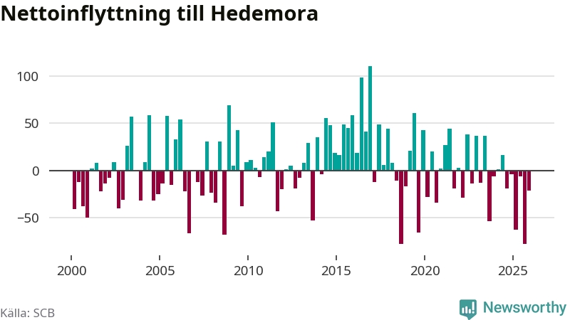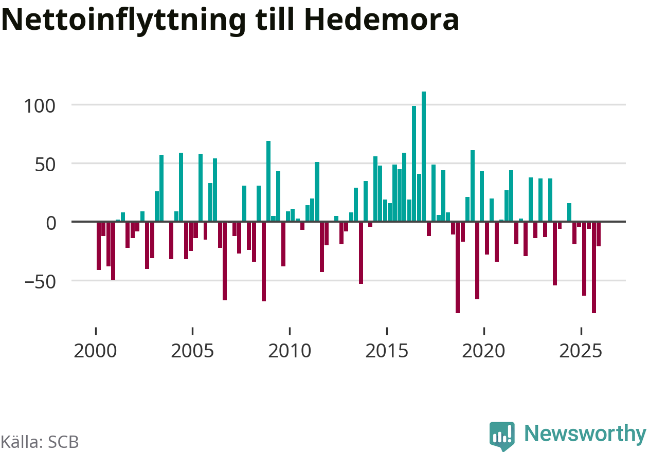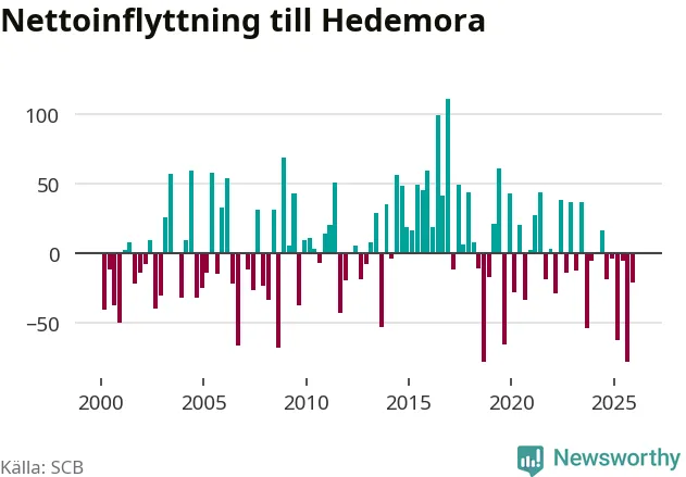 Under fjärde kvartalet 2025 flyttade 135 personer till kommunen medan 156 personer flyttade därifrån. Sedan seklets början har Hedemora haft ungefär lika många kvartal med positivt flyttnetto som negativt.