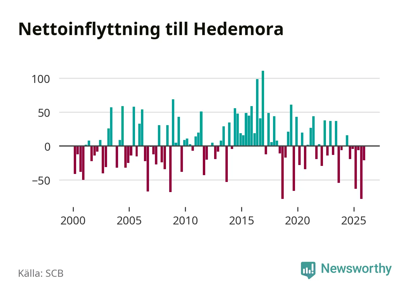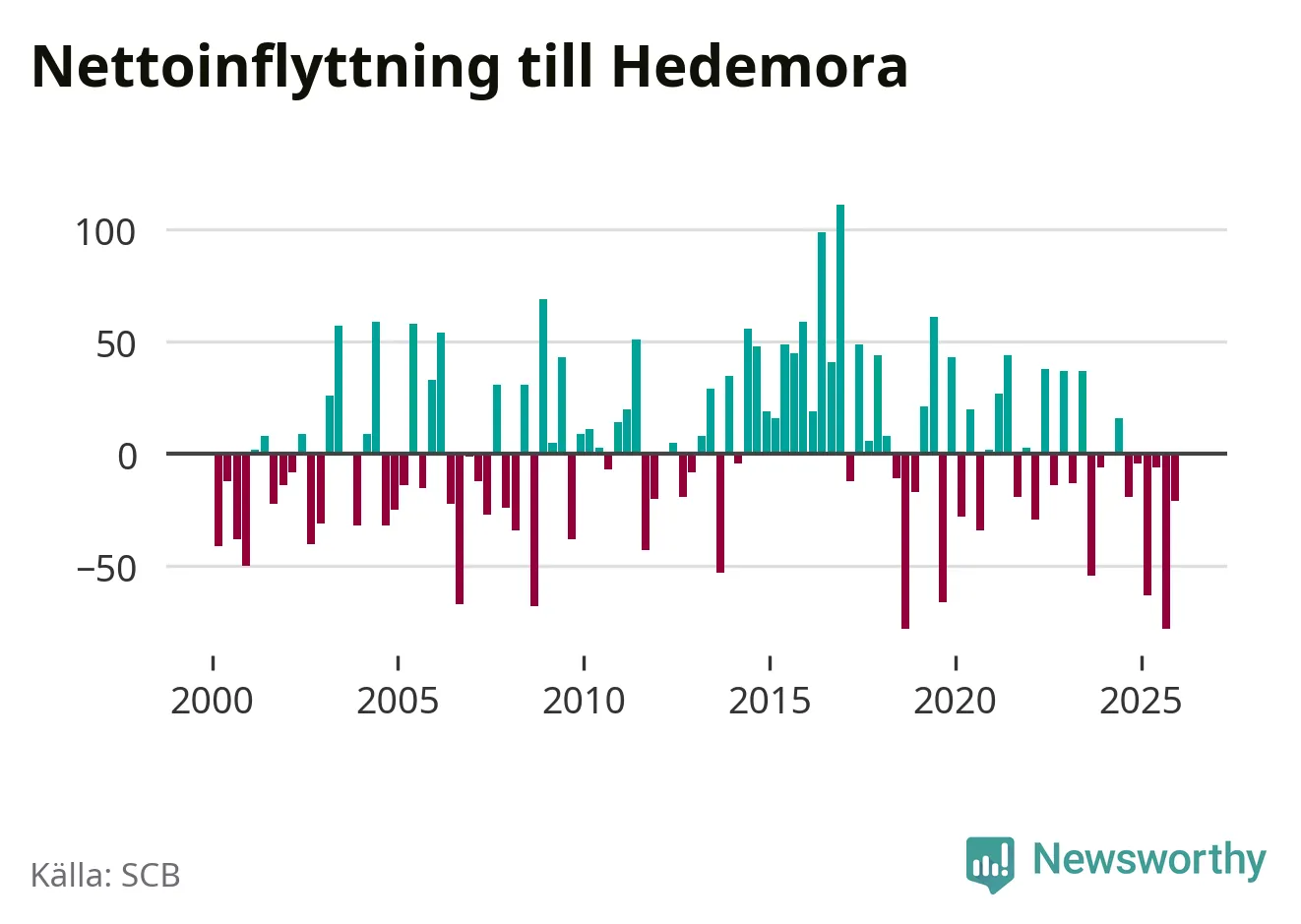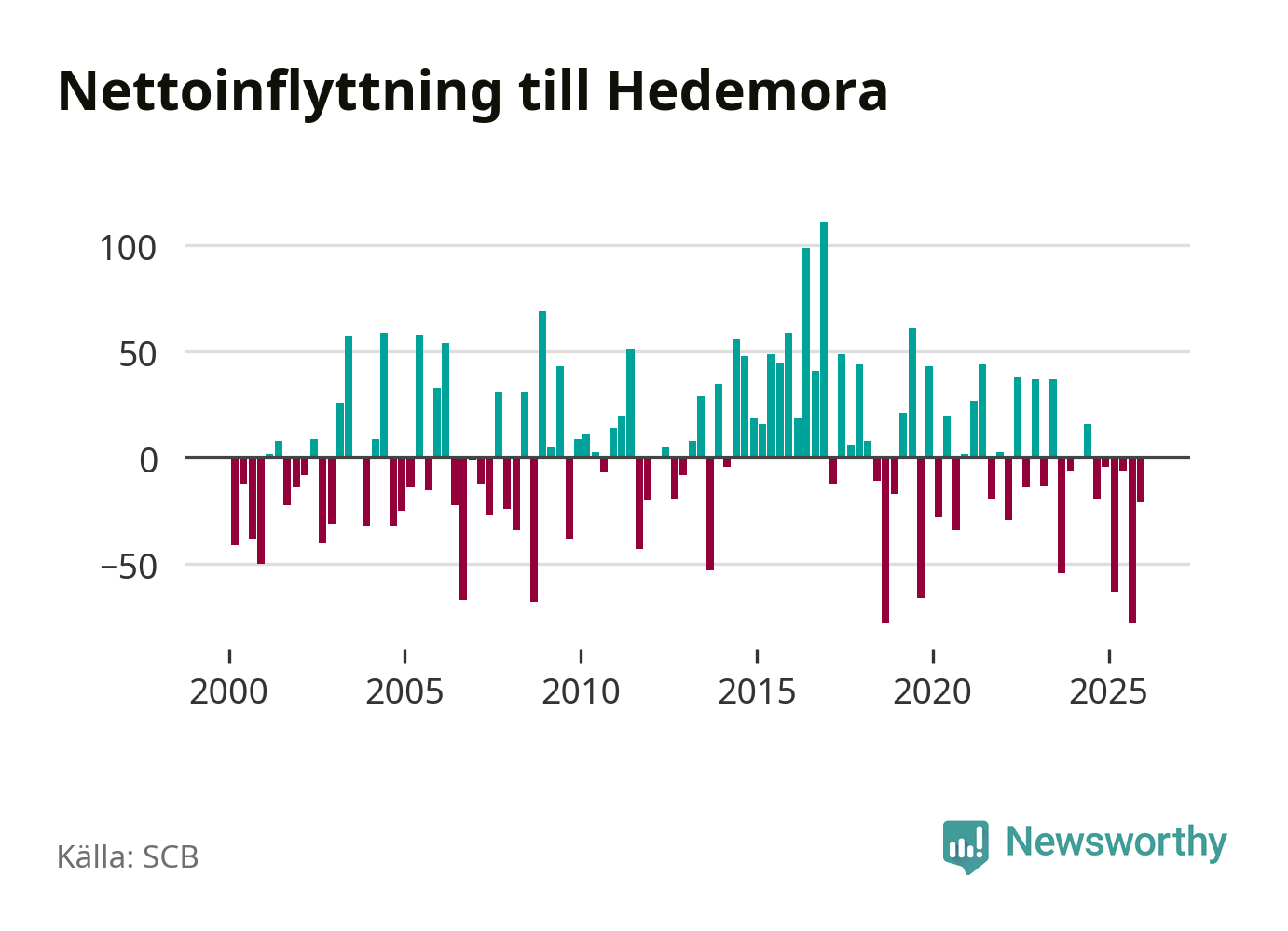 Under fjärde kvartalet 2025 flyttade 135 personer till kommunen medan 156 personer flyttade därifrån. Sedan seklets början har Hedemora haft ungefär lika många kvartal med positivt flyttnetto som negativt.