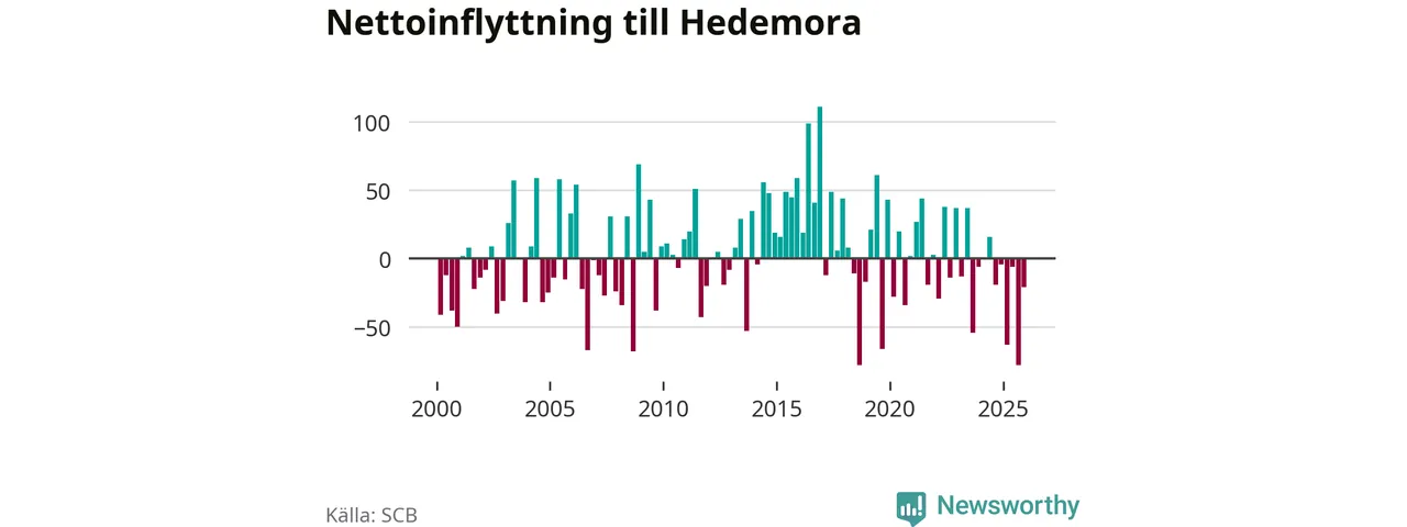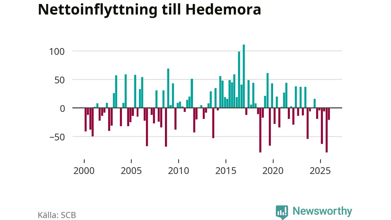 Hedemora kommun tappade 40 invånare under fjärde kvartalet 2025. Det är den största procentuella minskningen i Dalarna, visar SCB:s senaste befolkningsstatistik.