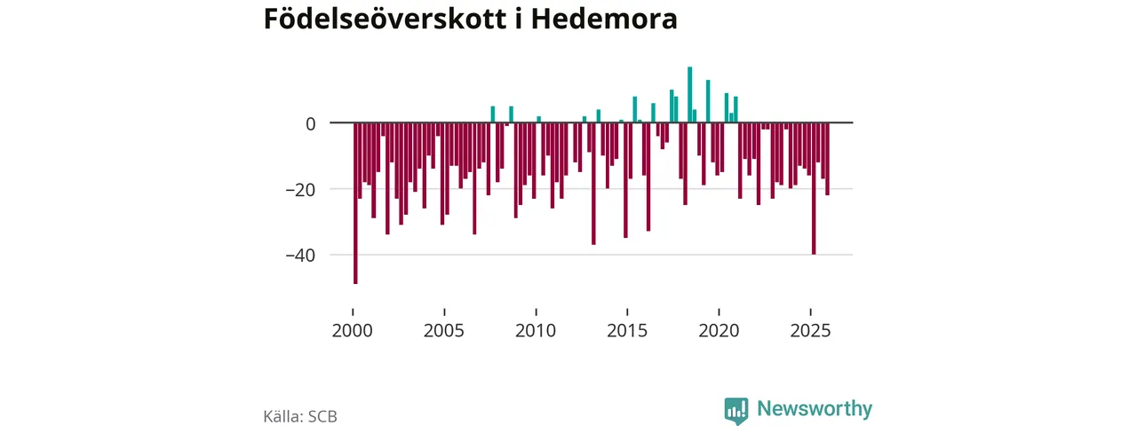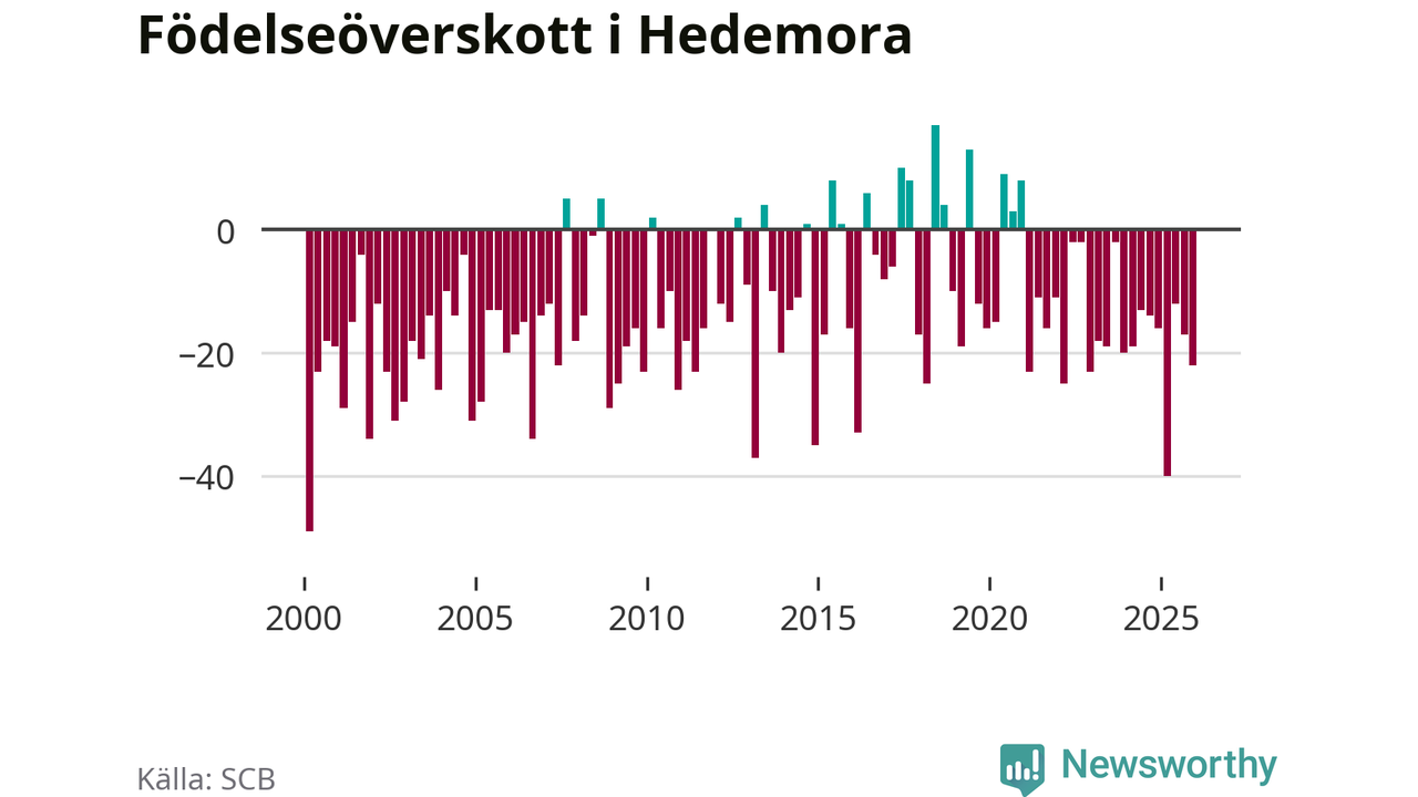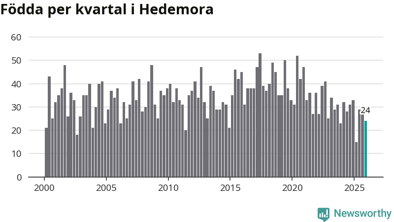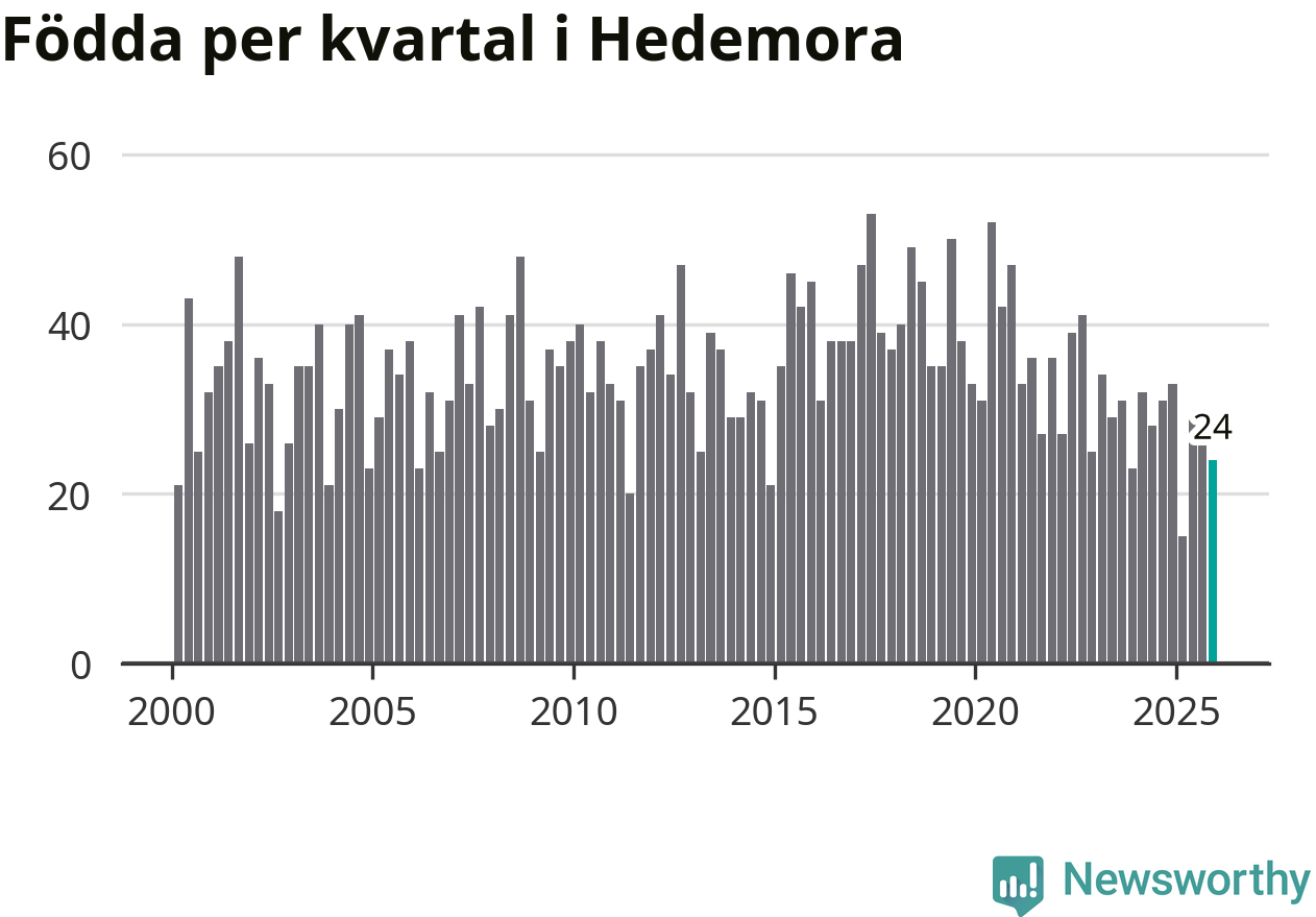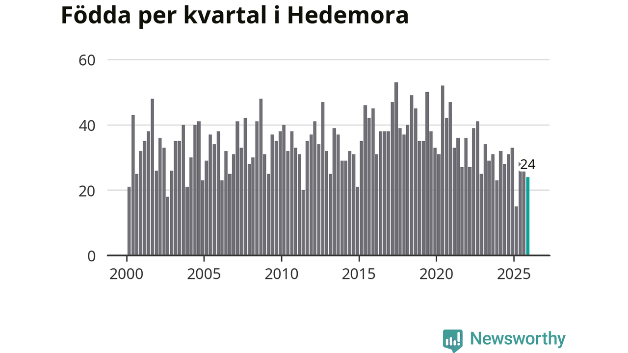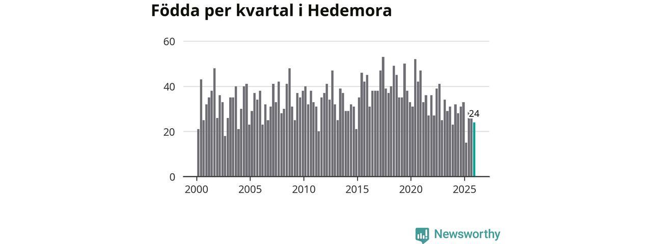 Enligt SCB:s siffror föddes 24 barn i Hedemora under det senaste kvartalet. Samtidigt avled 46 personer. Hedemora hade alltså ett negativt födelsenetto, vilket kommunen historiskt sett oftast har haft.