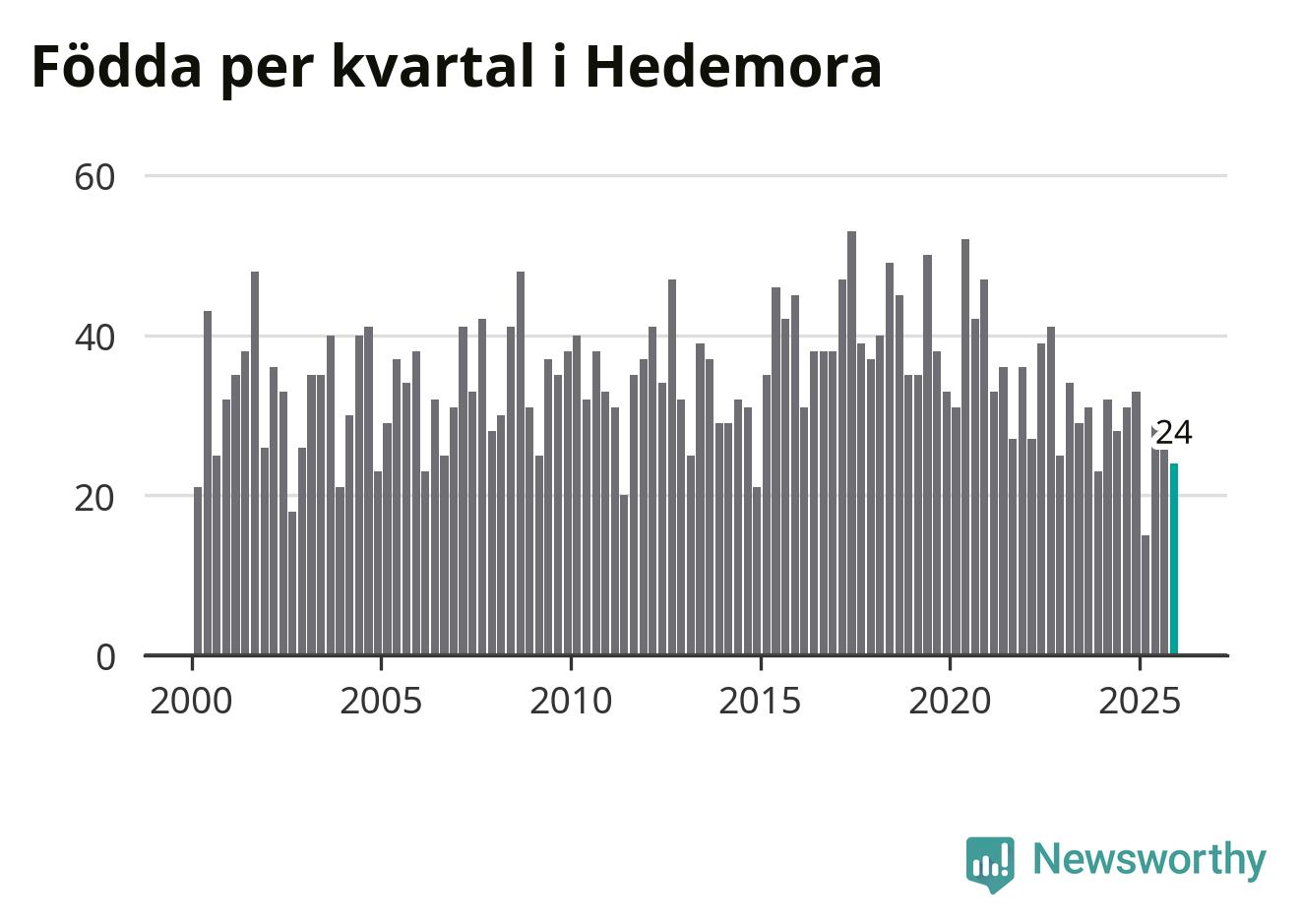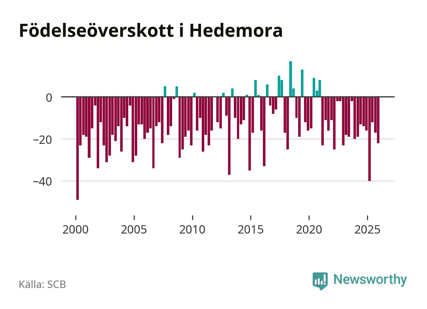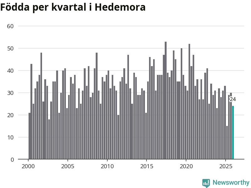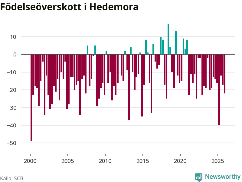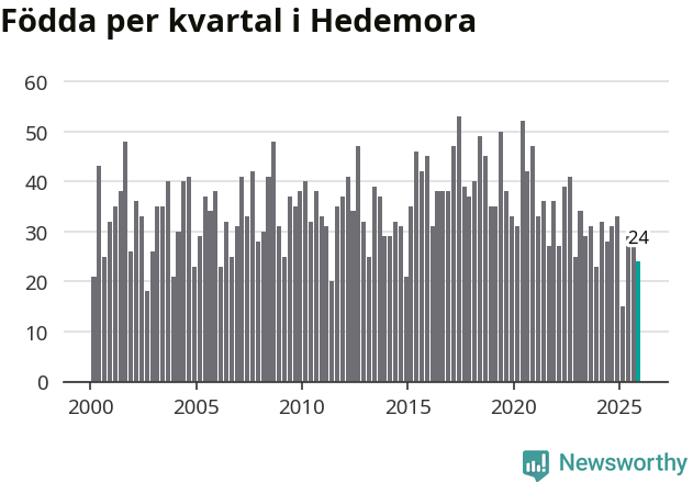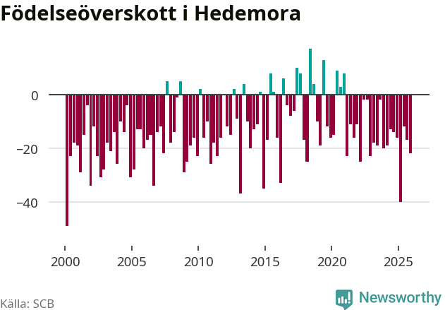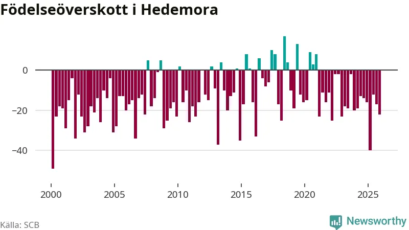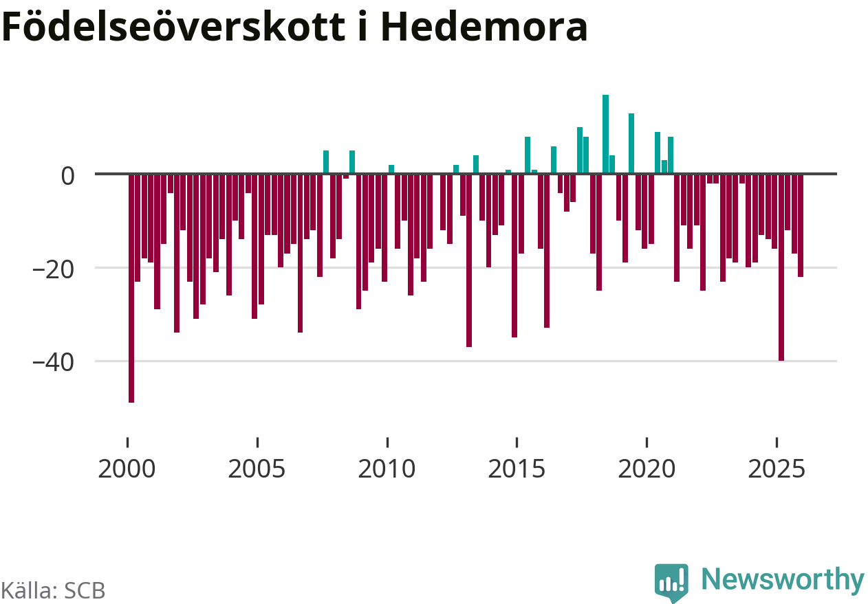 Enligt SCB:s siffror föddes 24 barn i Hedemora under det senaste kvartalet. Samtidigt avled 46 personer. Hedemora hade alltså ett negativt födelsenetto, vilket kommunen historiskt sett oftast har haft.