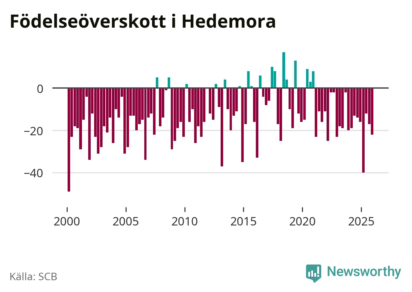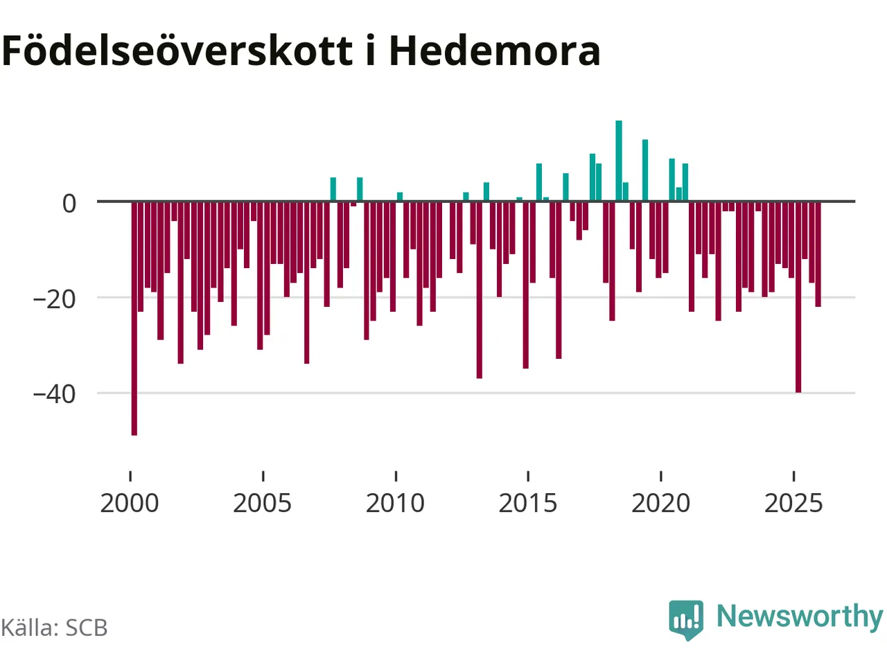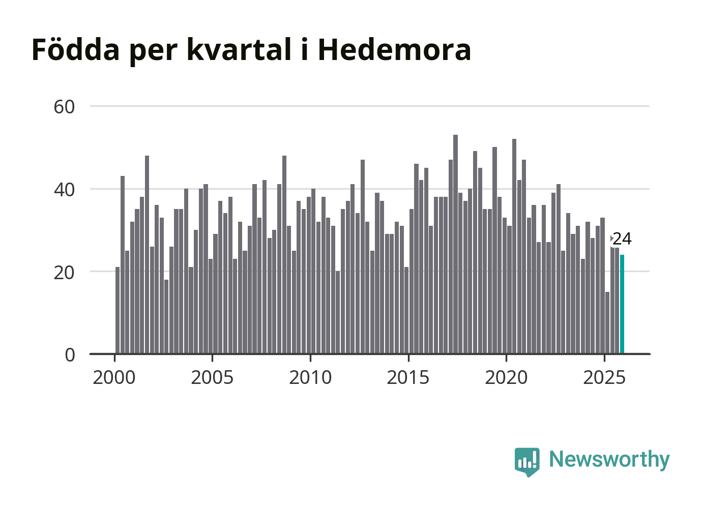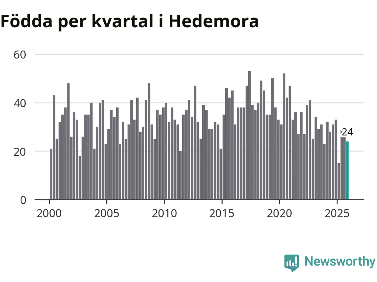 Enligt SCB:s siffror föddes 24 barn i Hedemora under det senaste kvartalet. Samtidigt avled 46 personer. Hedemora hade alltså ett negativt födelsenetto, vilket kommunen historiskt sett oftast har haft.