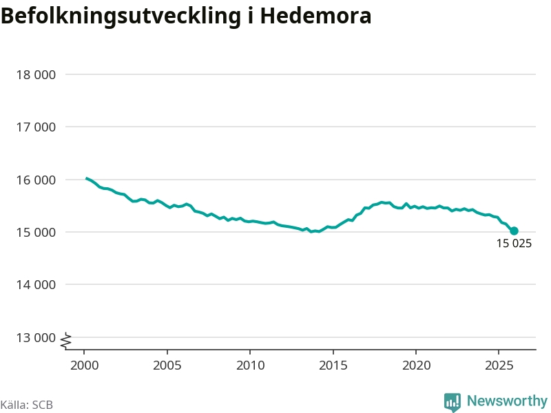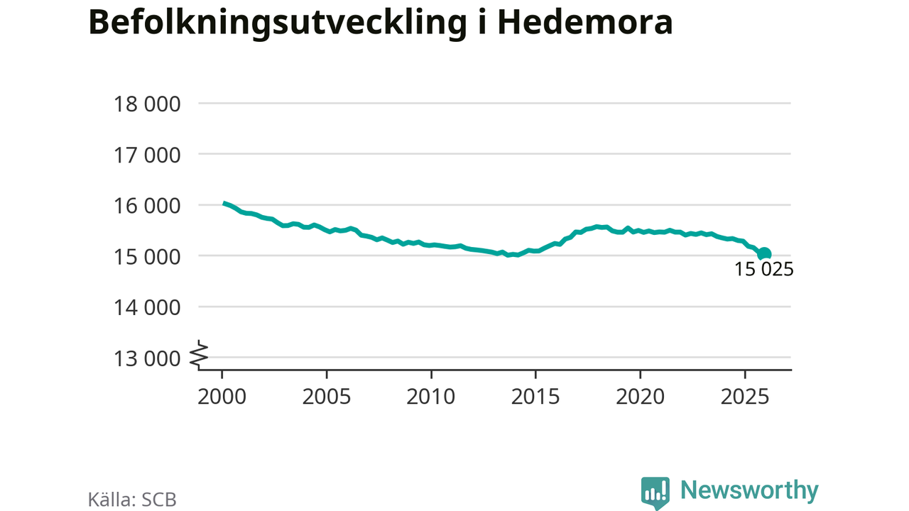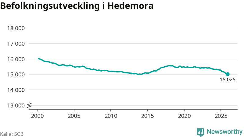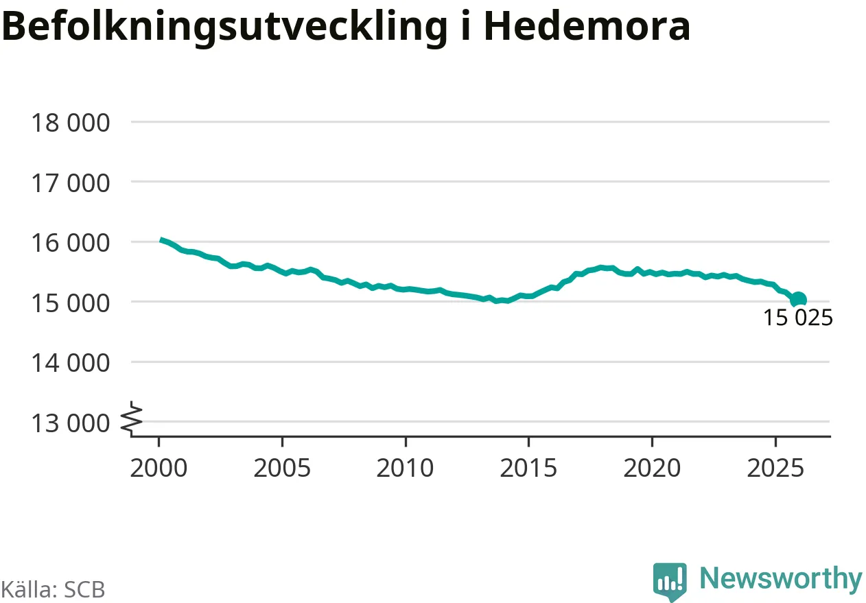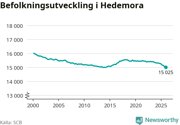Jämfört med för ett år sedan har befolkningen i Hedemora minskat med ungefär 260 personer – vilket motsvarar en nedgång på 1,7 procent. Sedan millennieskiftet har folkmängden minskat med runt 990 personer, eller sex procent.