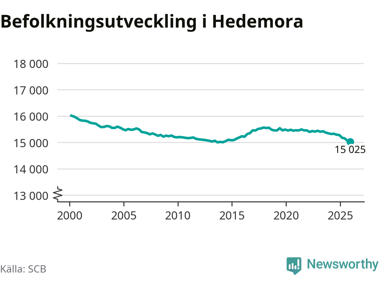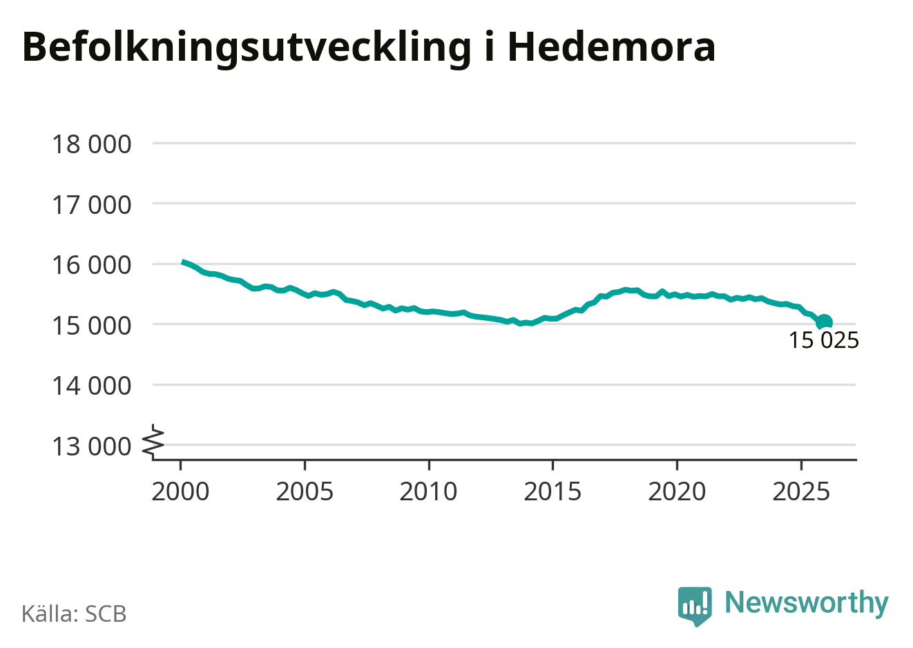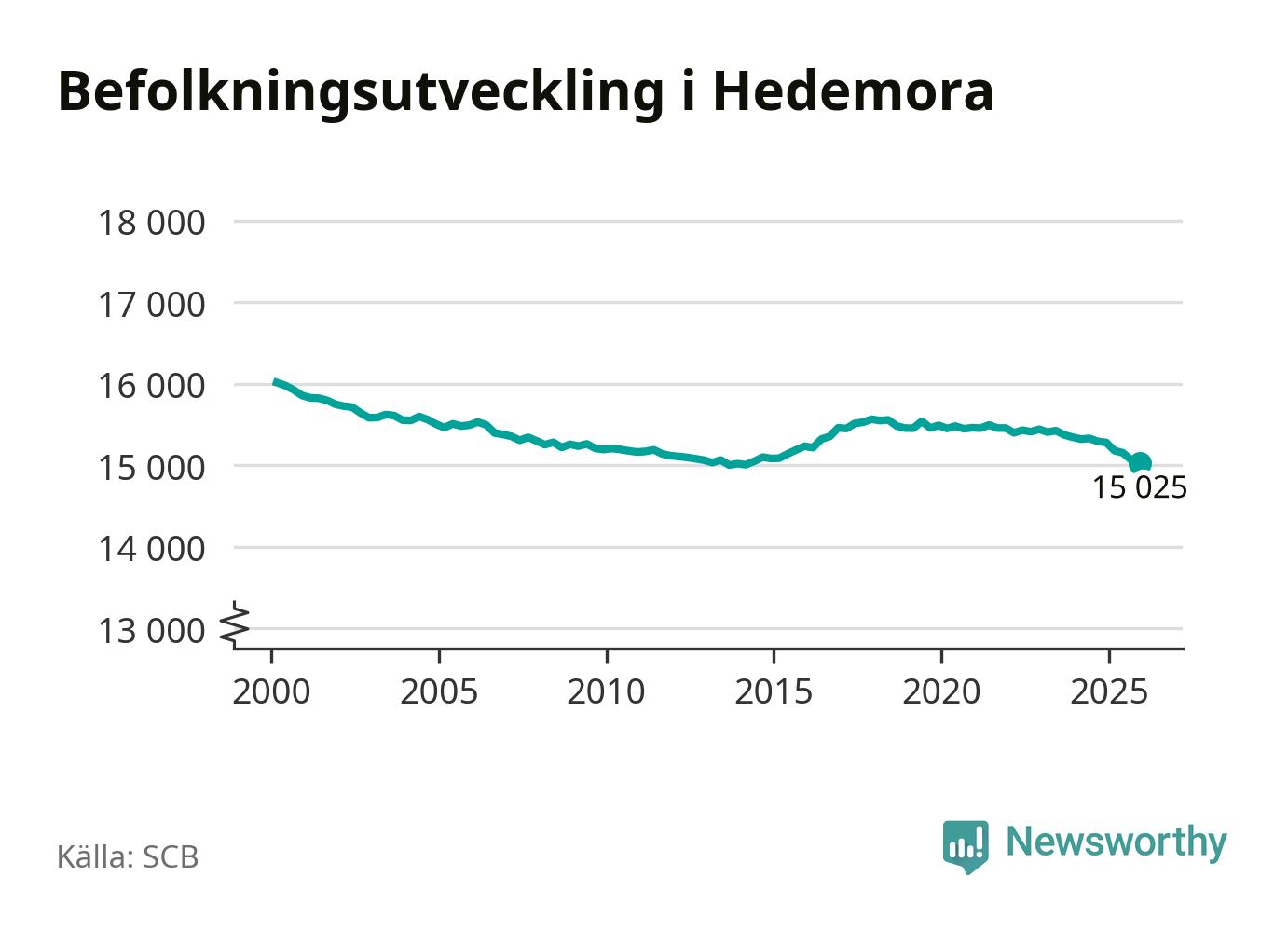 Jämfört med för ett år sedan har befolkningen i Hedemora minskat med ungefär 260 personer – vilket motsvarar en nedgång på 1,7 procent. Sedan millennieskiftet har folkmängden minskat med runt 990 personer, eller sex procent.