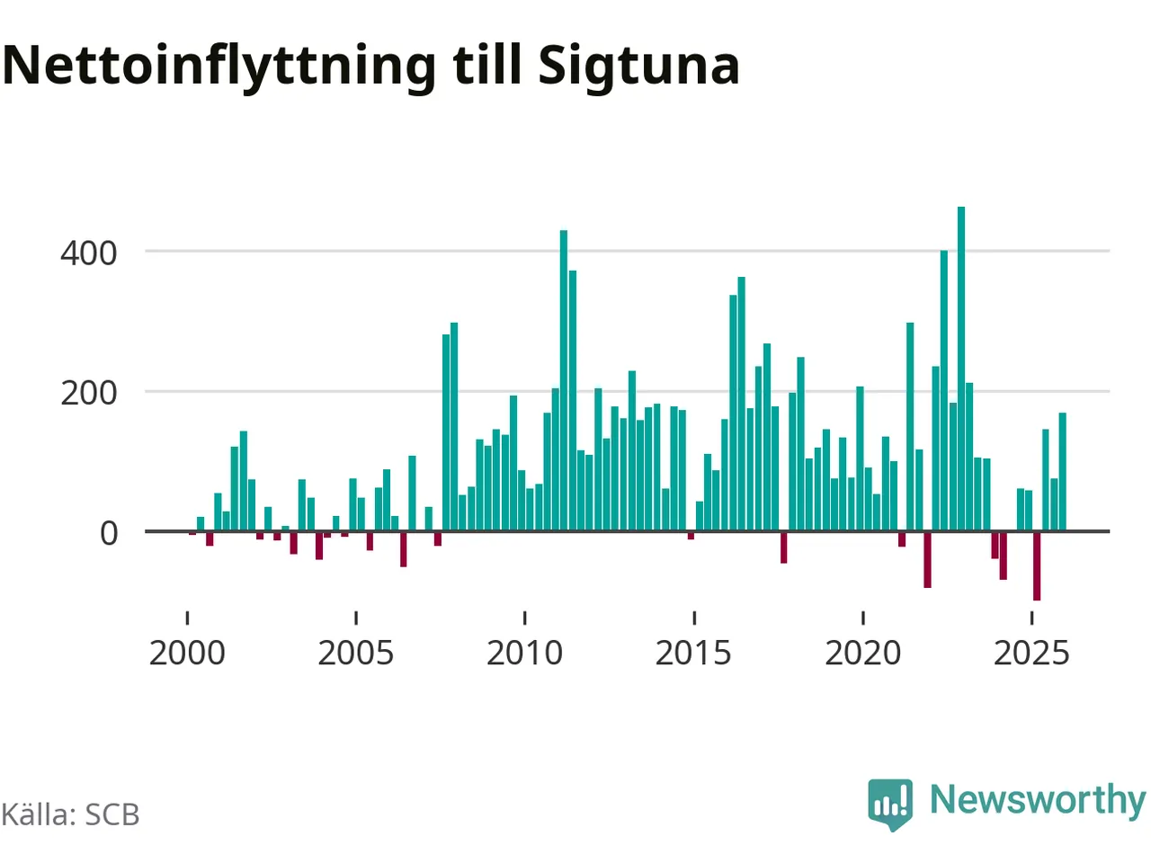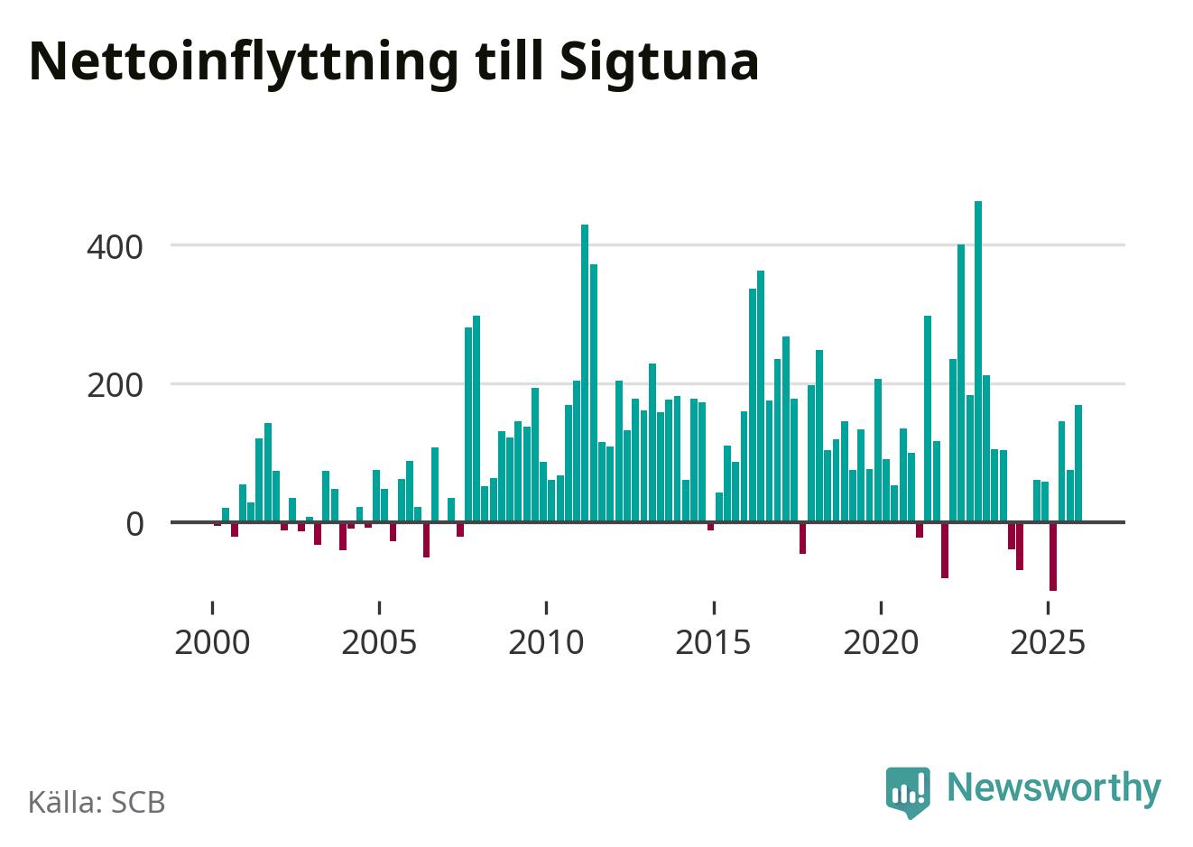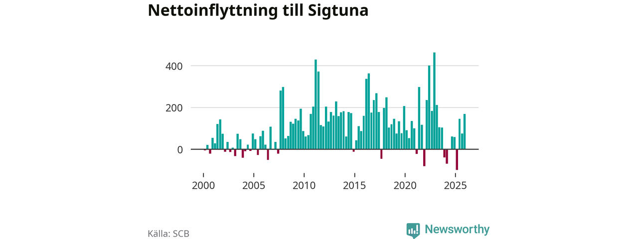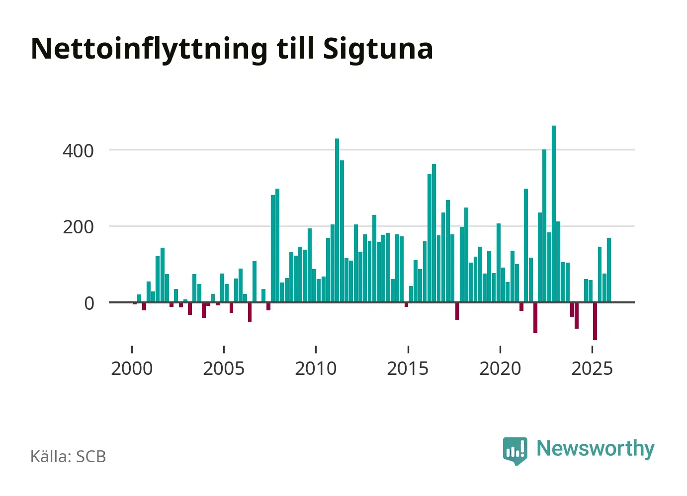 Under fjärde kvartalet 2025 flyttade 1 240 personer till kommunen medan 1 071 personer flyttade därifrån. Sedan seklets början har Sigtuna haft ett positivt flyttnetto under nästan alla kvartal, inklusive det senaste kvartalet.