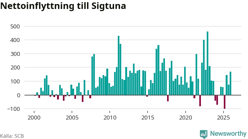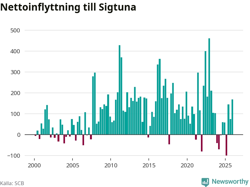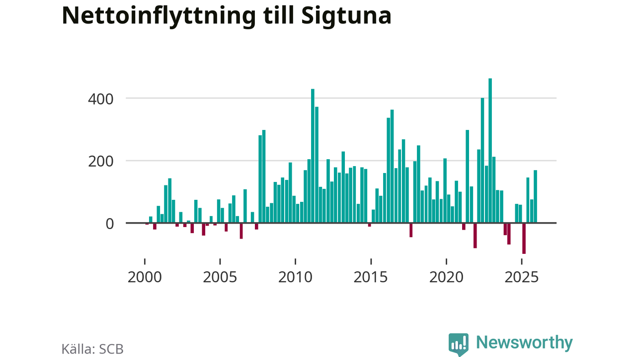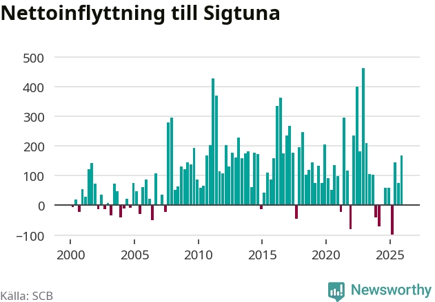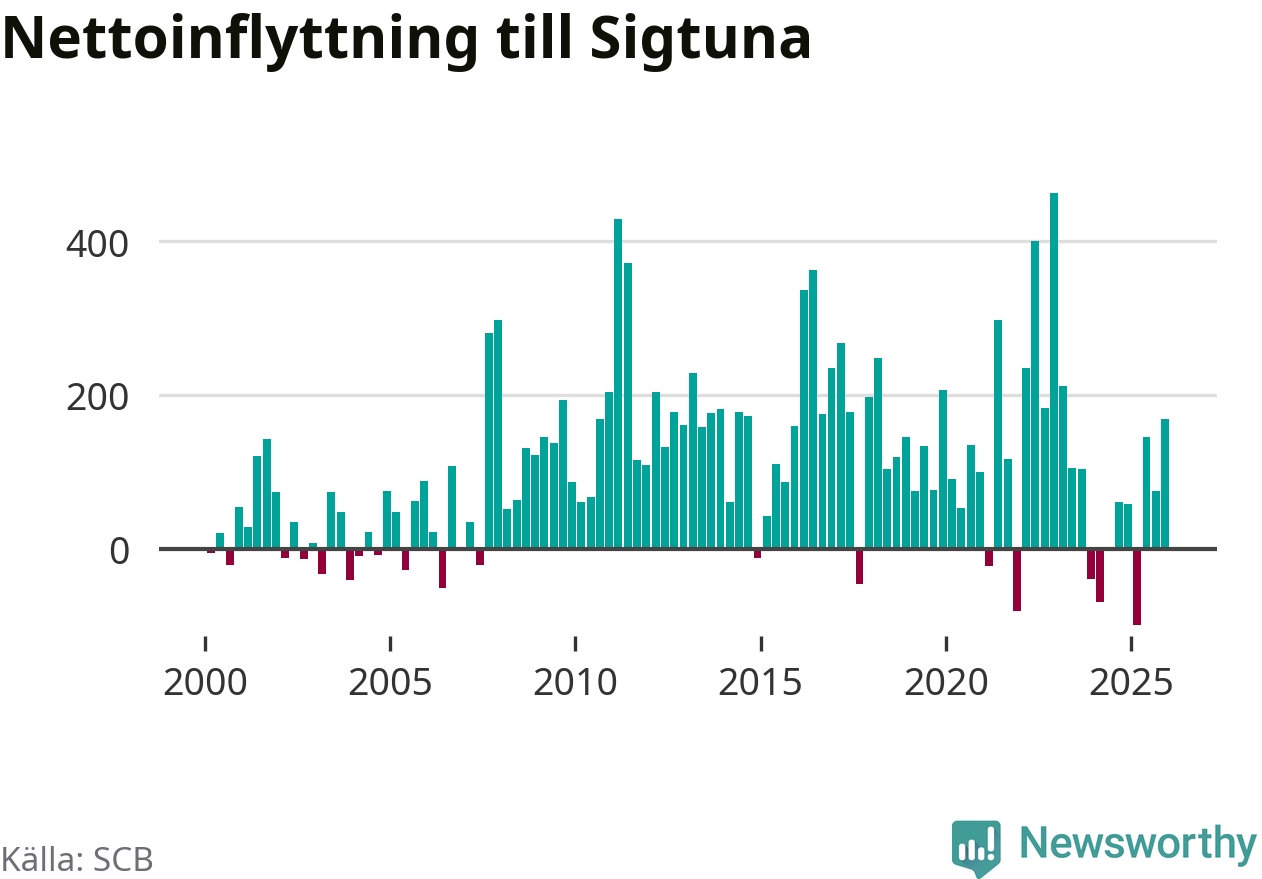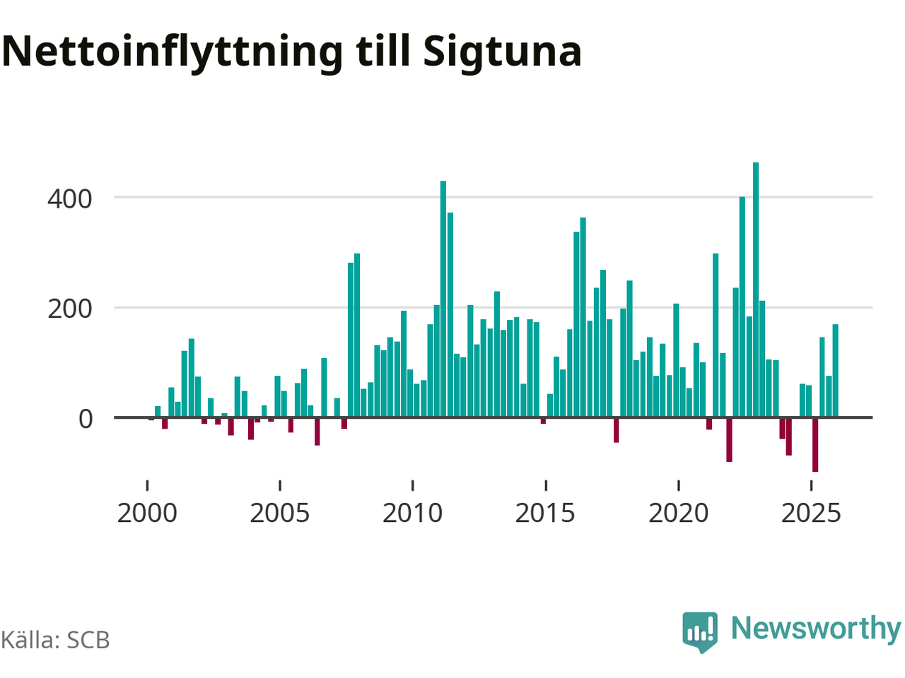 Under fjärde kvartalet 2025 flyttade 1 240 personer till kommunen medan 1 071 personer flyttade därifrån. Sedan seklets början har Sigtuna haft ett positivt flyttnetto under nästan alla kvartal, inklusive det senaste kvartalet.