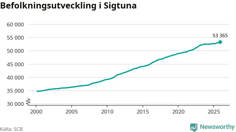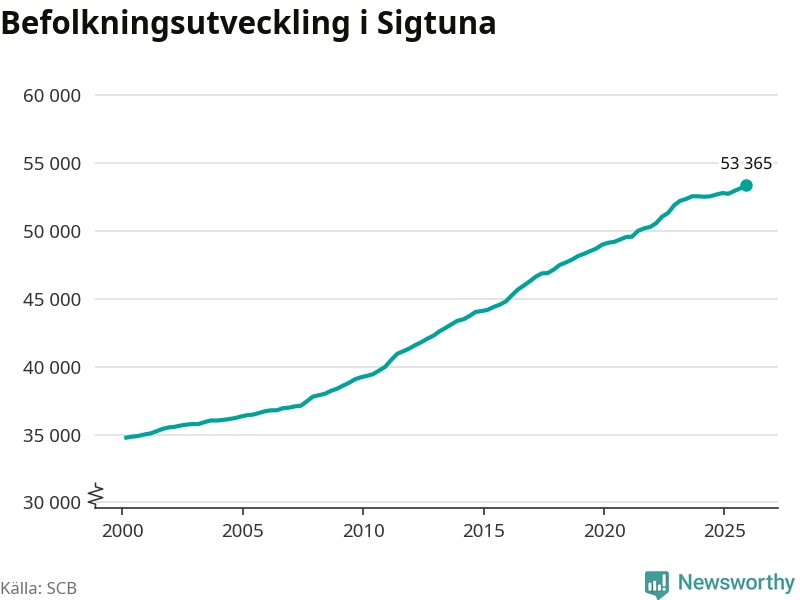 Jämfört med för ett år sedan har befolkningen i Sigtuna ökat med ungefär 600 personer – vilket motsvarar en ökning på 1,1 procent. Sedan millennieskiftet har folkmängden ökat med runt 18 590 personer, eller 54 procent.